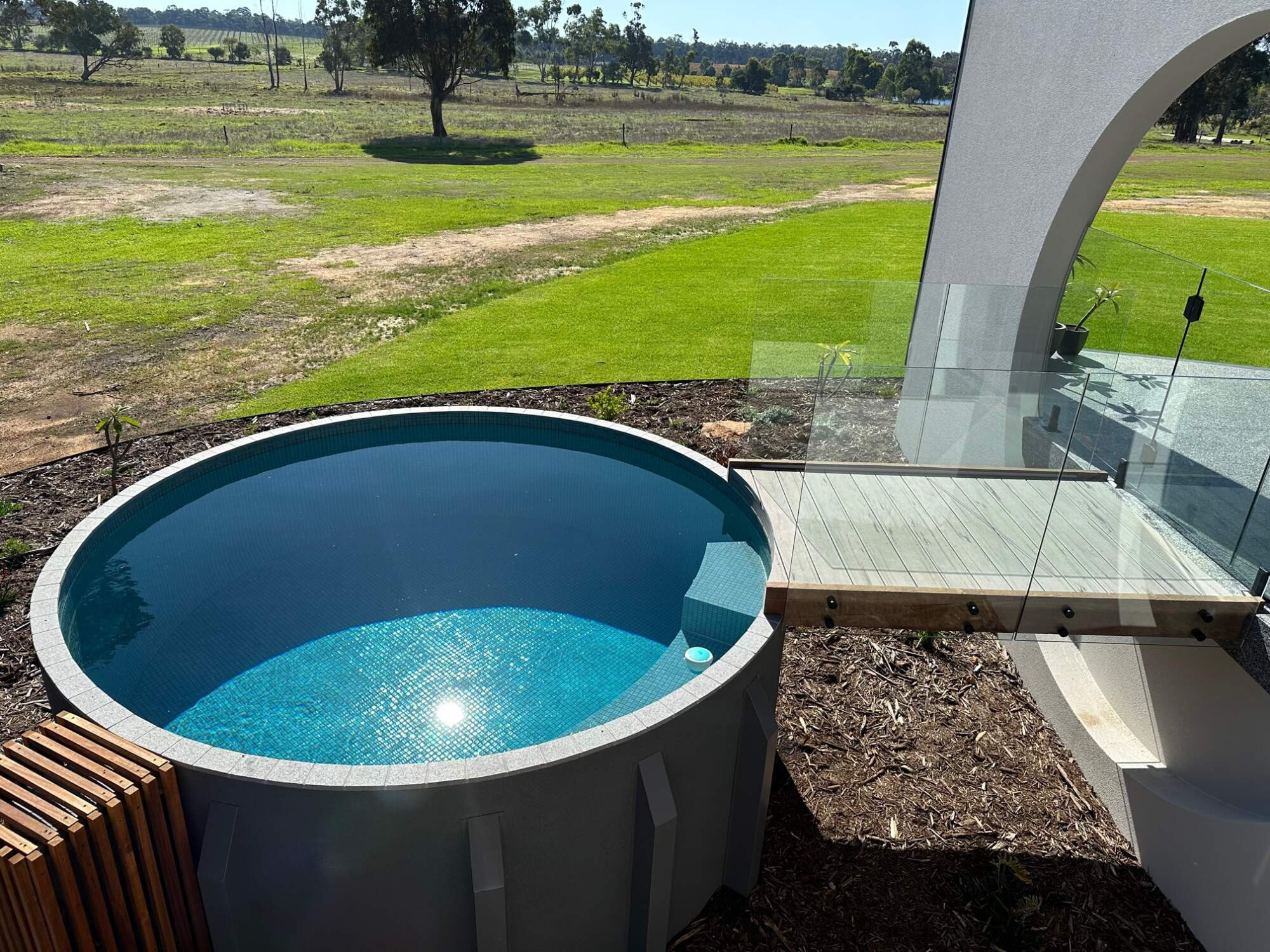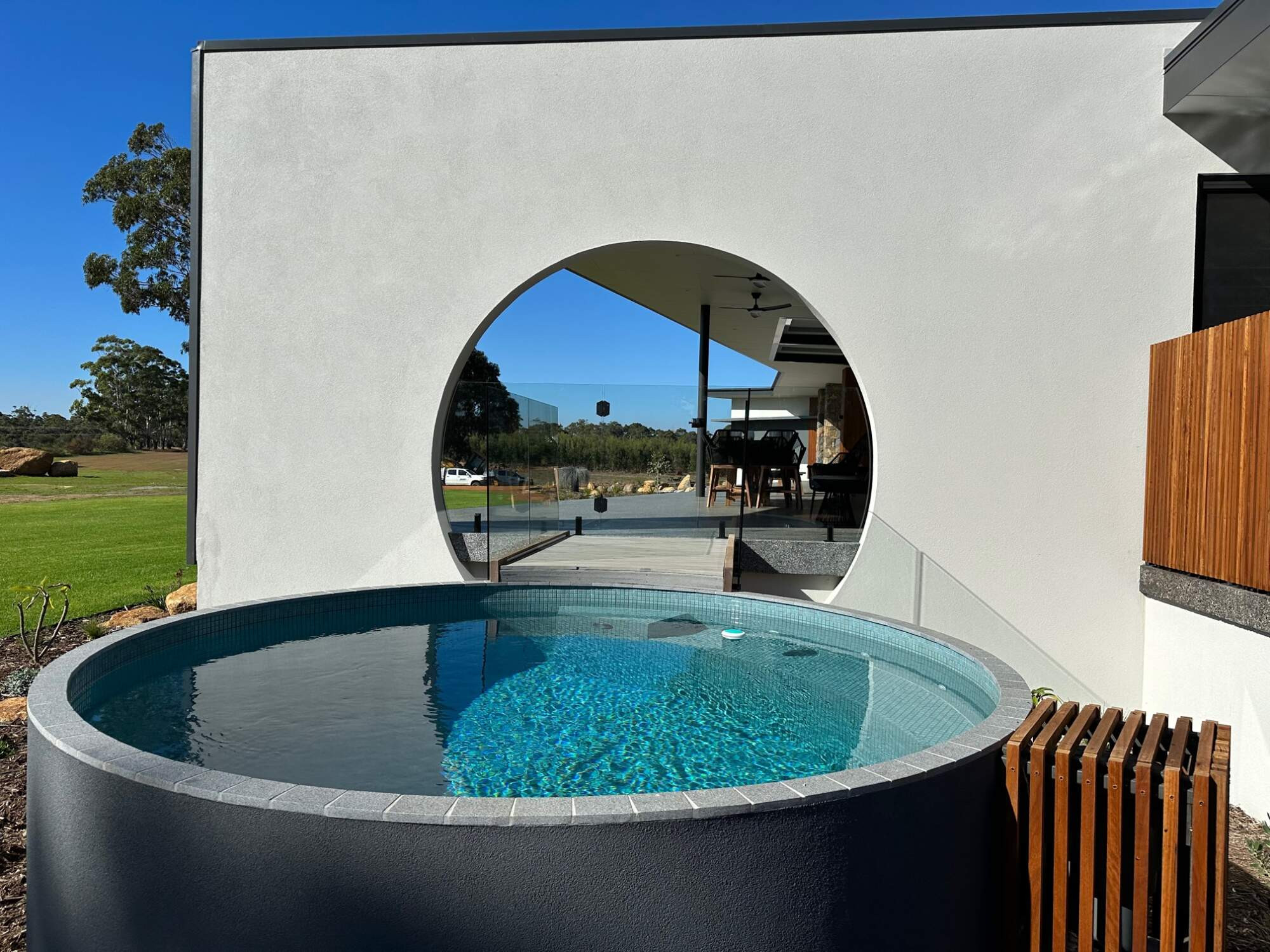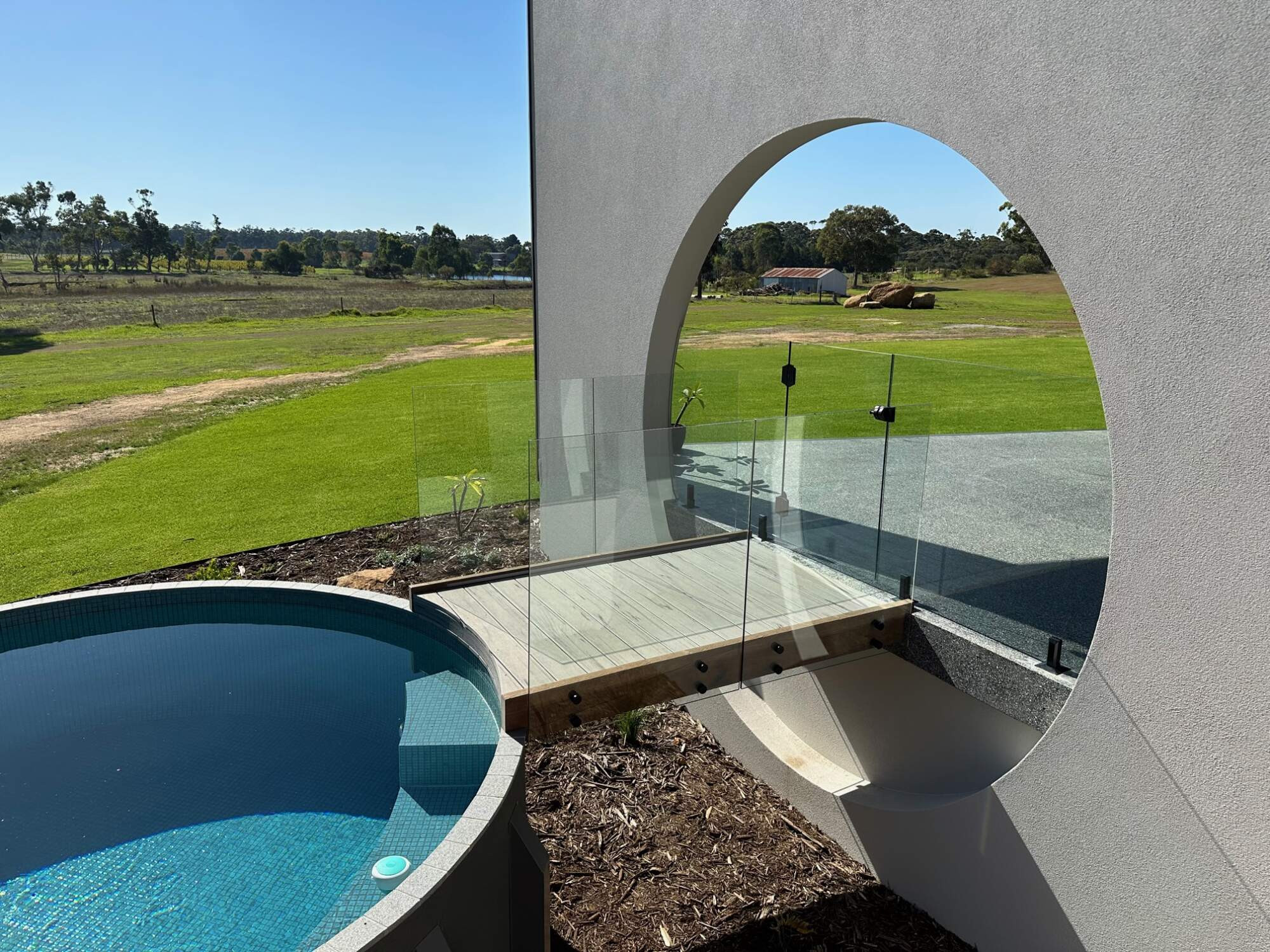 This pool design was chosen to replicate the circular opening in the wall coming off the alfresco, and positioned to take advantage of the farm views.