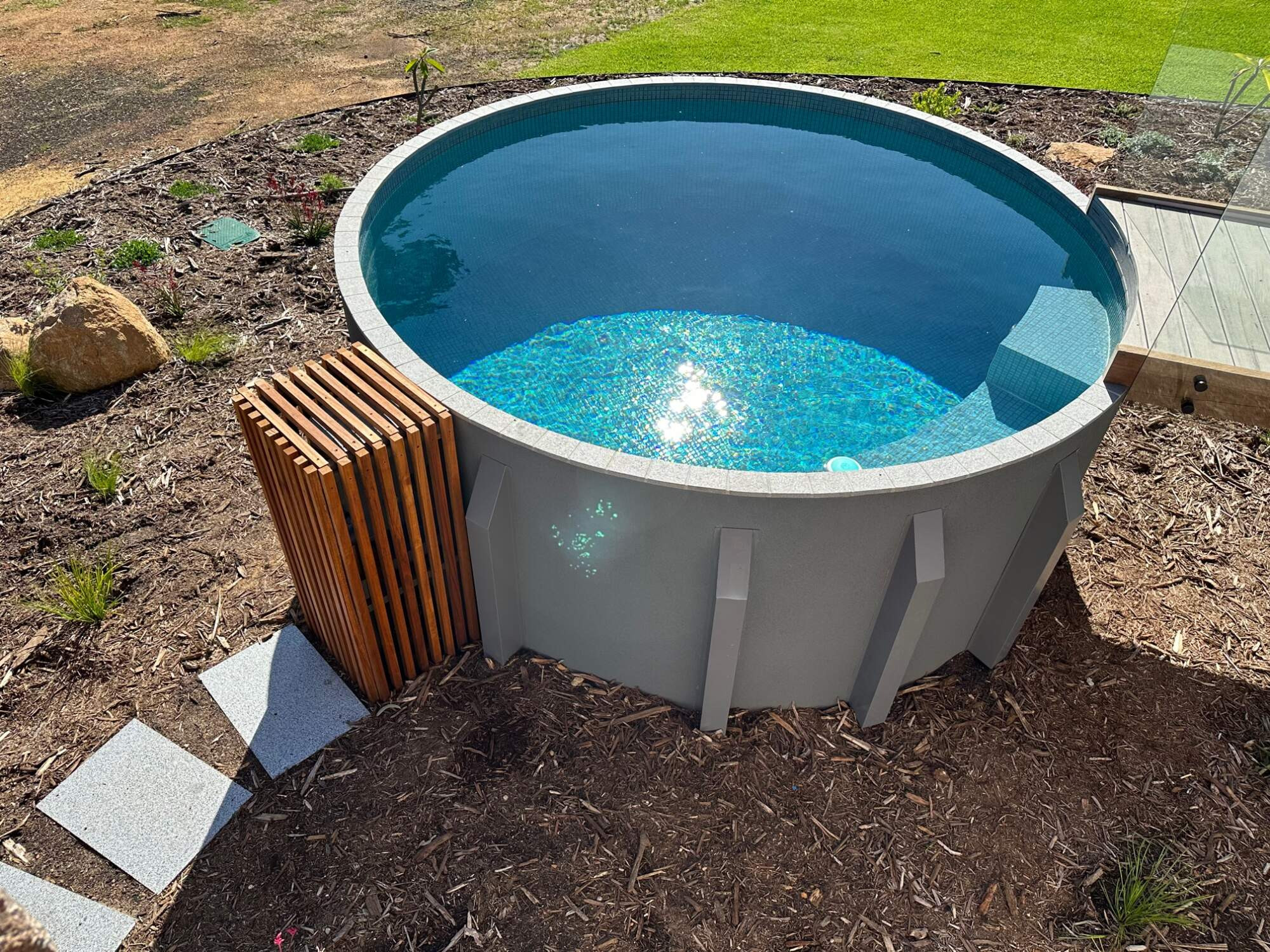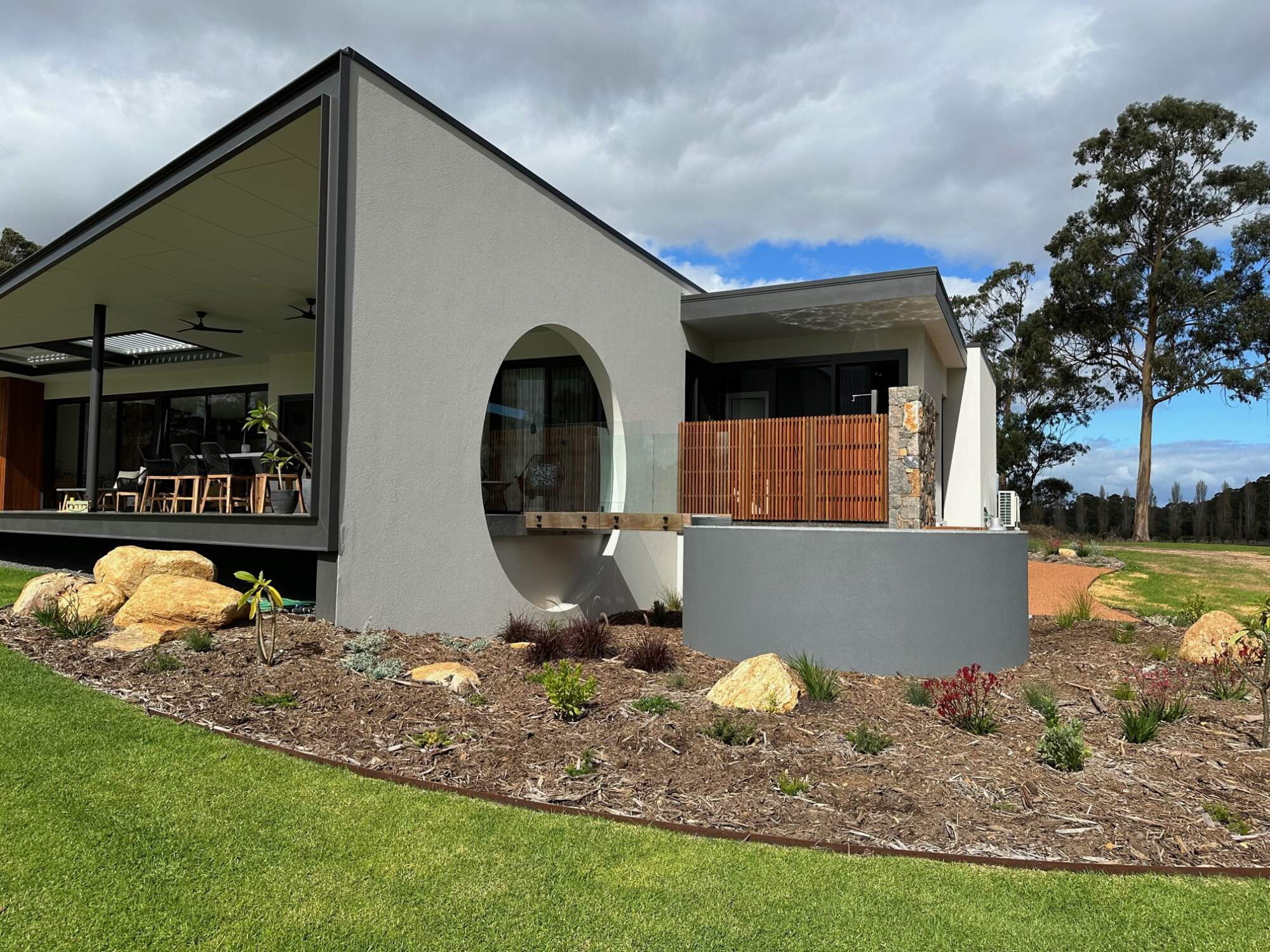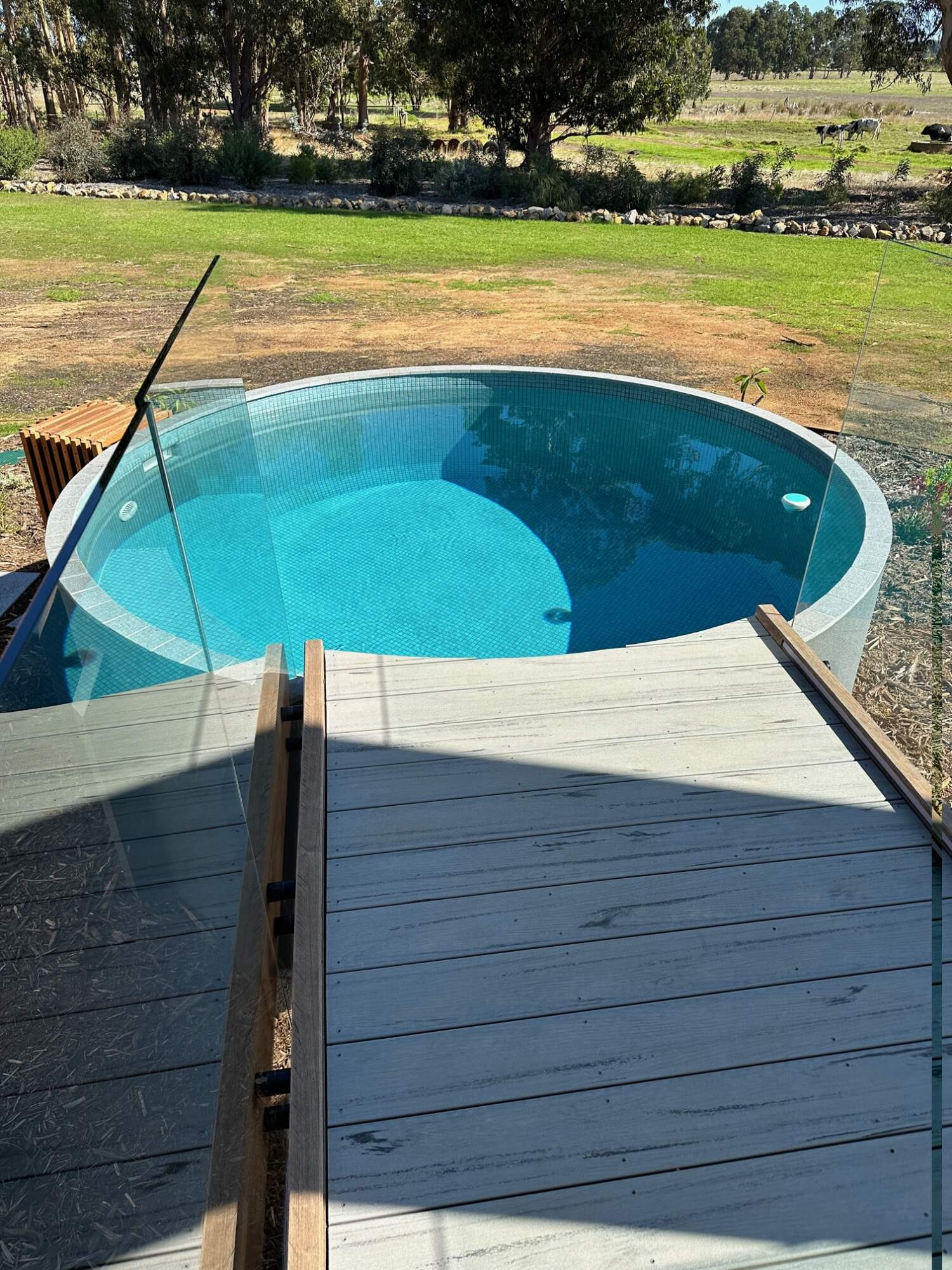 This pool design was chosen to replicate the circular opening in the wall coming off the alfresco, and positioned to take advantage of the farm views.