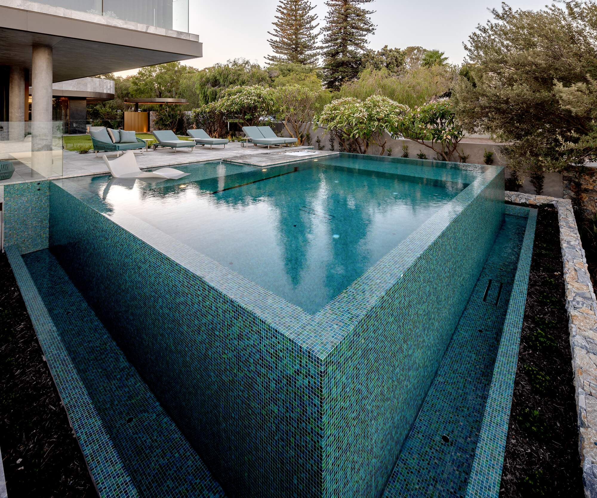 This understated, yet impressive pool, is an entertainer’s dream while also suitable for a young family. It is visually appealing from the corner block’s two street frontages, as well as the home’s many balconies and living areas. The three-sided infinity edge takes in views over the Swan River, Perth CBD and beyond. Fully controlled via the home automation system, heated year-round and self-cleaning, this beautiful pool is finished with custom blend Bisazza mosaics and white LED lighting.