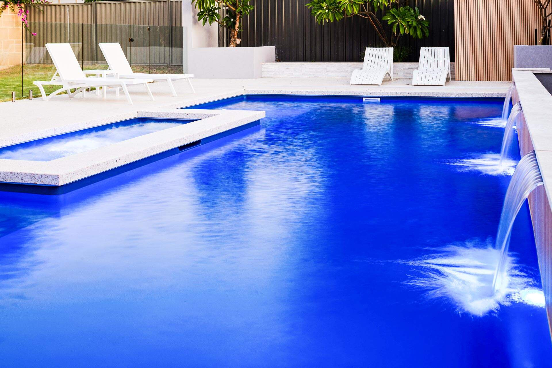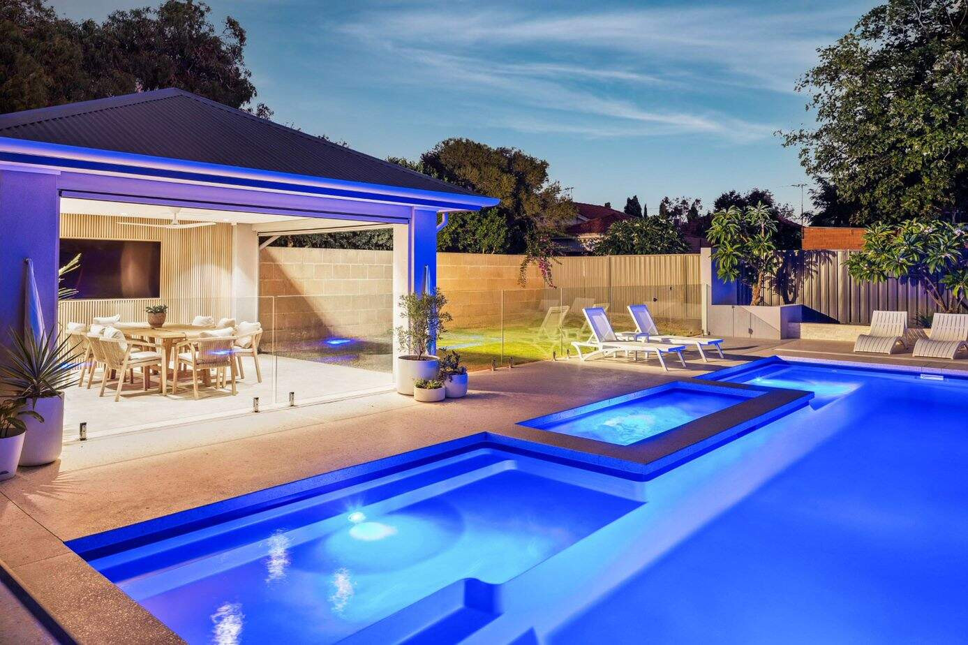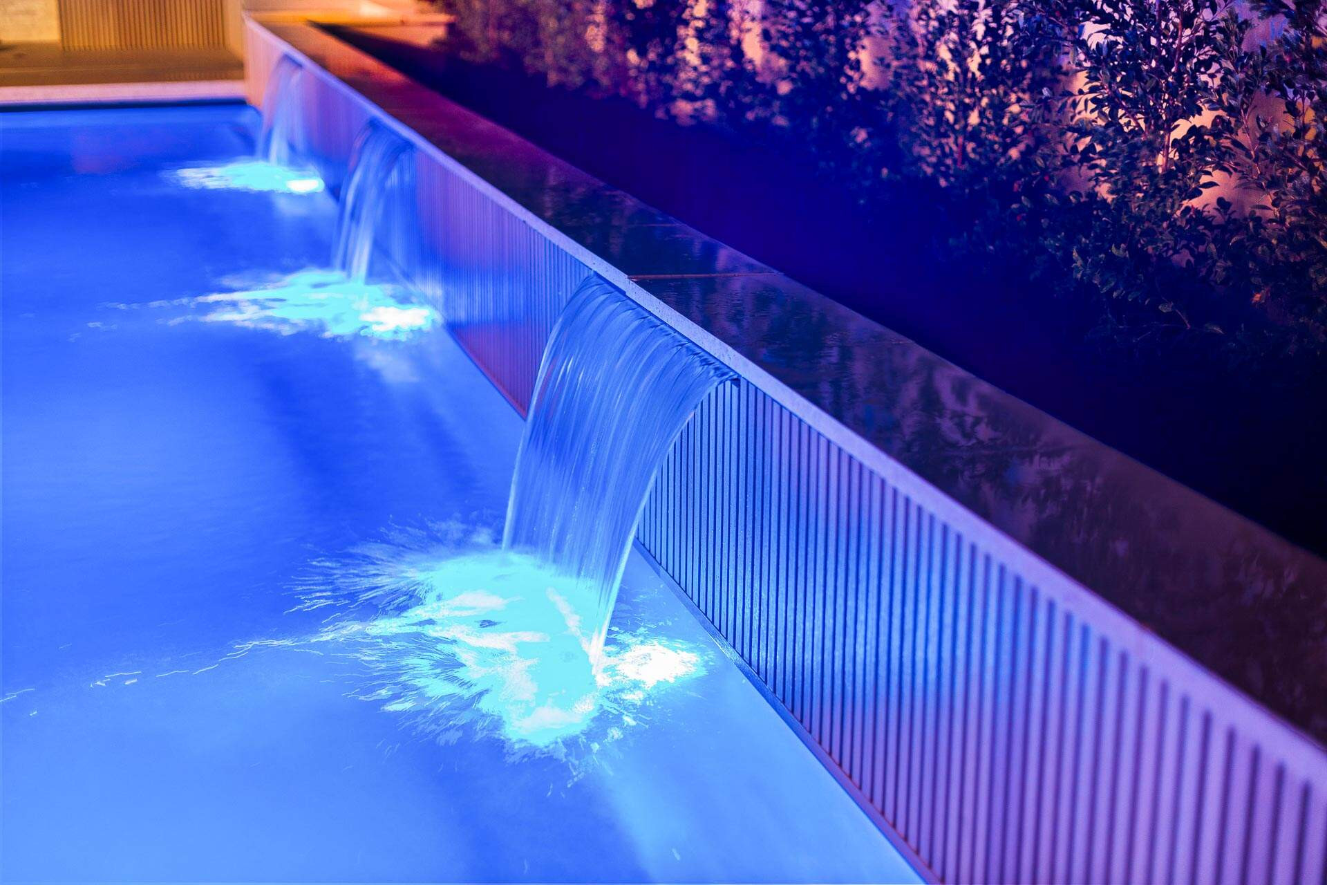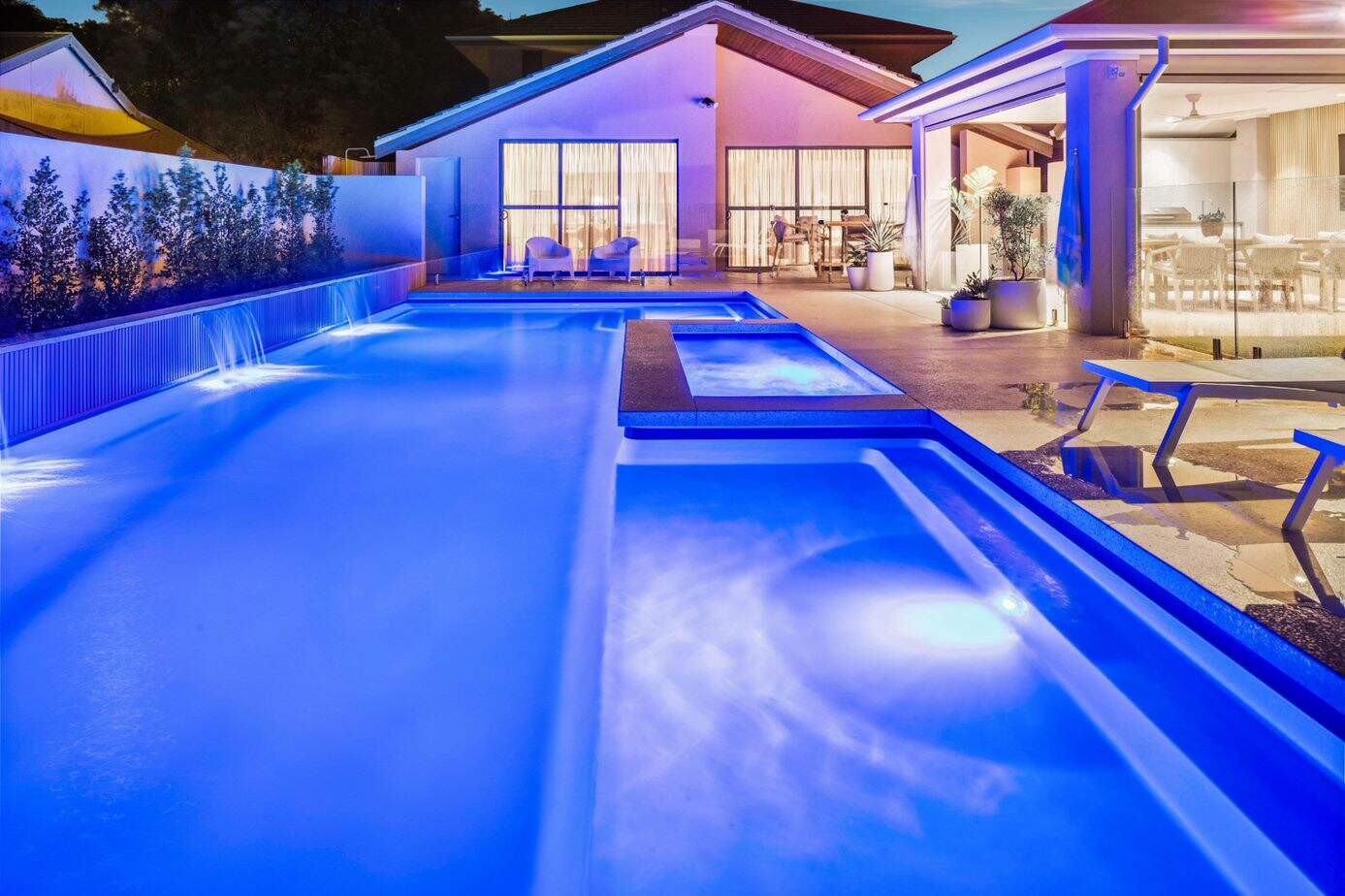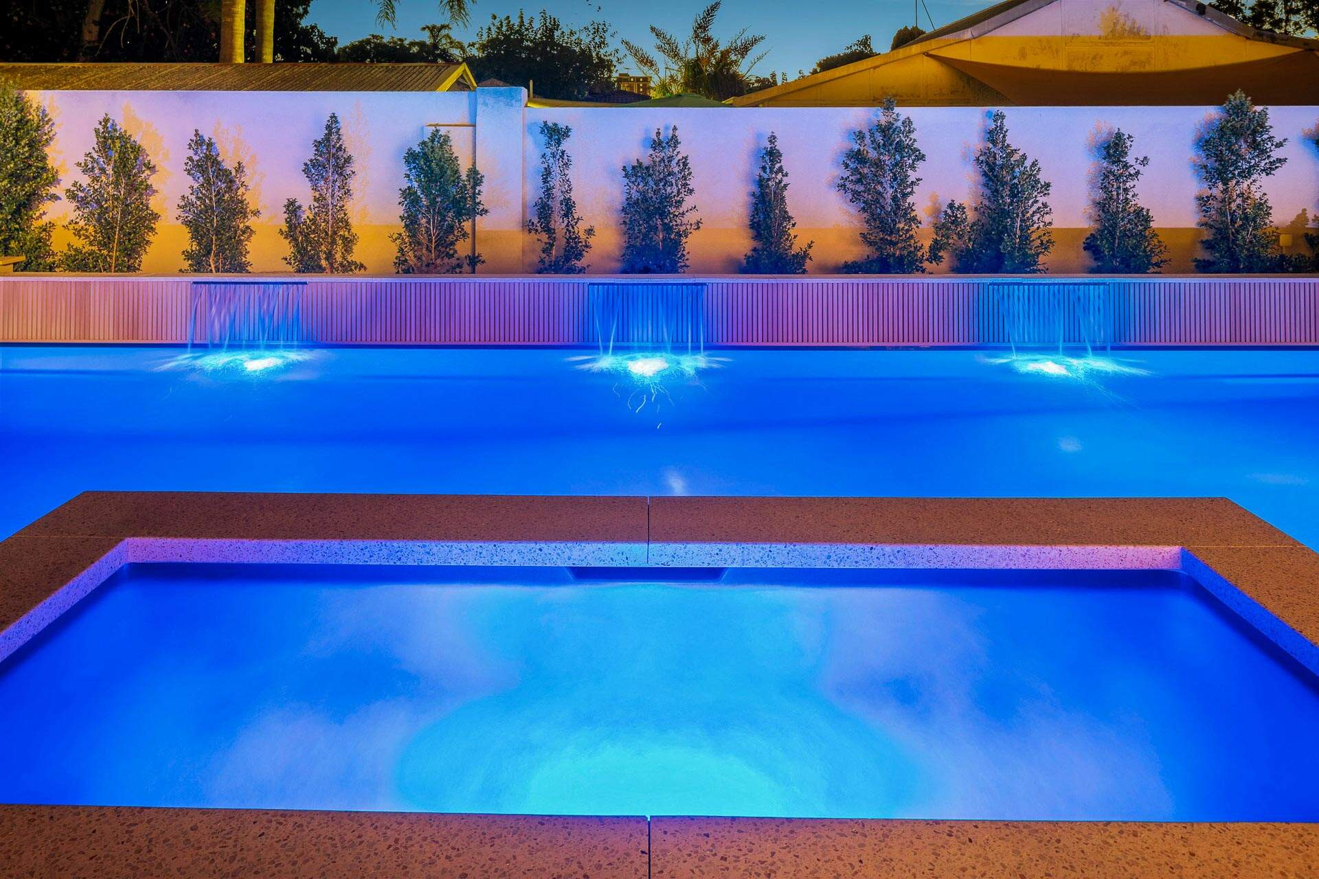Sunsets to night swims are magical in this 12 m Resort configuration. With a total of seven Multi LED lights, which can be operated remotely, each feature of this pool is illuminated to showcase its internal design and water feature additions. With strategically placed lighting beneath each water blade, in-spa, on platform benches and main pool, from dusk to late evening this pool and its surrounds are glowing, safe for night swimming and perfect for poolside entertaining.