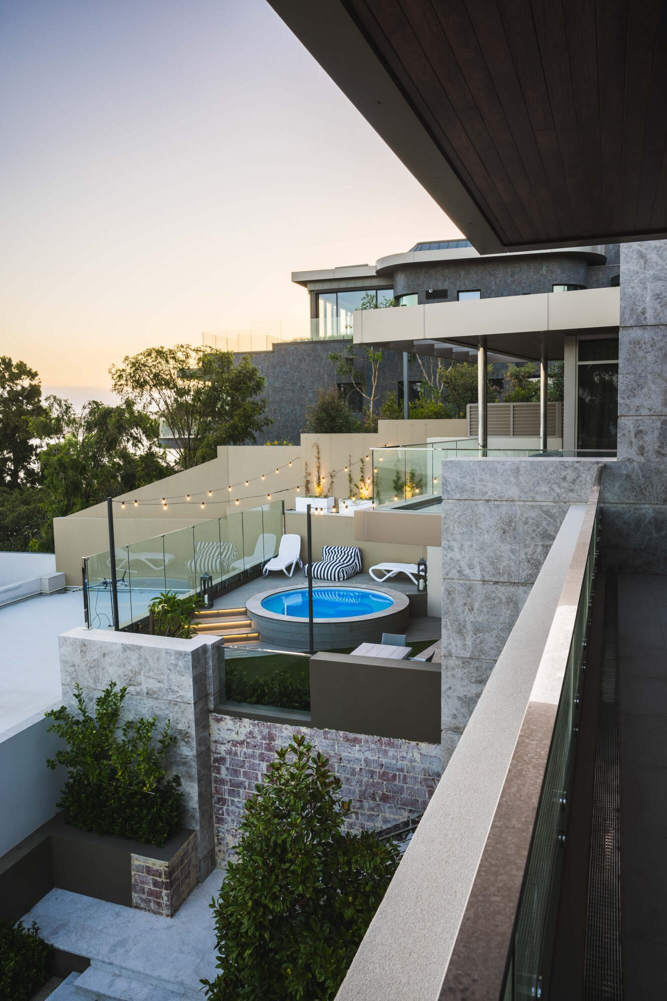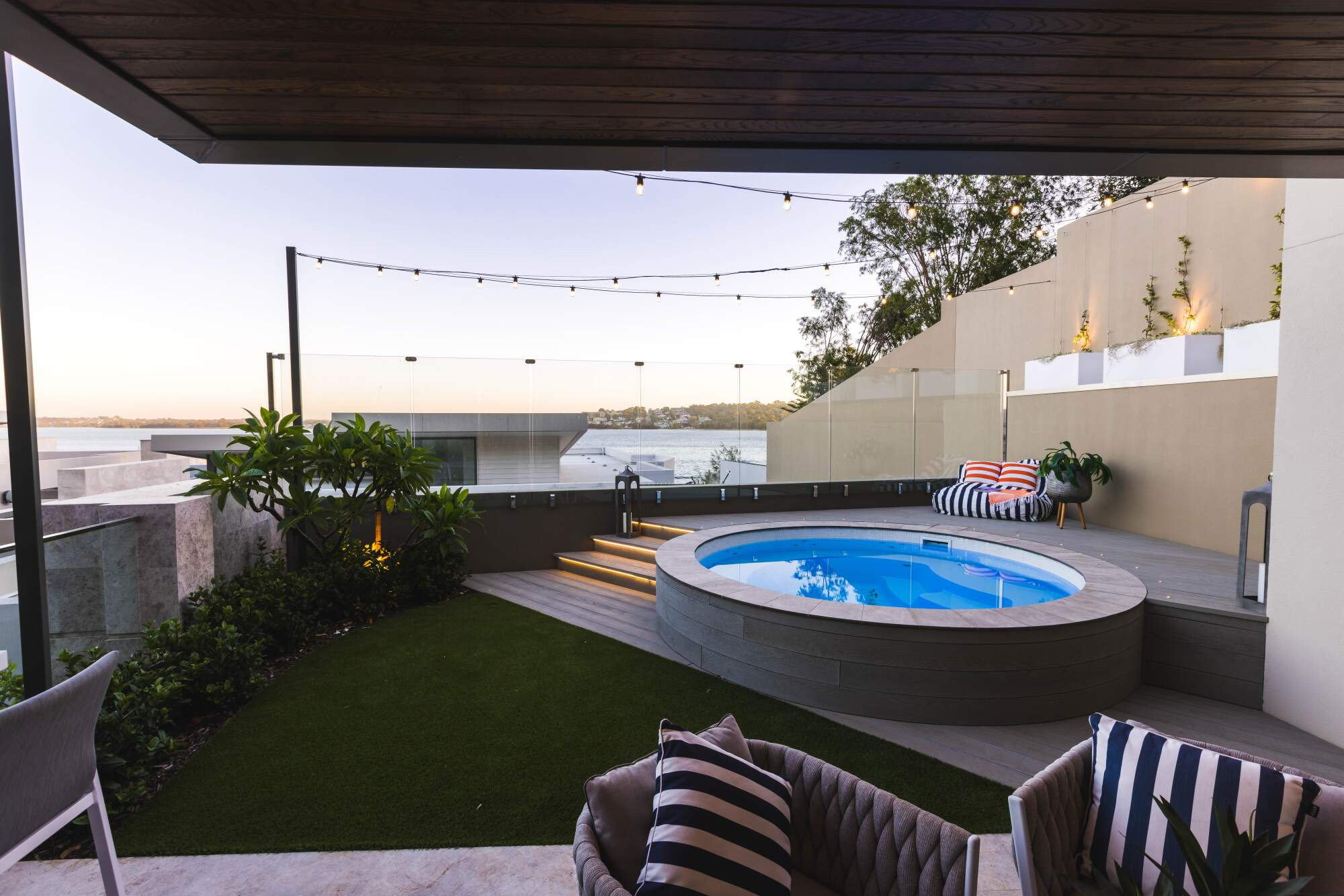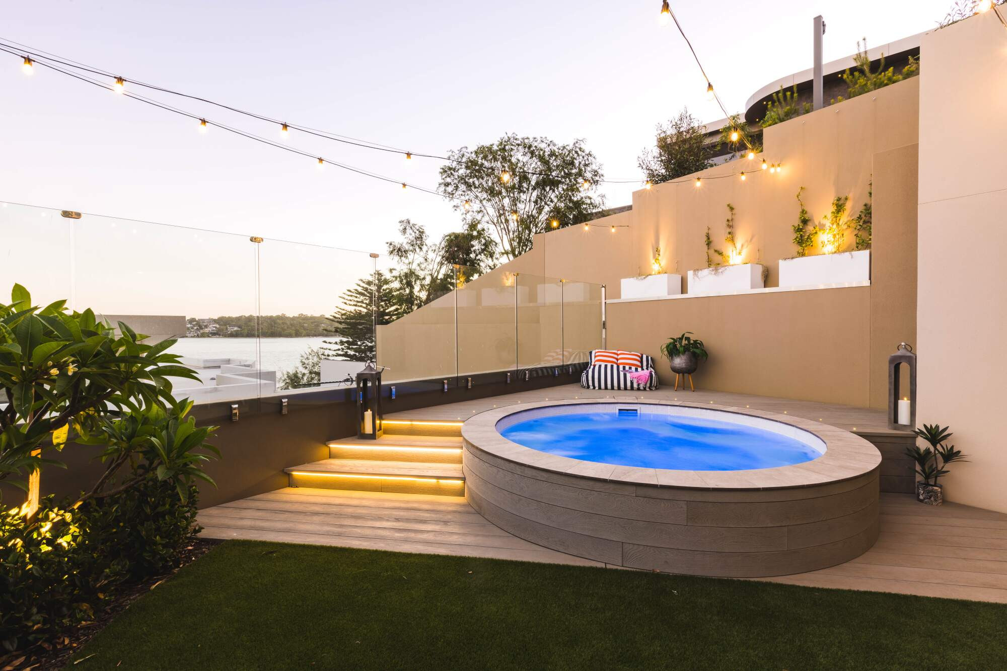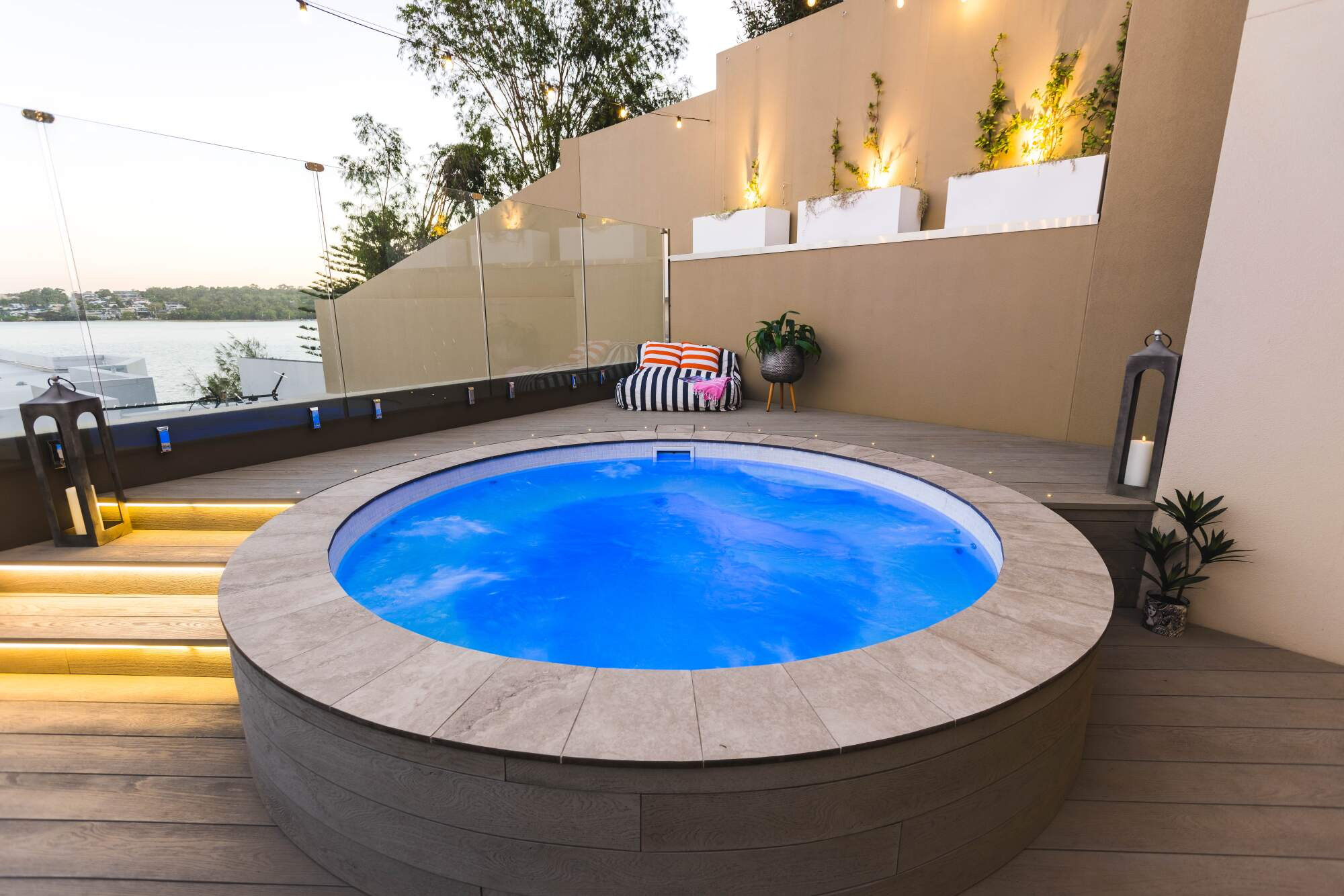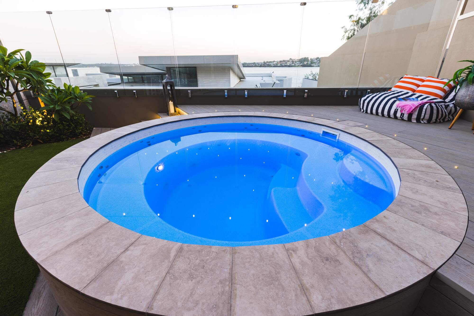 The pool sits at 3m in diameter, and with surrounded seating and jets, provides the perfect area to entertain friends and family across winter and summer. The tranquil blue hue, accentuated by a mosaic edge, seamlessly integrates with the natural surroundings and creates a serene backyard for the owners.