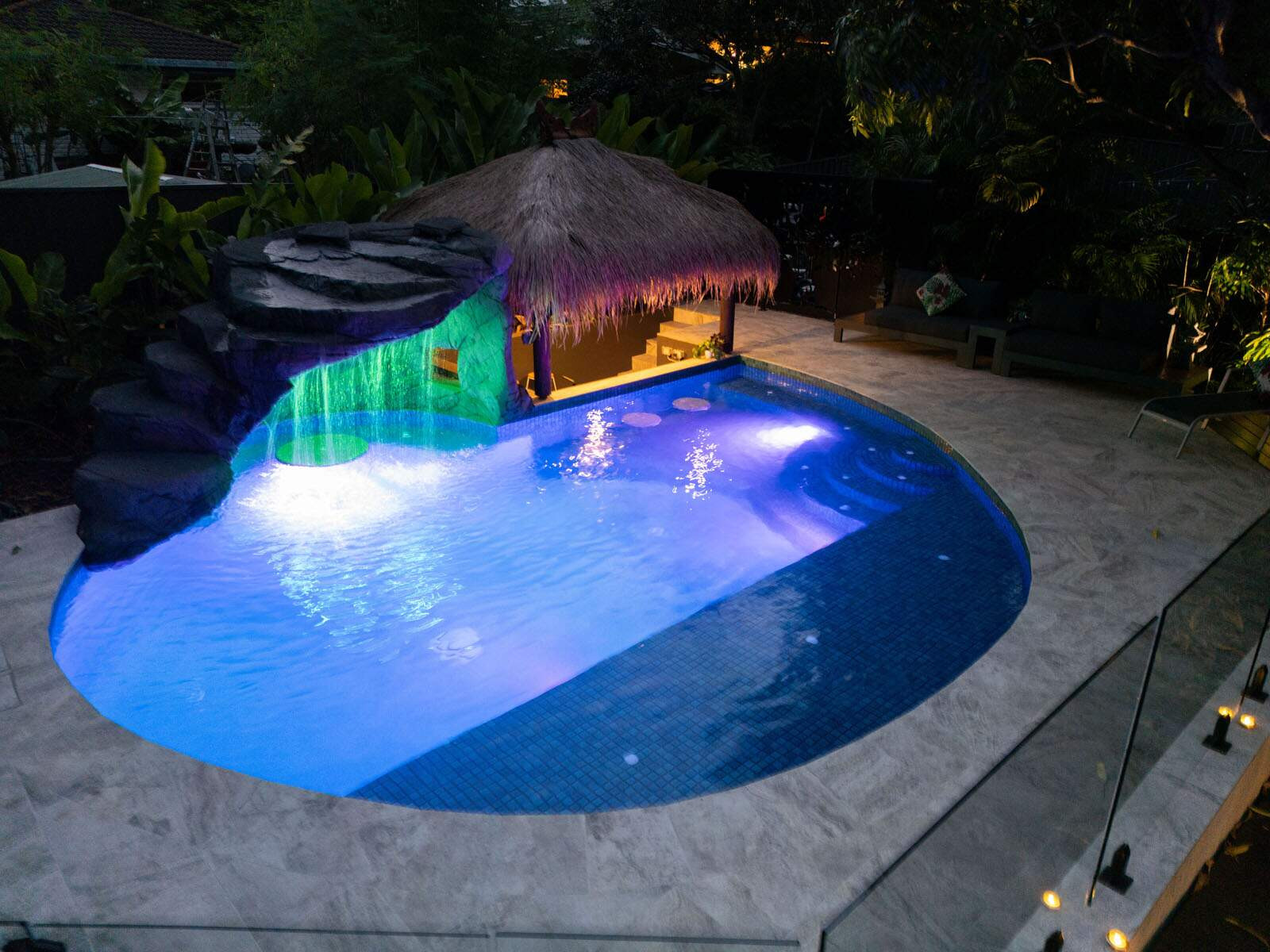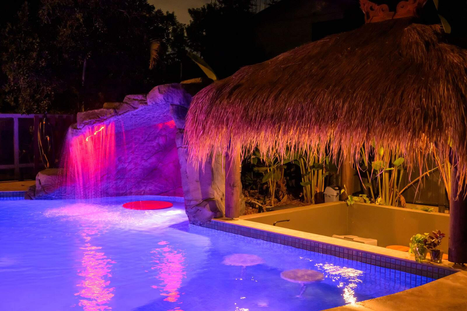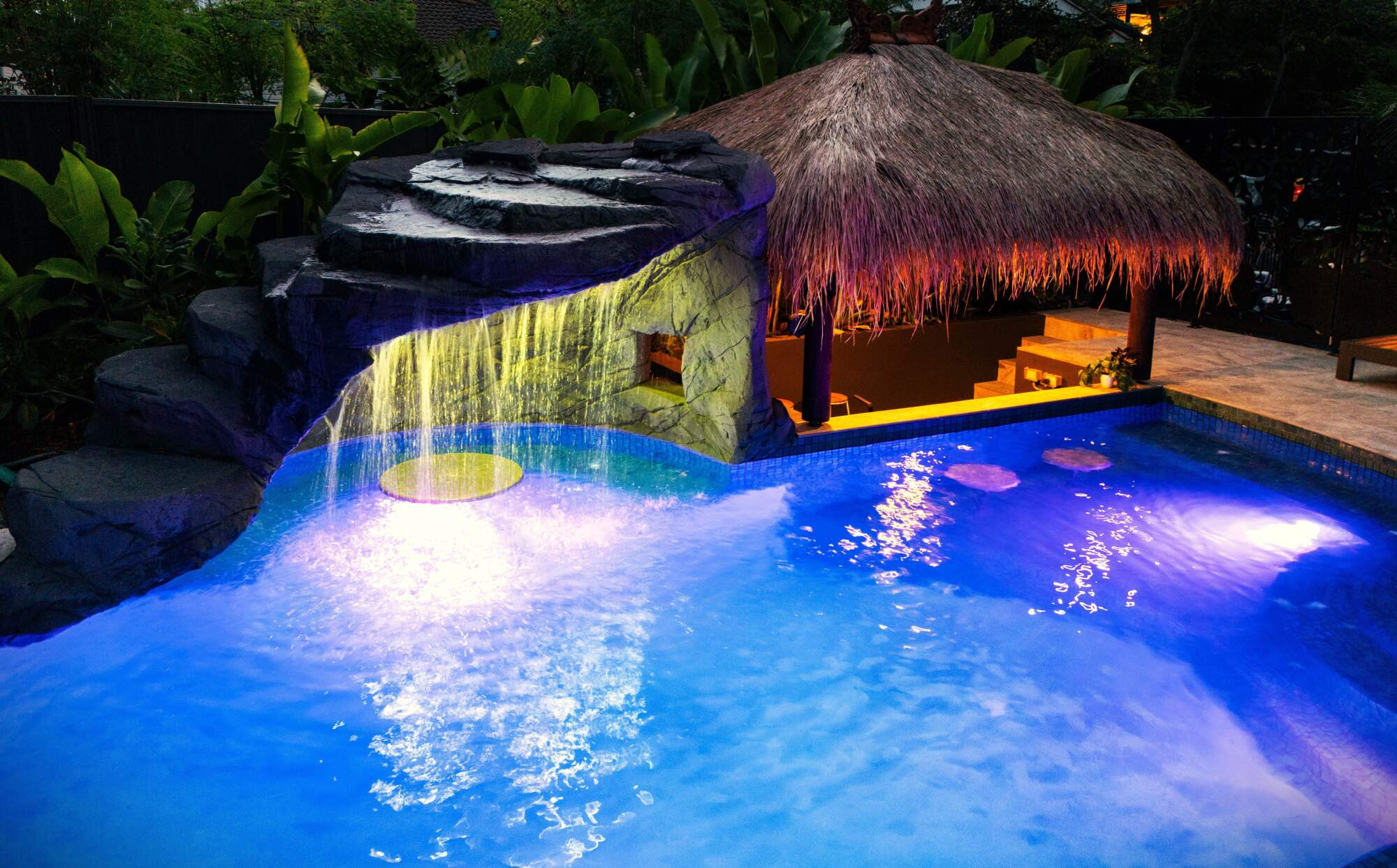 This freeform pool is the very definition of a hidden oasis. Complete with a rock grotto, cascading waterfall and a swim-up bar, this space is the perfect place to unwind after a busy week and to entertain family and friends. A resort worthy pool right at their back door.