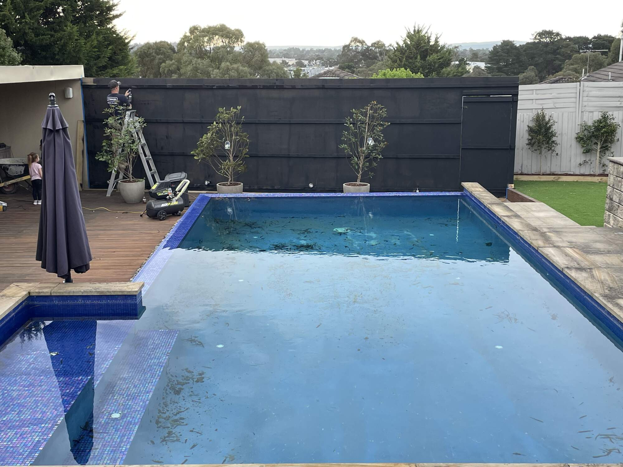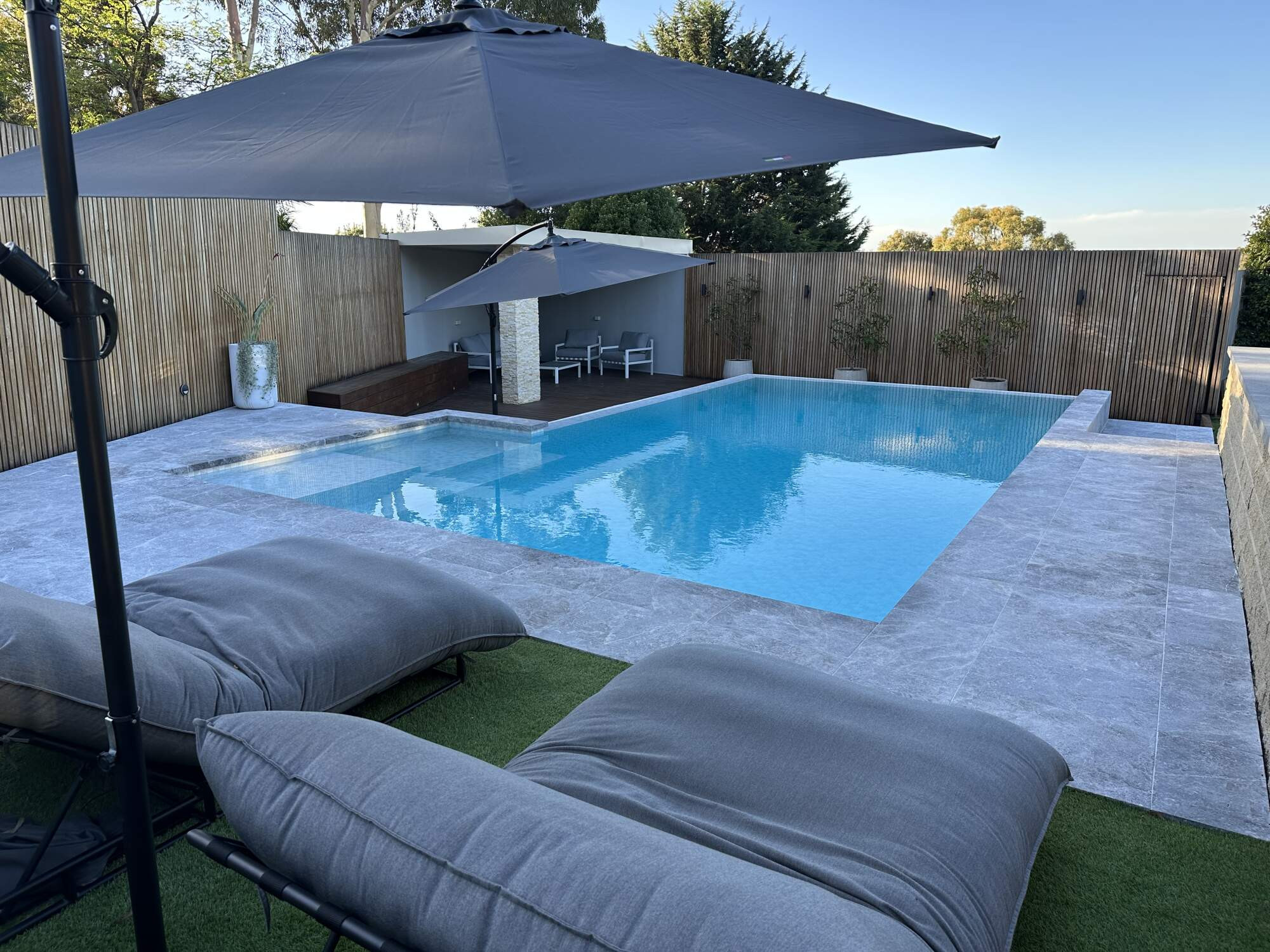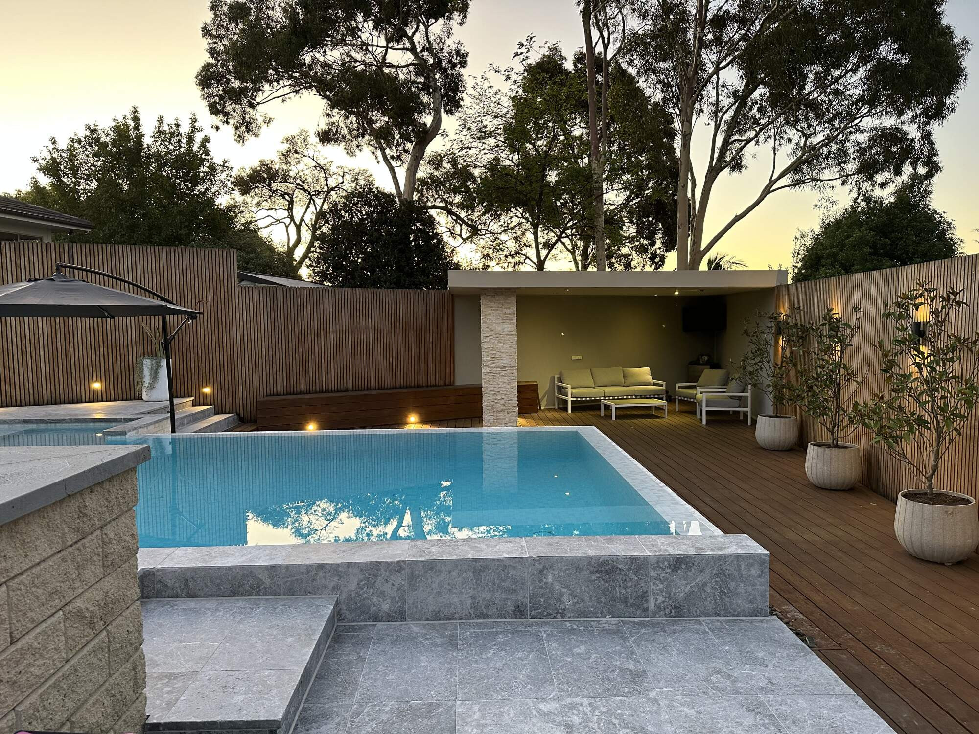 This pool and landscape renovation transformed this pool area from a dark, unused area into a dreamy family delight. The timber batten fencing frames the clear, sky-blue pool water with infinity edge perfectly, drawing the eye into the luxurious, spacious surrounds of the pool. The freshly stained, expansive decking and re-created pool house creates the perfect poolside abode. The upgrade to MagnaPools Minerals & a 24kw Heat Pump ensures the pool water is crystal clear and enjoyably swimmable!