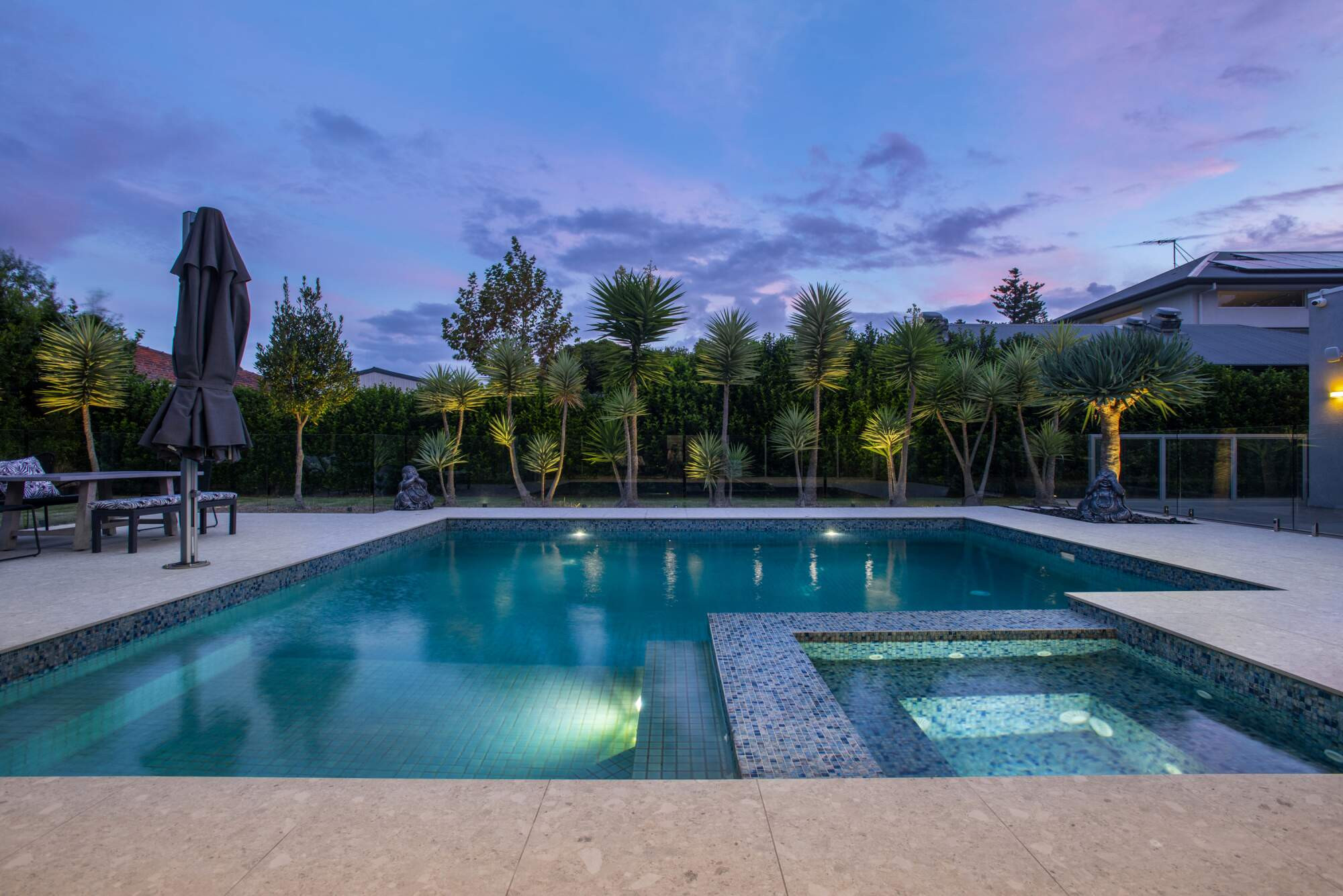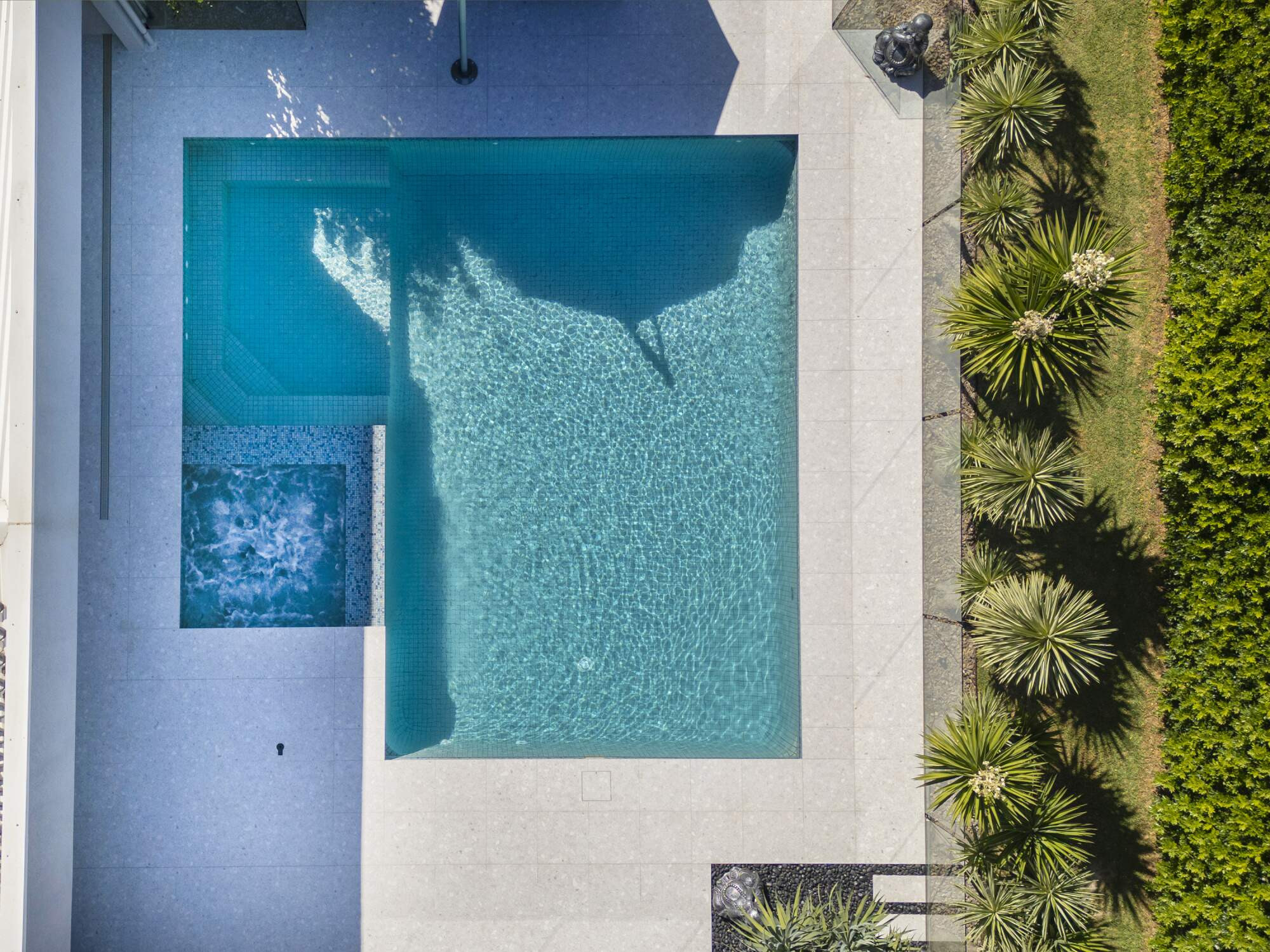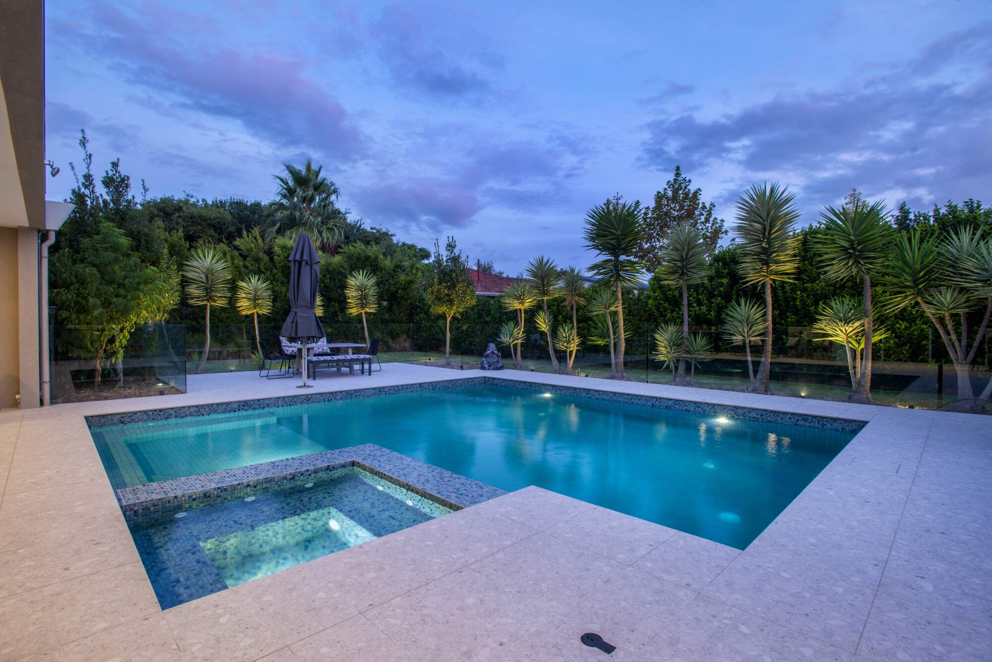 Indulge in the epitome of relaxation and luxury with our exquisite pool and spa transformation. Immersed in tranquility amidst a captivating glass mosaic blend, while cutting-edge technology elevates the experience to new heights. This sophisticated oasis not only redefines the home's ambiance but also offers a haven of serenity and rejuvenation.