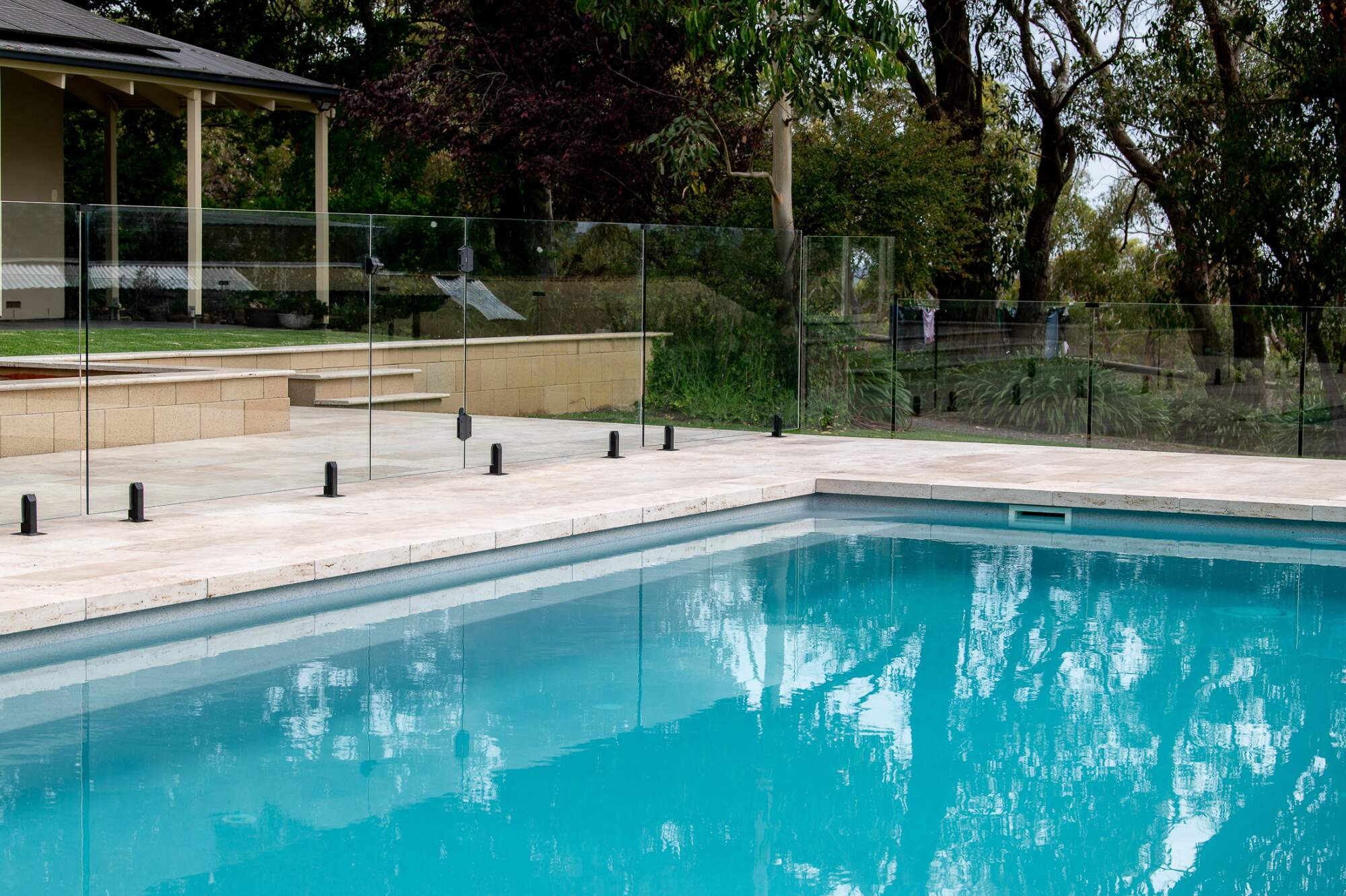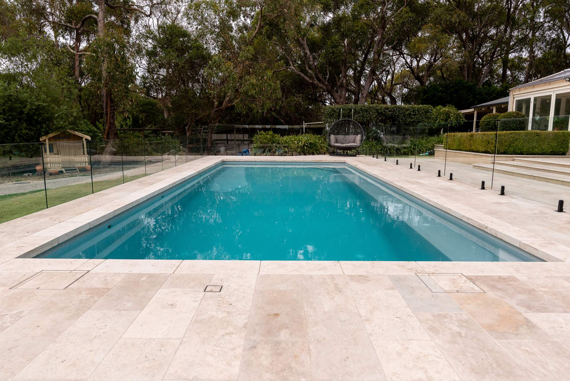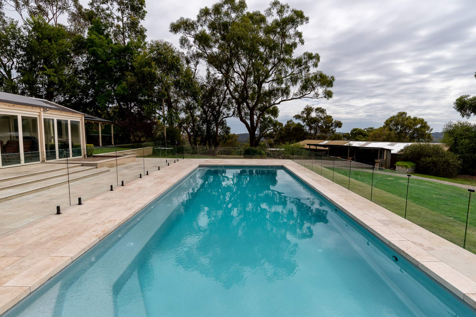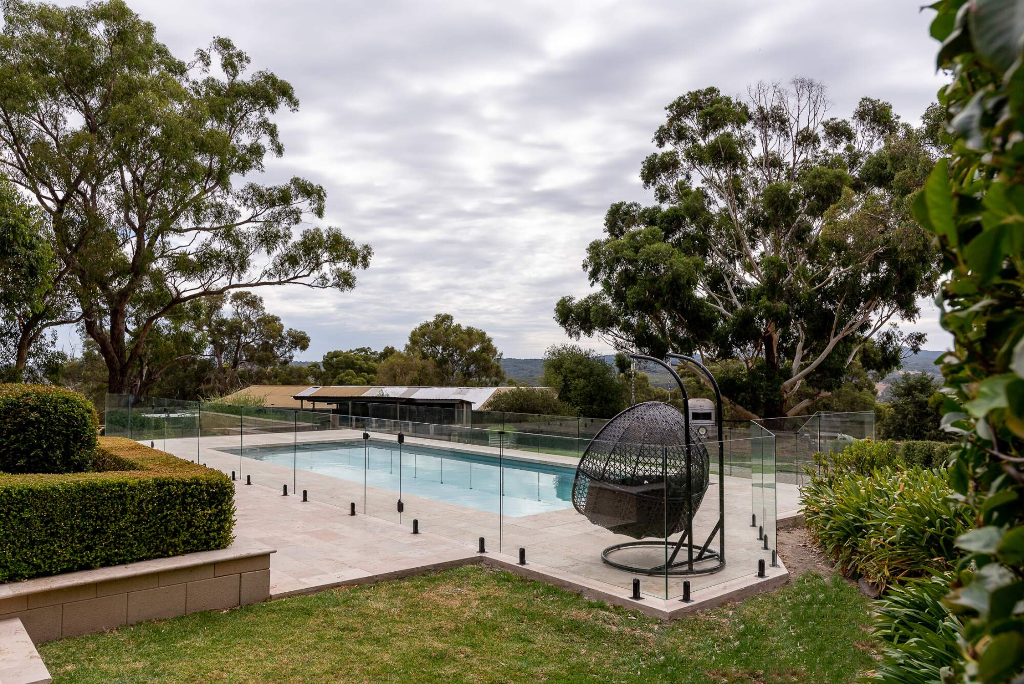 This regal oasis is set amidst a backdrop of majestic gum trees and impressive paving that leads the the grand homestead, exuding a sense of luxury and refinement. The Aqua Technics statement 'Torino' pool with in-floor cleaning, installed by Outside Developments stands out as the crowning jewel in this picturesque setting, commanding attention and admiration. The epitome of old school luxury, this elevated outdoor space is every bit the celebration of style and sophistication.