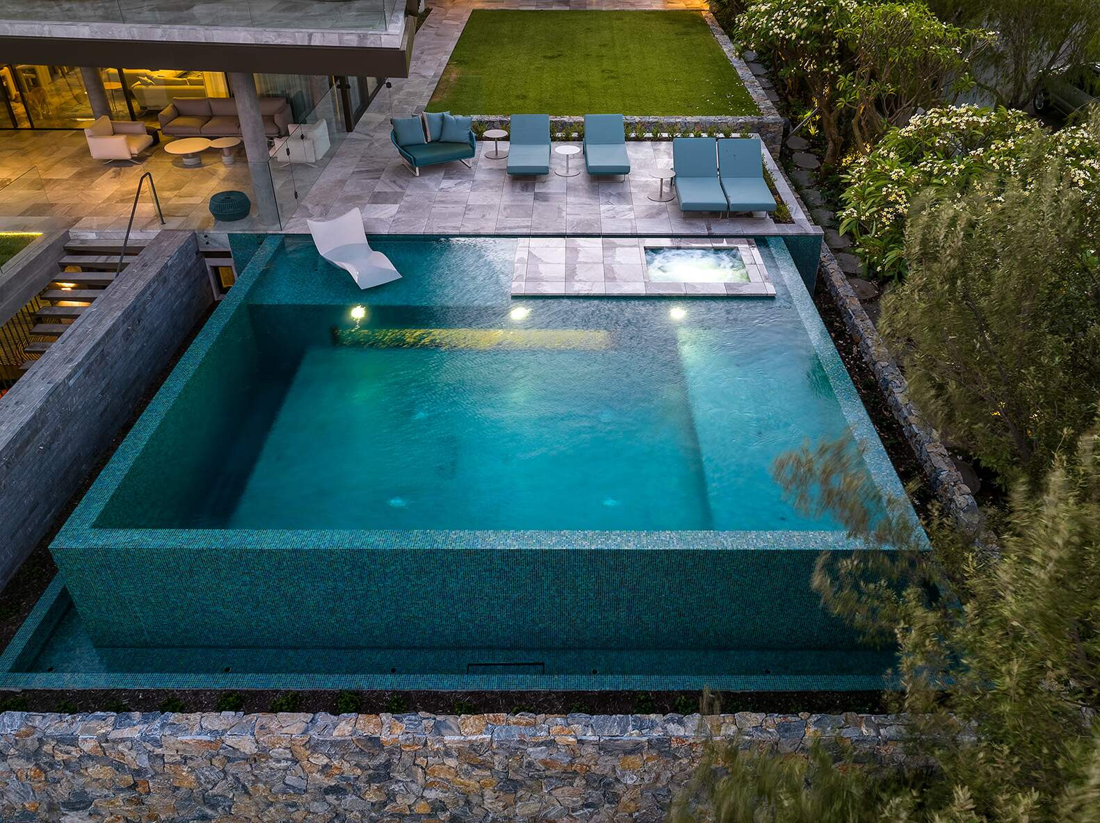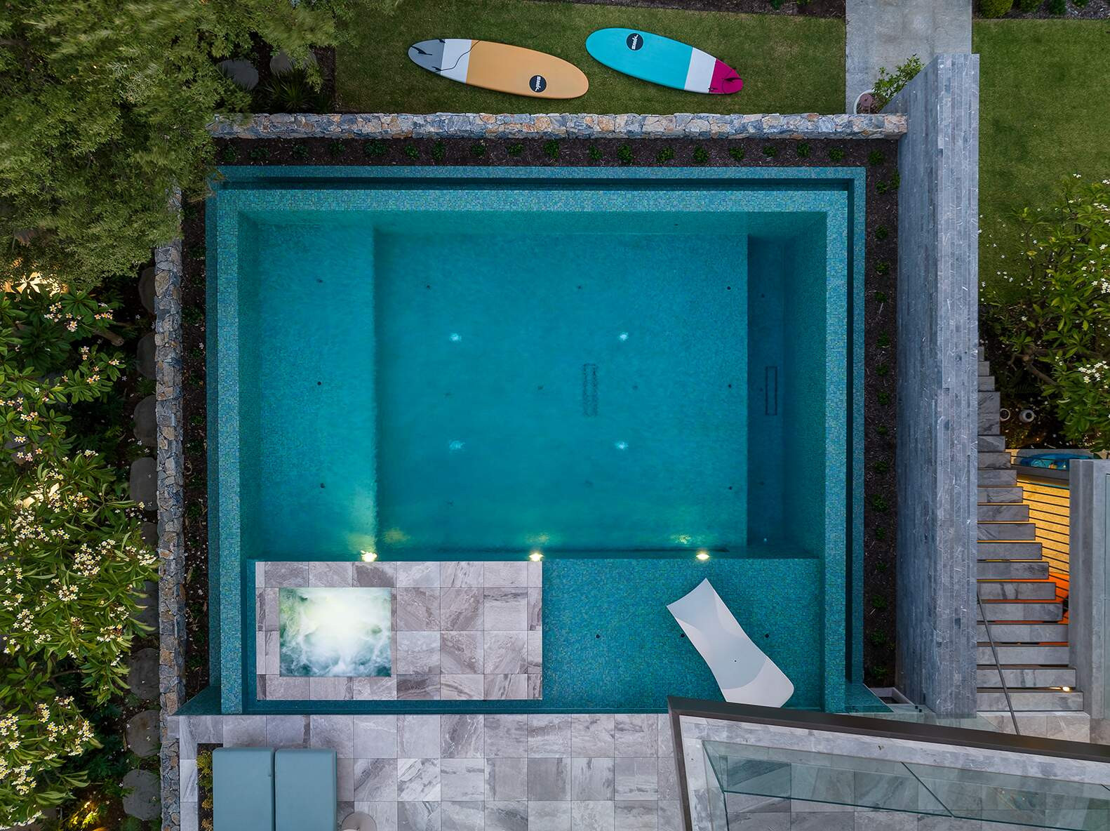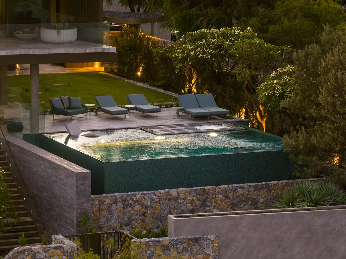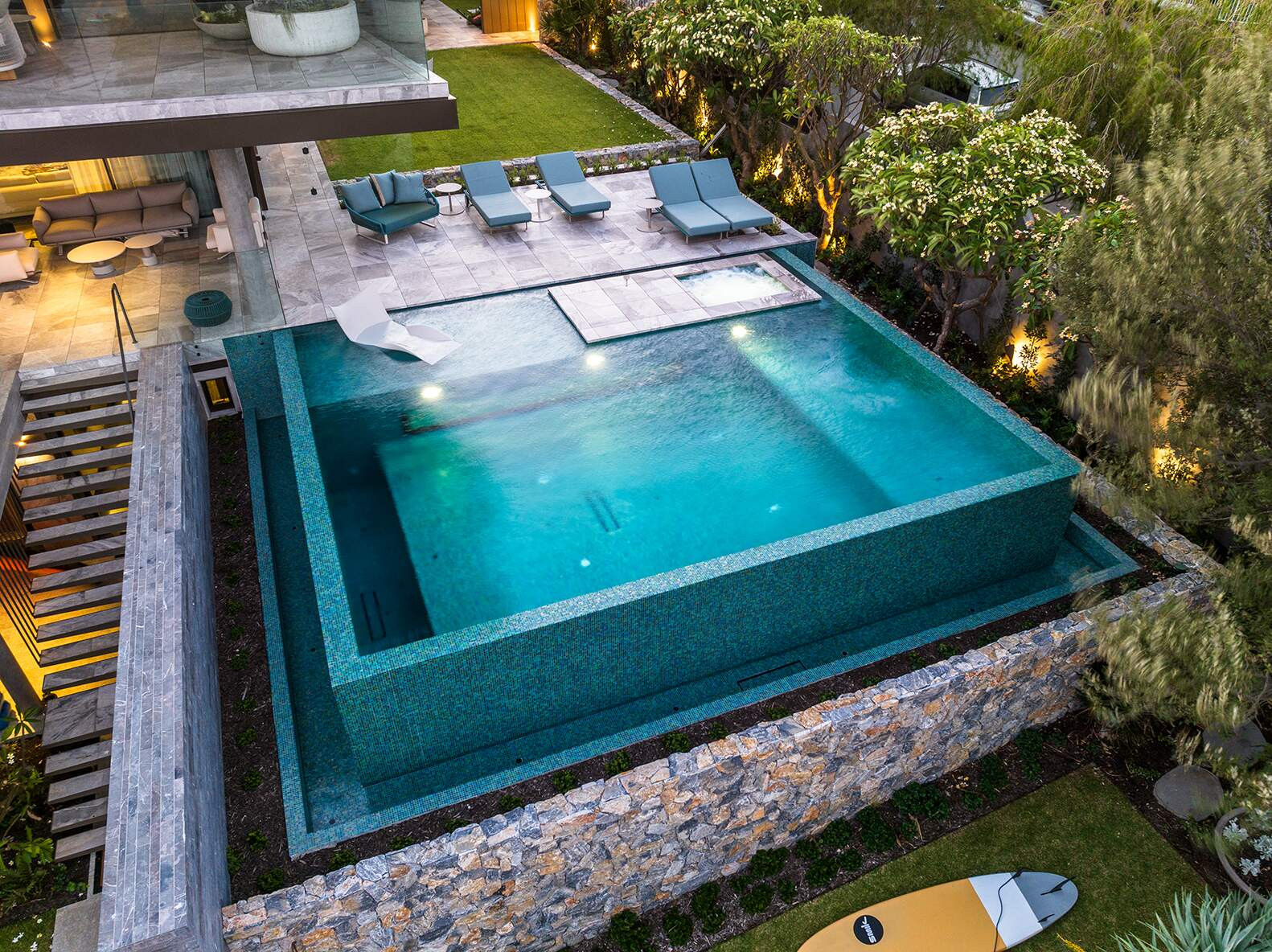 This understated, yet impressive pool, is an entertainer’s dream while also suitable for a young family. It is visually appealing from the corner block’s two street frontages, as well as the home’s many balconies and living areas. The three-sided infinity edge takes in views over the Swan River, Perth CBD and beyond. Fully controlled via the home automation system, heated year-round and self-cleaning, this beautiful pool is finished with custom blend Bisazza mosaics and white LED lighting.