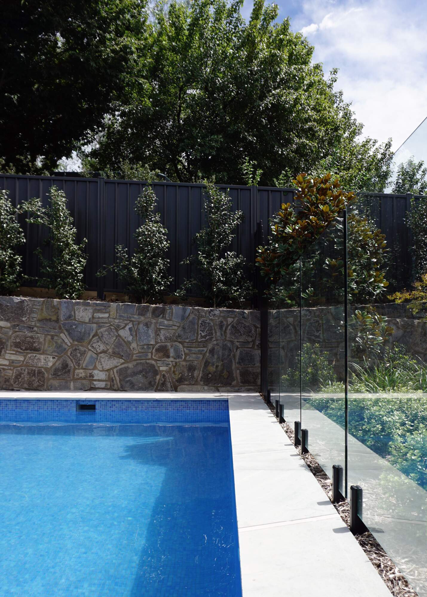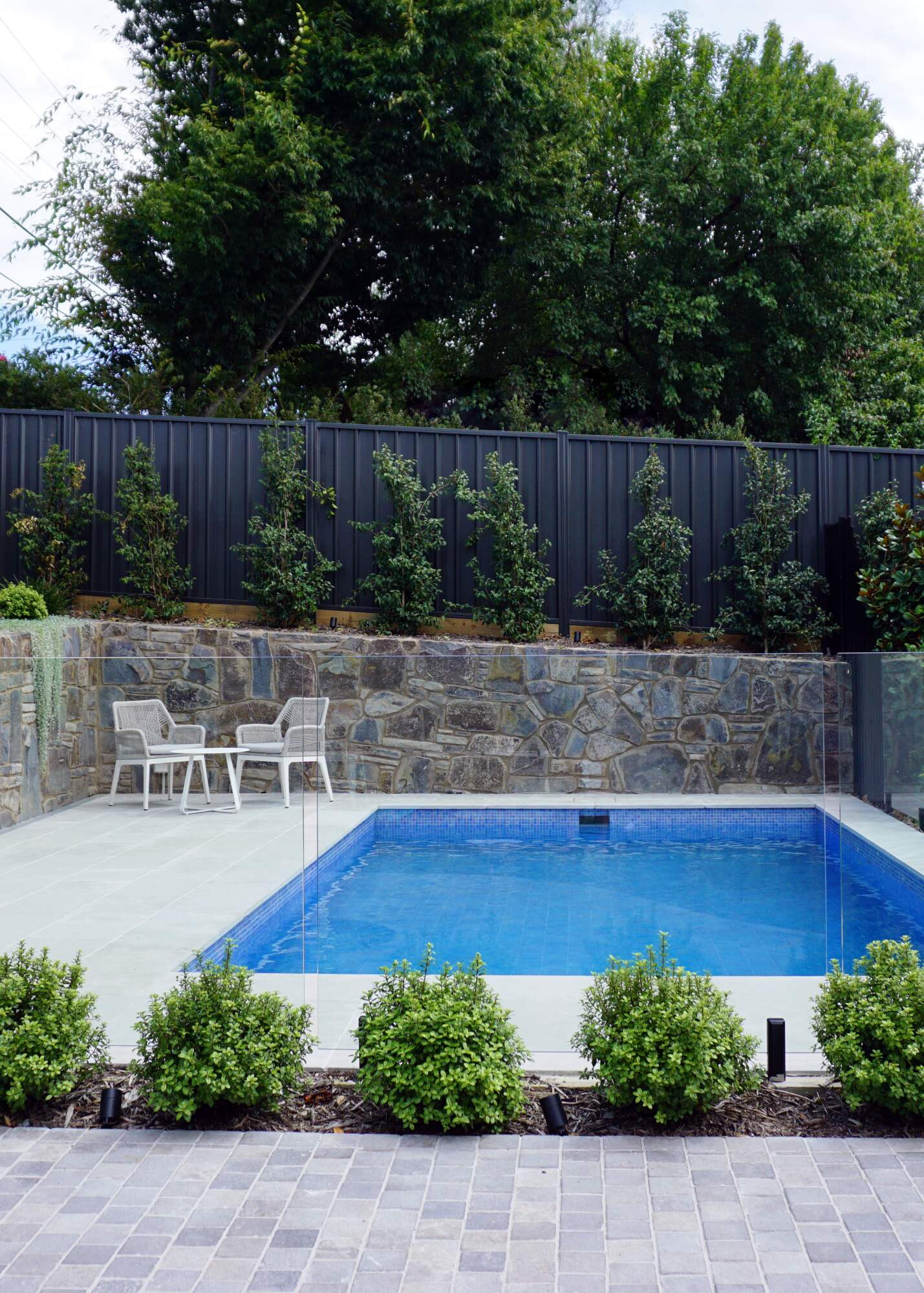 The Pearce residential project offers an intimate and low maintenance design which caters to a young growing family. The new, flat bottom concrete pool is nestled in the corner of the property, protected by a stone retaining wall and surrounded by low screening plants allowing for sight lines to be retained between the house and pool.