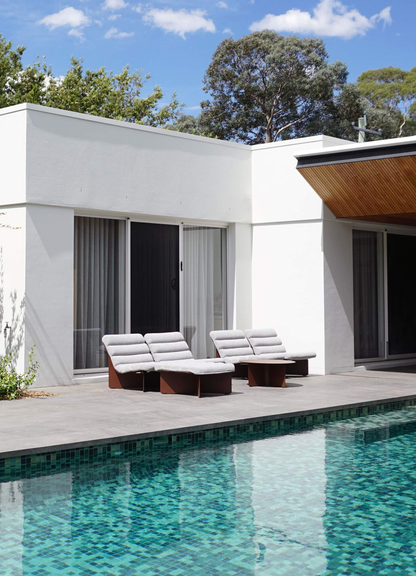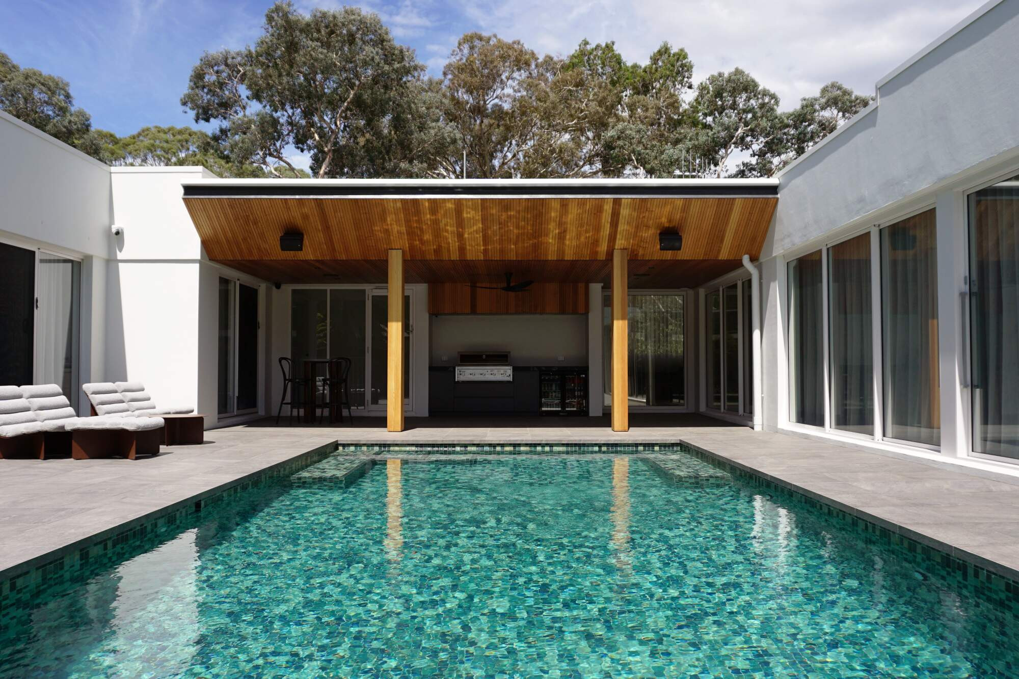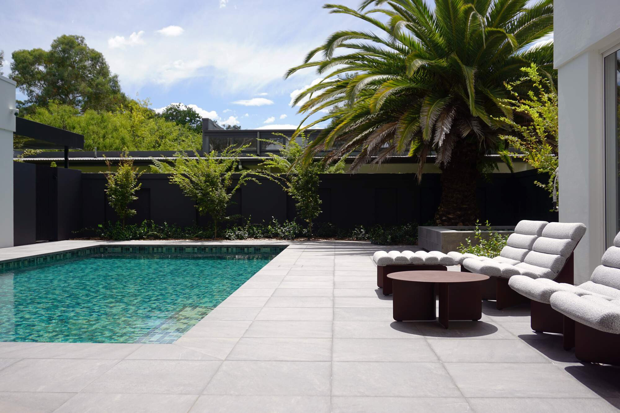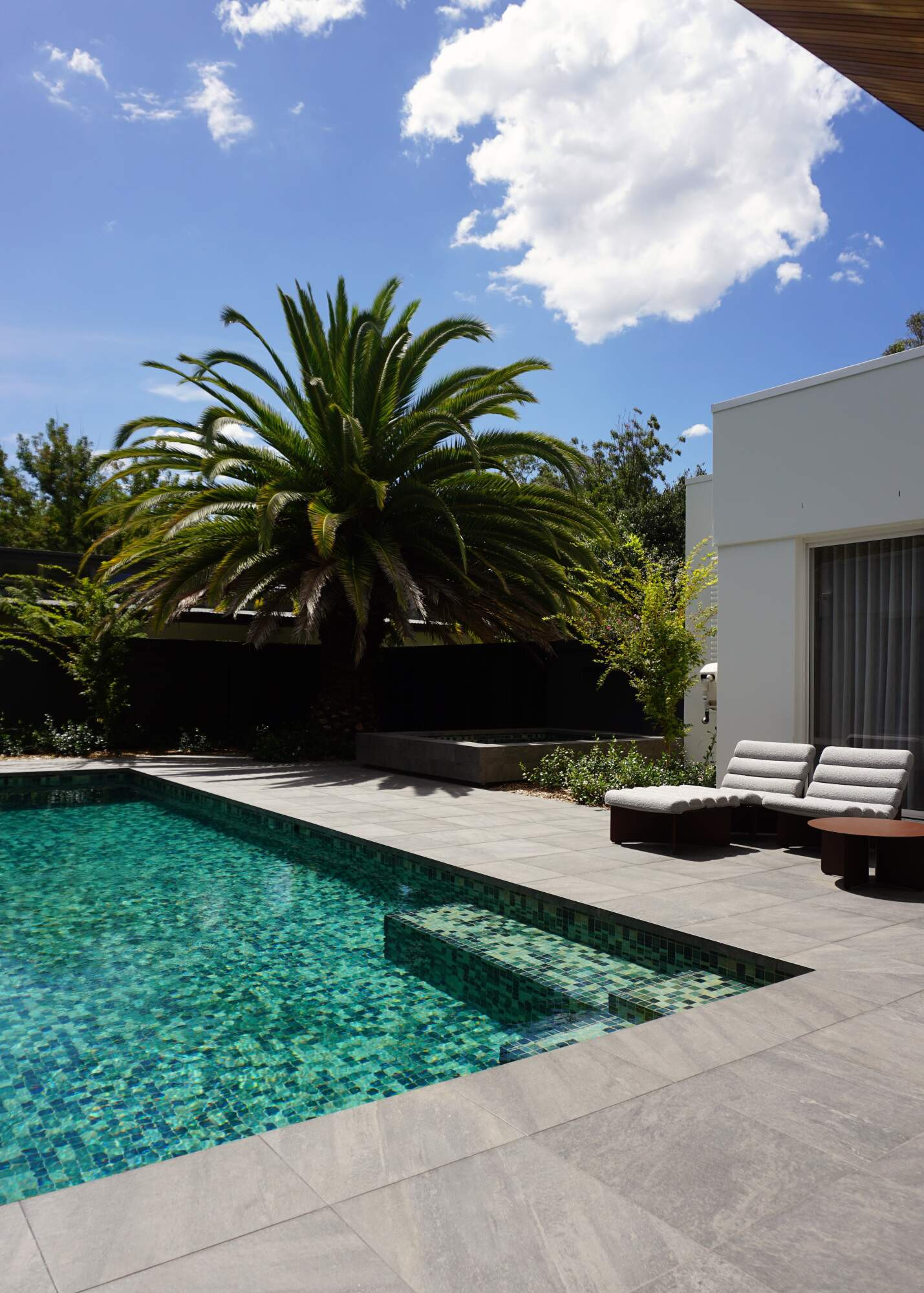 Working collaboratively with Paul Tilse Architects, a modern & expansive design was adopted to create an outdoor entertainers dream with multiple offerings (outdoor BBQ kitchen, dining zone, in ground pool and above ground spa. A renovation strategy was taken with the pool design, rather than starting from scratch. The client wanted to capitalize on the existing size/location and with the use of new interior/exterior tiles and restructuring of internal forms, transformation was achieved.