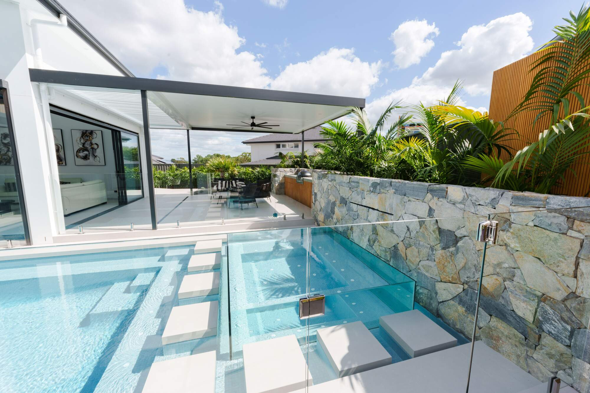When you can't have a house on the coast you can just build it in your backyard! This project makes you feel like you have rented a spectacular air bnb in Port Douglass! A beautiful heated pool and spa to use all year round that makes you feel like your in paradise. Surrounded by leafy palms, this airy space is built for enjoyment, relaxing and entertaining all at once with all the bells and whistles a touch of a button away.