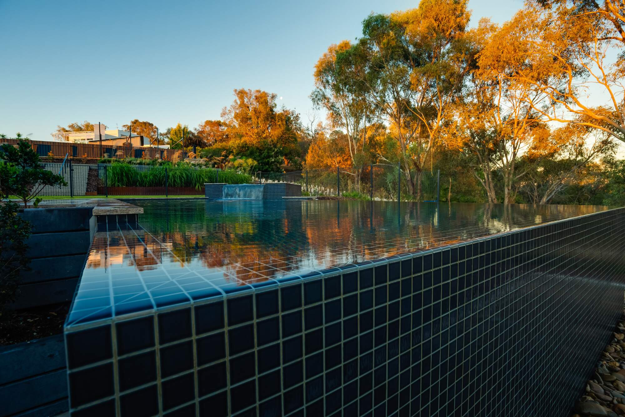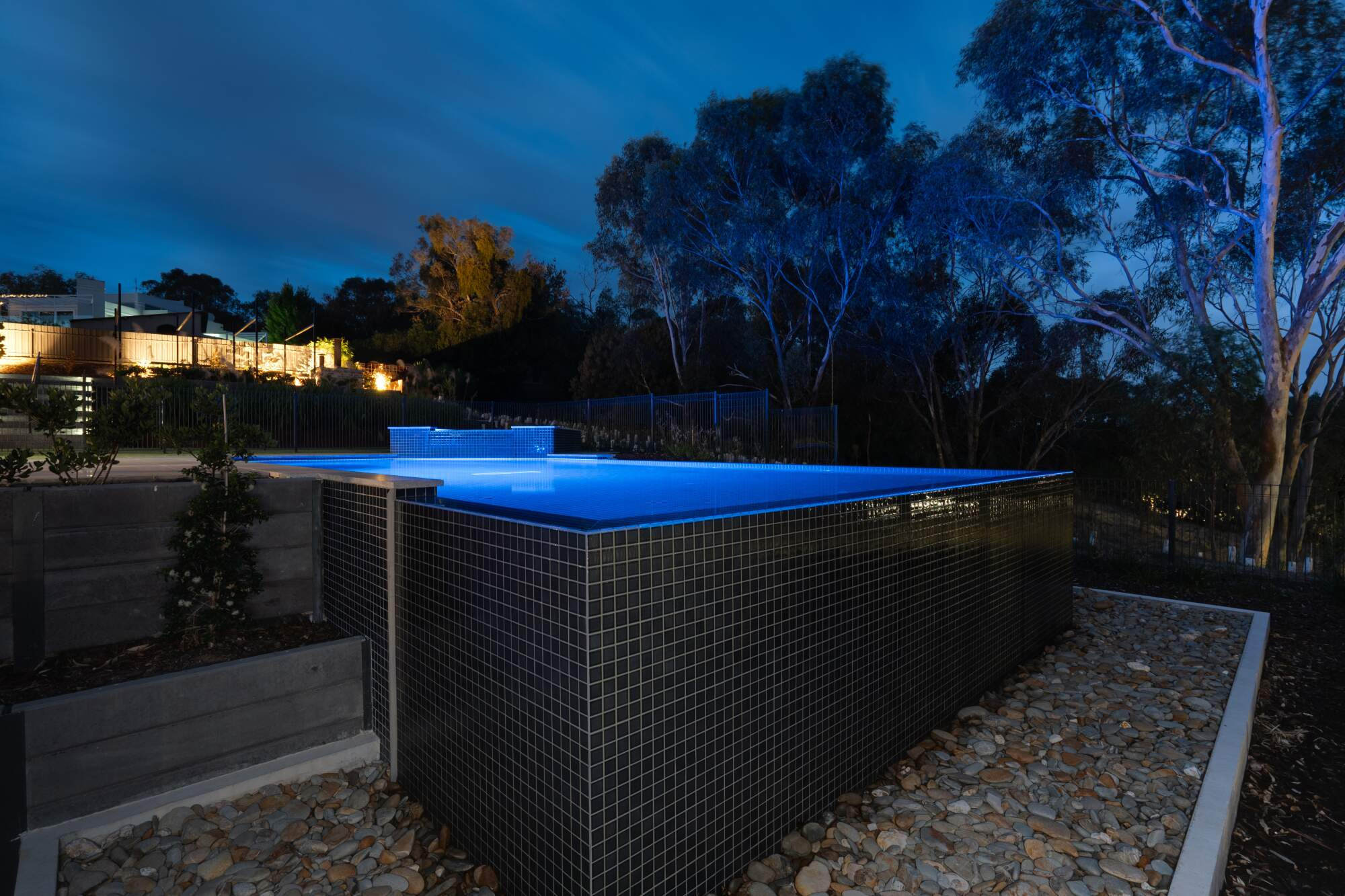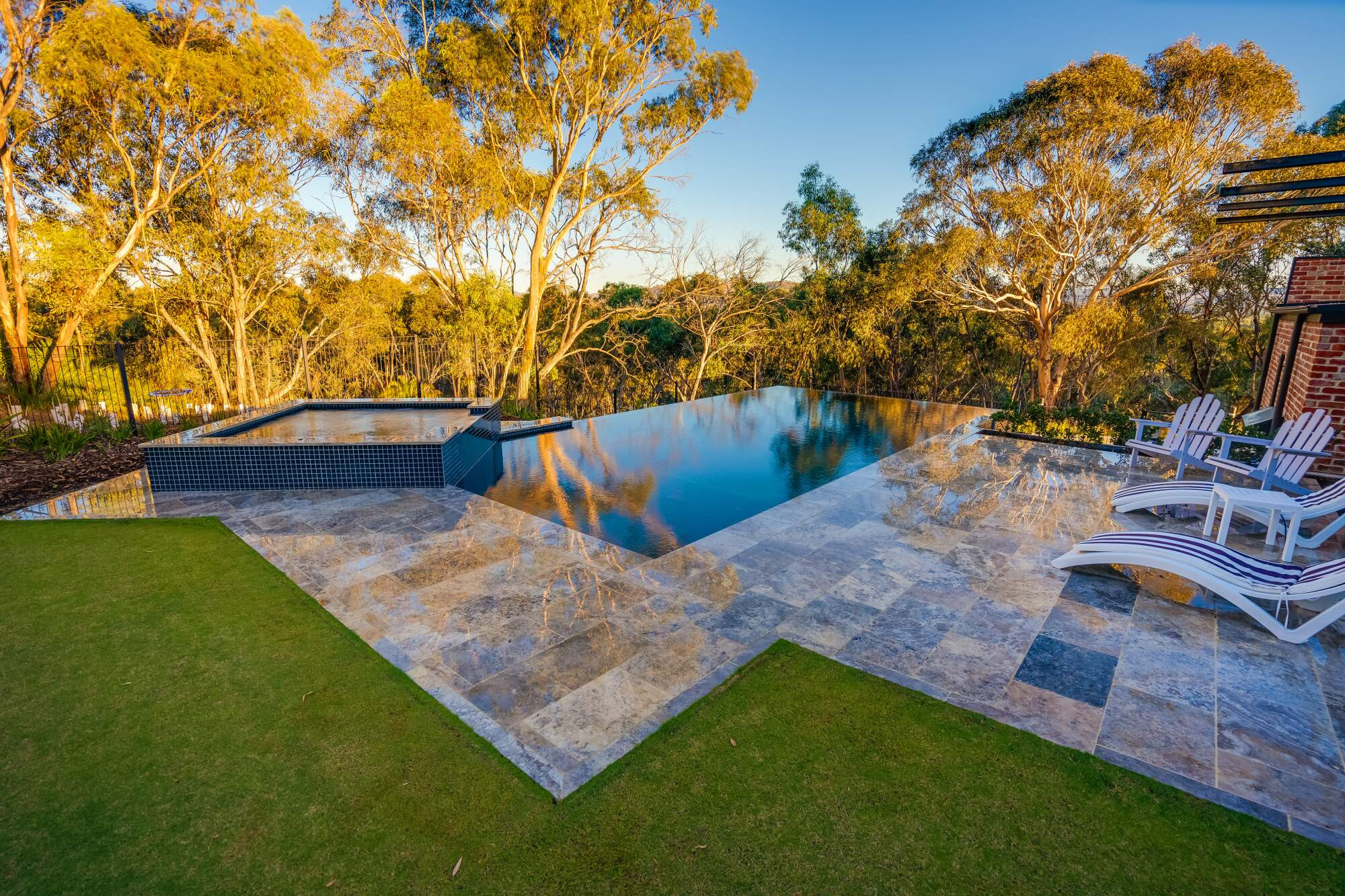 Nestled within a breathtaking natural landscape, this luxury pool and spa combination combines striking architecture, lush landscaping, and an infinity edge that takes you among the tree-tops.