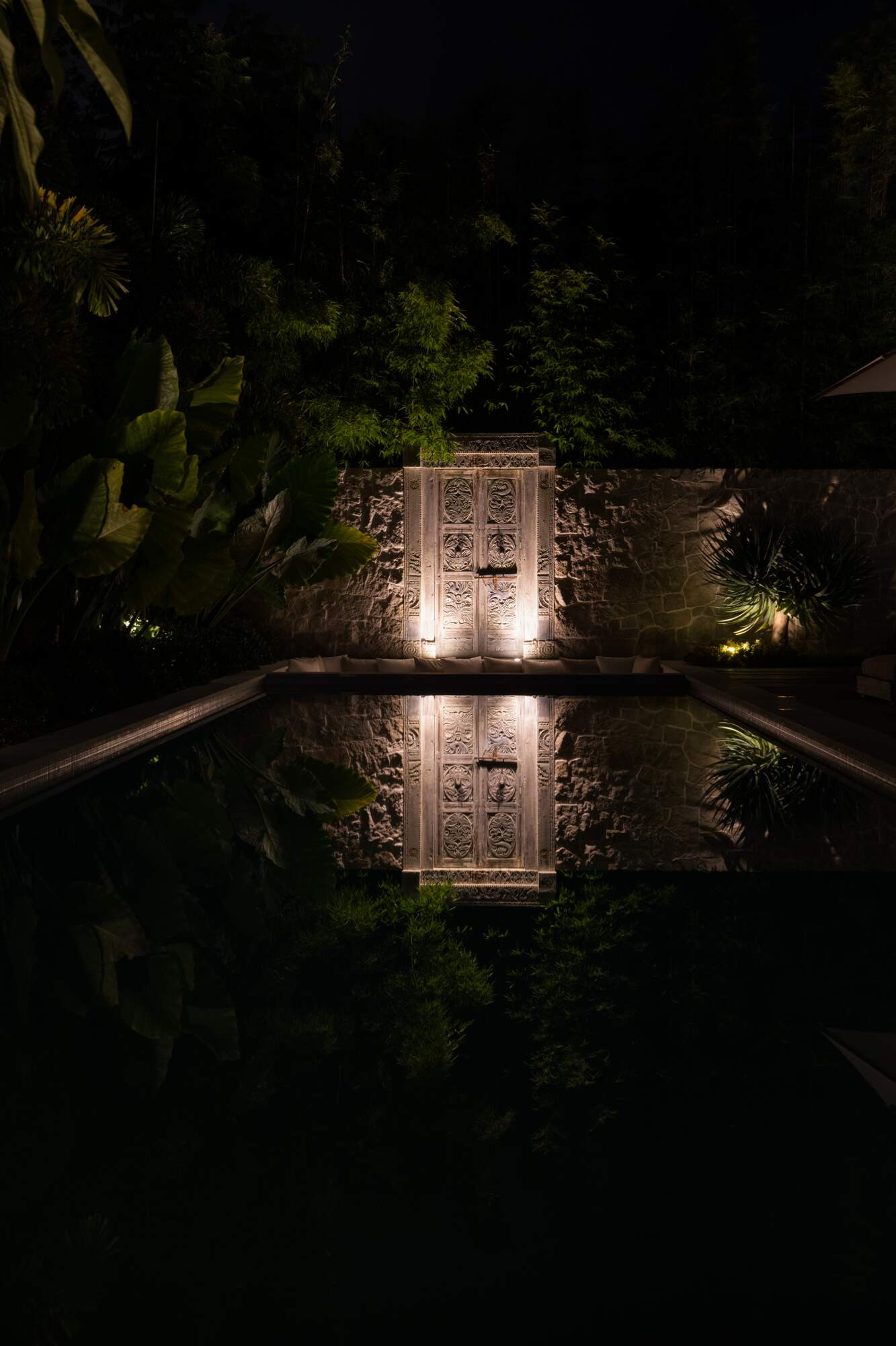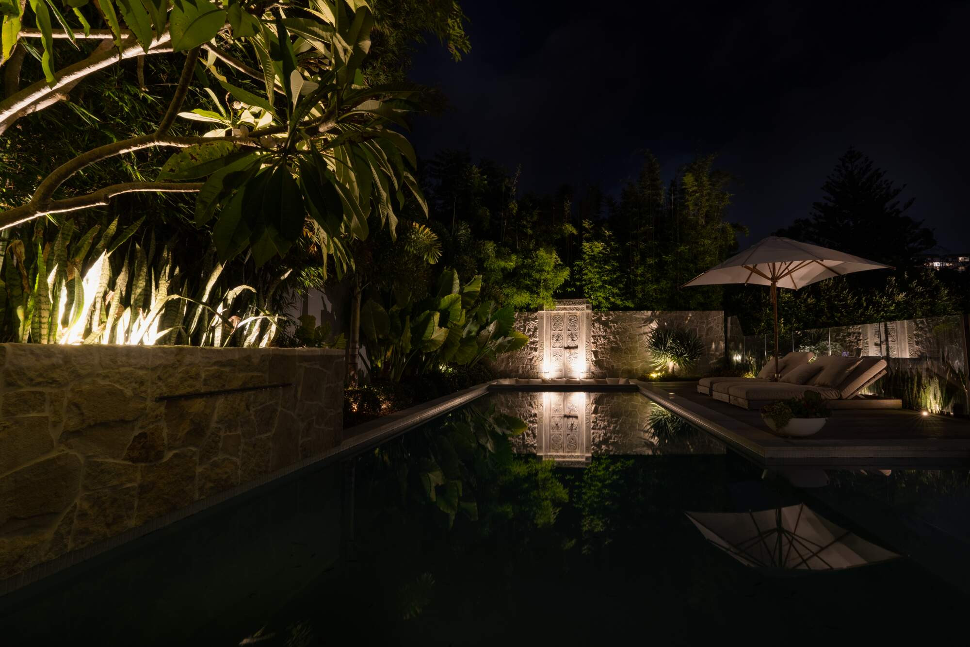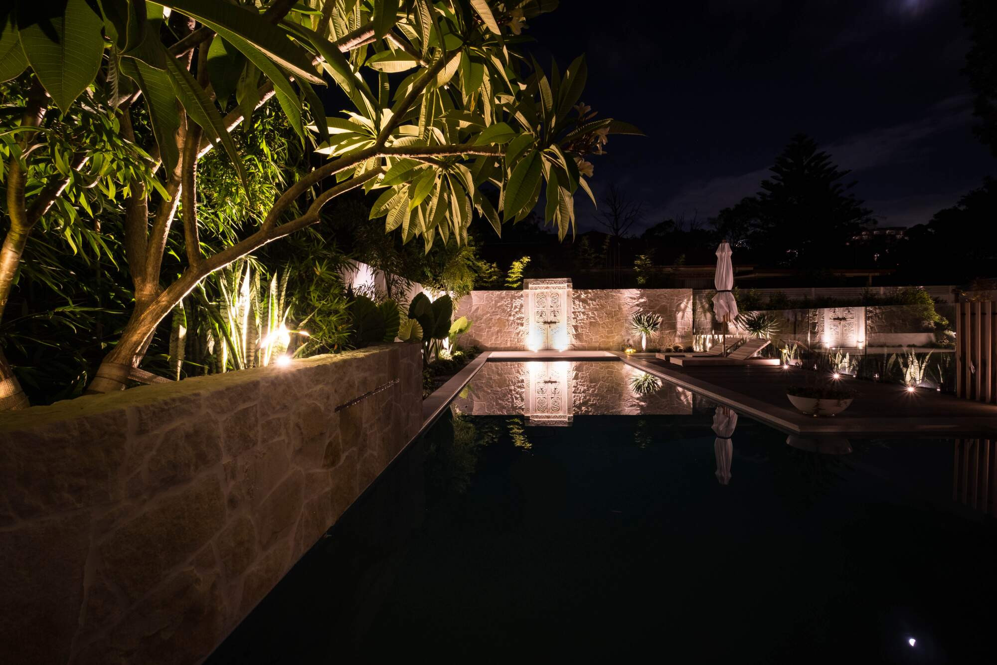 While exquisite during the day, this pool area transforms into an other-world experience by night, lending an entirely unique aura to the space. Considering ambient light and reflection as a means to light the space creates a mood distinctly reminiscent of meandering through a tropical resort by evening, while in-pool lighting can transform the mood from an exotic resort to an Ibiza pool party at the touch of a button. A truly versatile space designed to be enjoyed equally by day and by night.