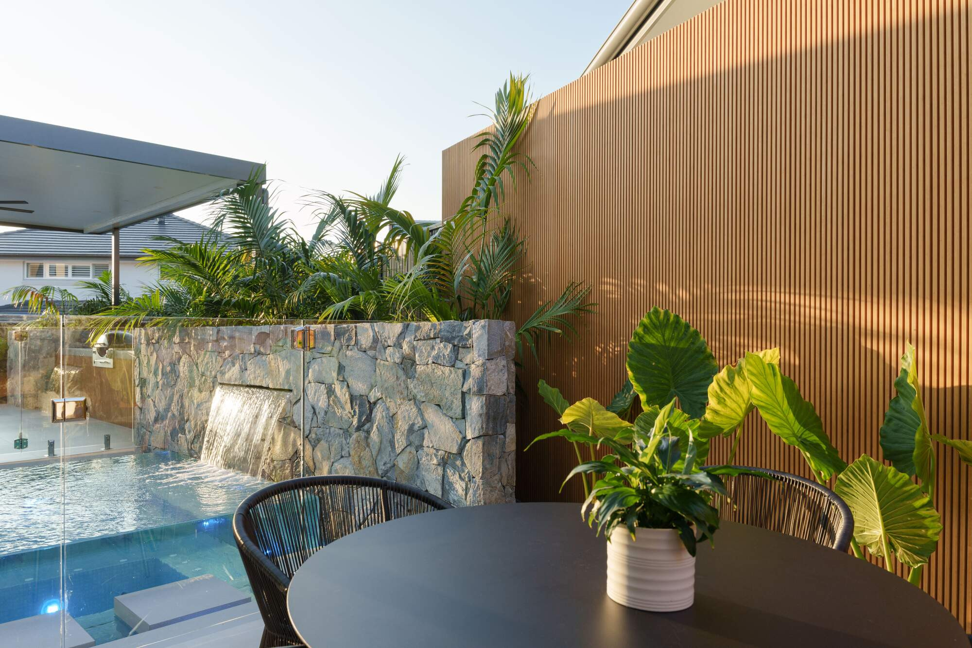 When you can't have a house on the coast you can just build it in your backyard! This project makes you feel like you have rented a spectacular air bnb in Port Douglas! A beautiful heated pool and spa to use all year round that makes you feel like you're in paradise. Surrounded by leafy palms, this airy space is built for enjoyment, relaxing and entertaining all at once with all the bells and whistles a touch of a button away.