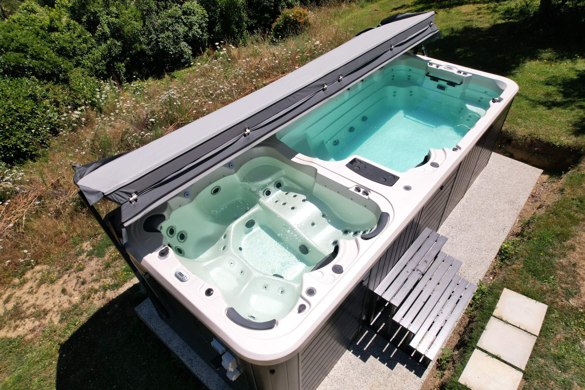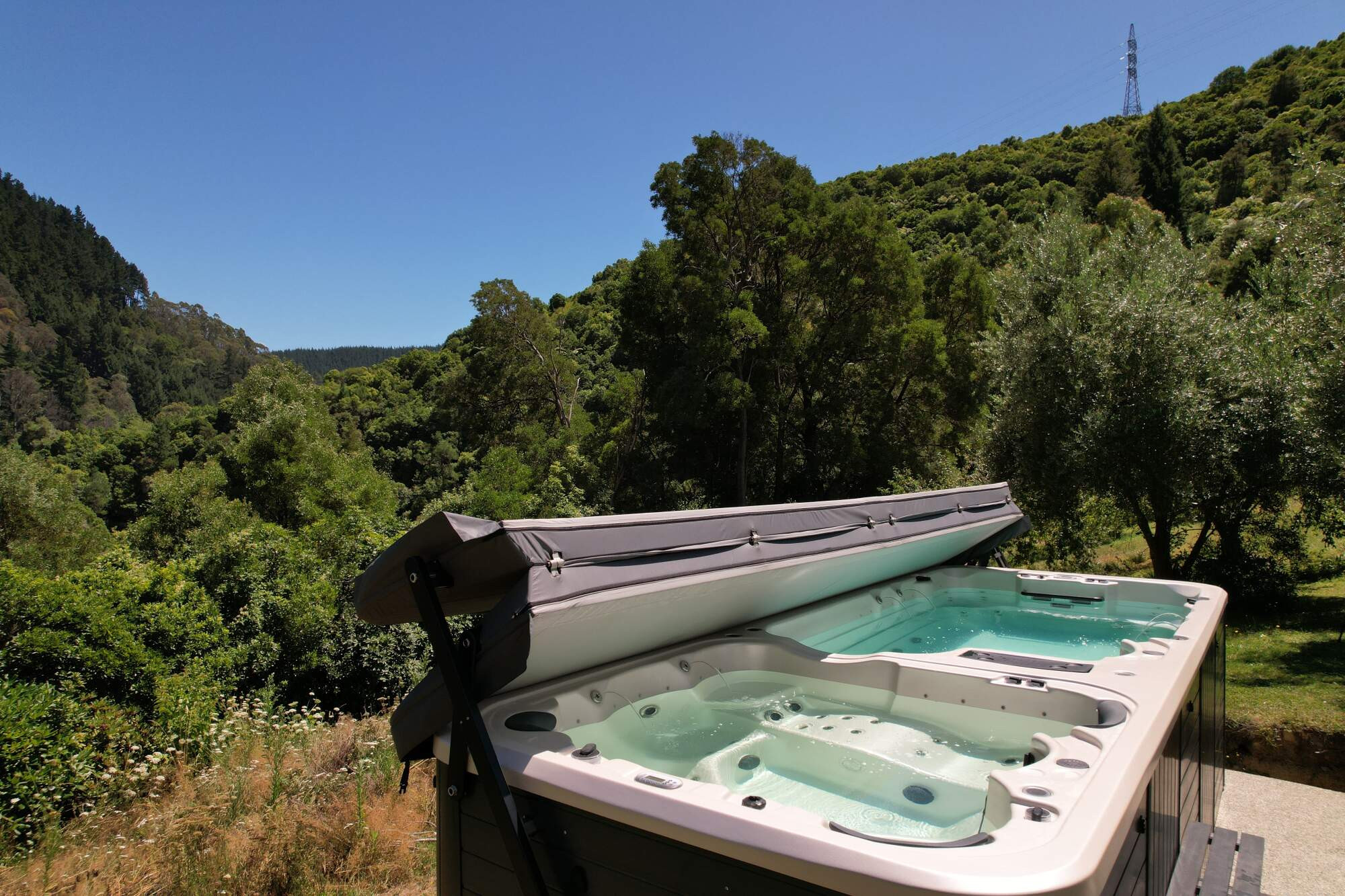 This large dual zone swim spa is set on the edge of this customers property to maximise the breath-taking views across the valley while swimming, relaxing or spending quality time as a family.