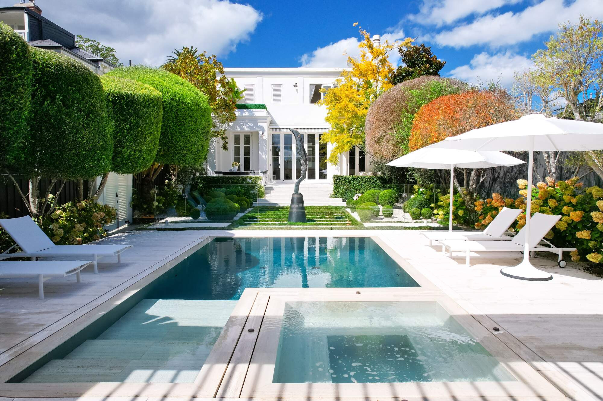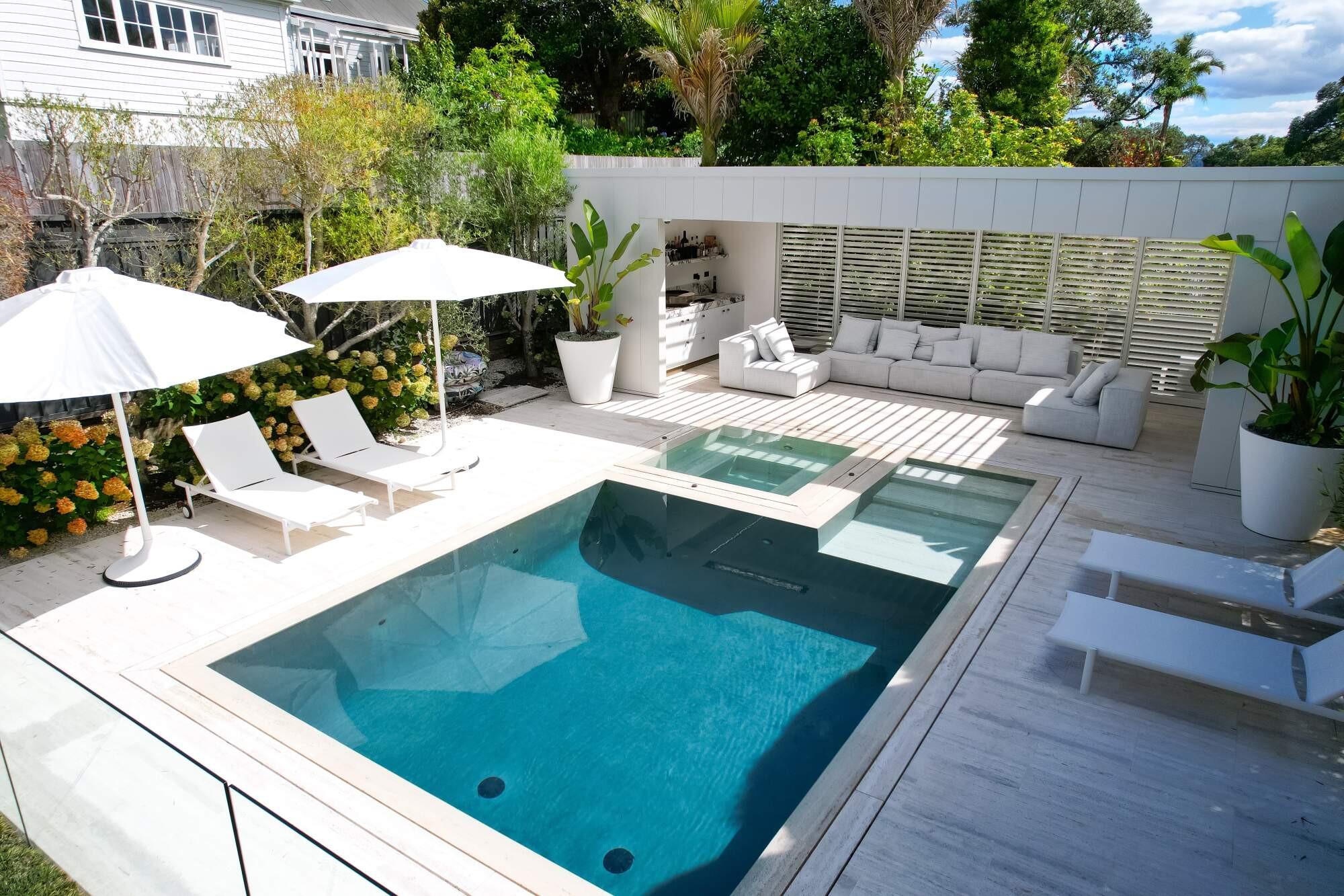 This exclusive hideaway in Herne Bay is simply stunning. Requiring meticulous structural engineering and solid construction methodologies this project is sophisticated in appearance with unparalleled structural requirements below. The intricate flush edge, with hidden dividers between the two bodies of water, this pool and spa is an unrivalled feature within an immaculate urban garden setting with manicured plants and trees, fully equipped cabana, and sculptural art.