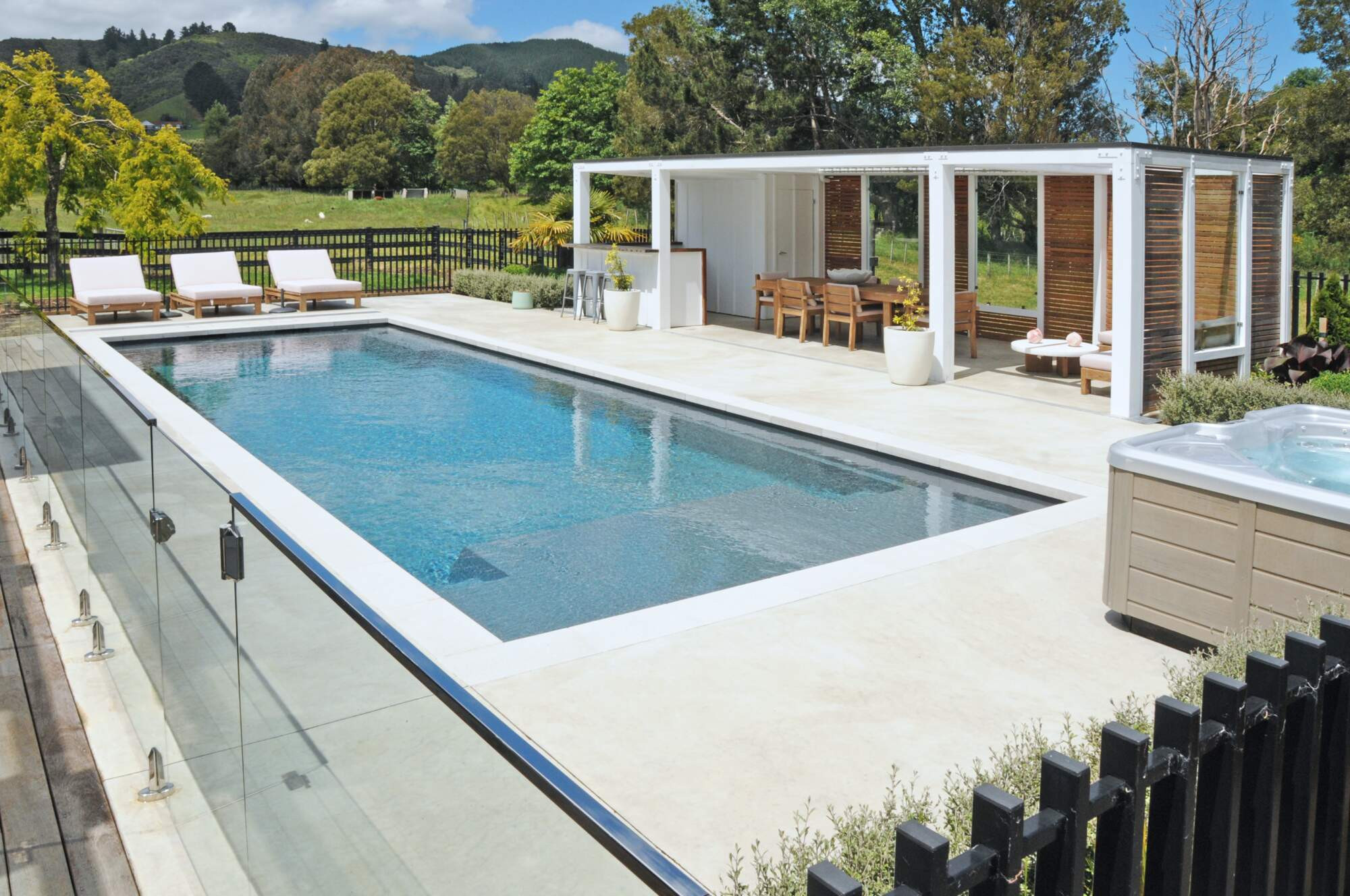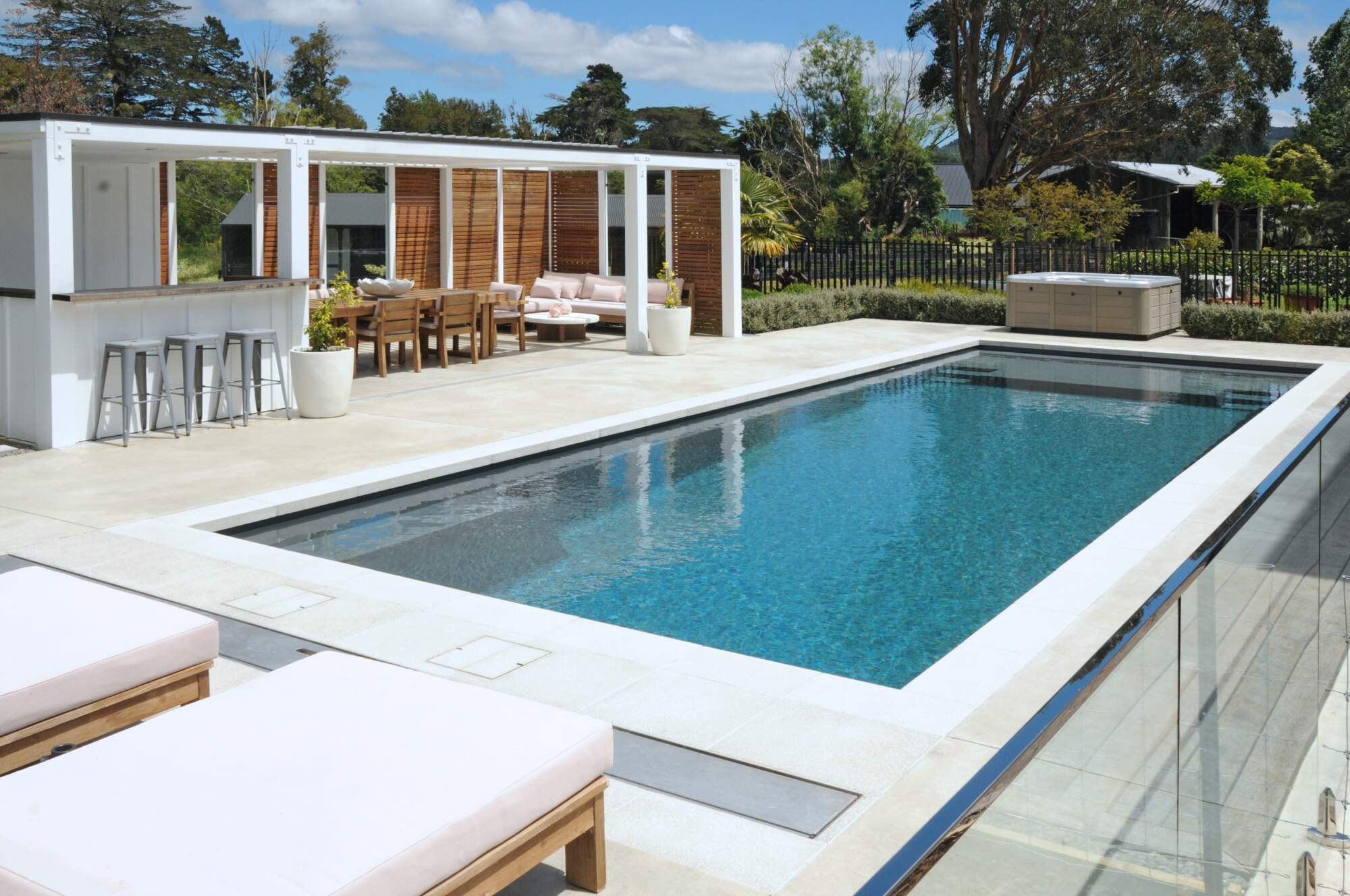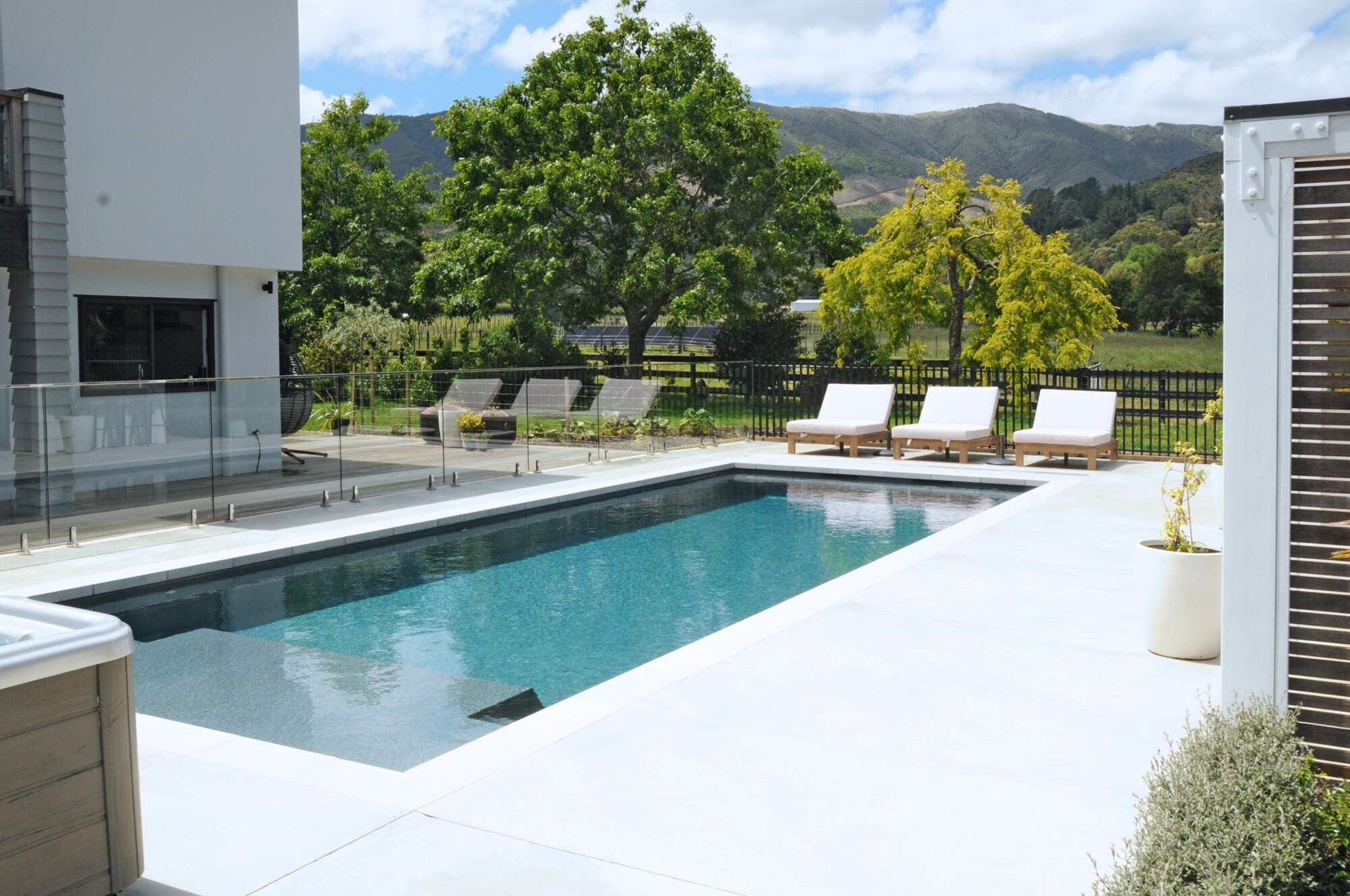 We loved working with this fun couple to create a resort looking pool area that they totally love. Our clients can relax in their pool area and watch over their rescued goats who happily graze just over the fence by the pool. One of our favourite pool builds ever.