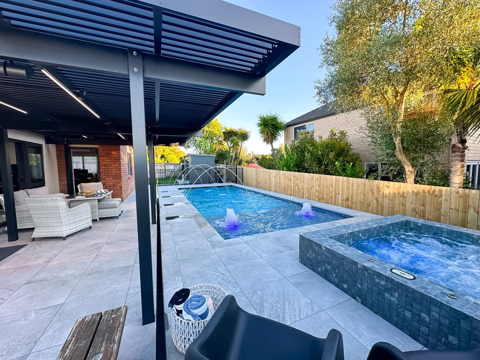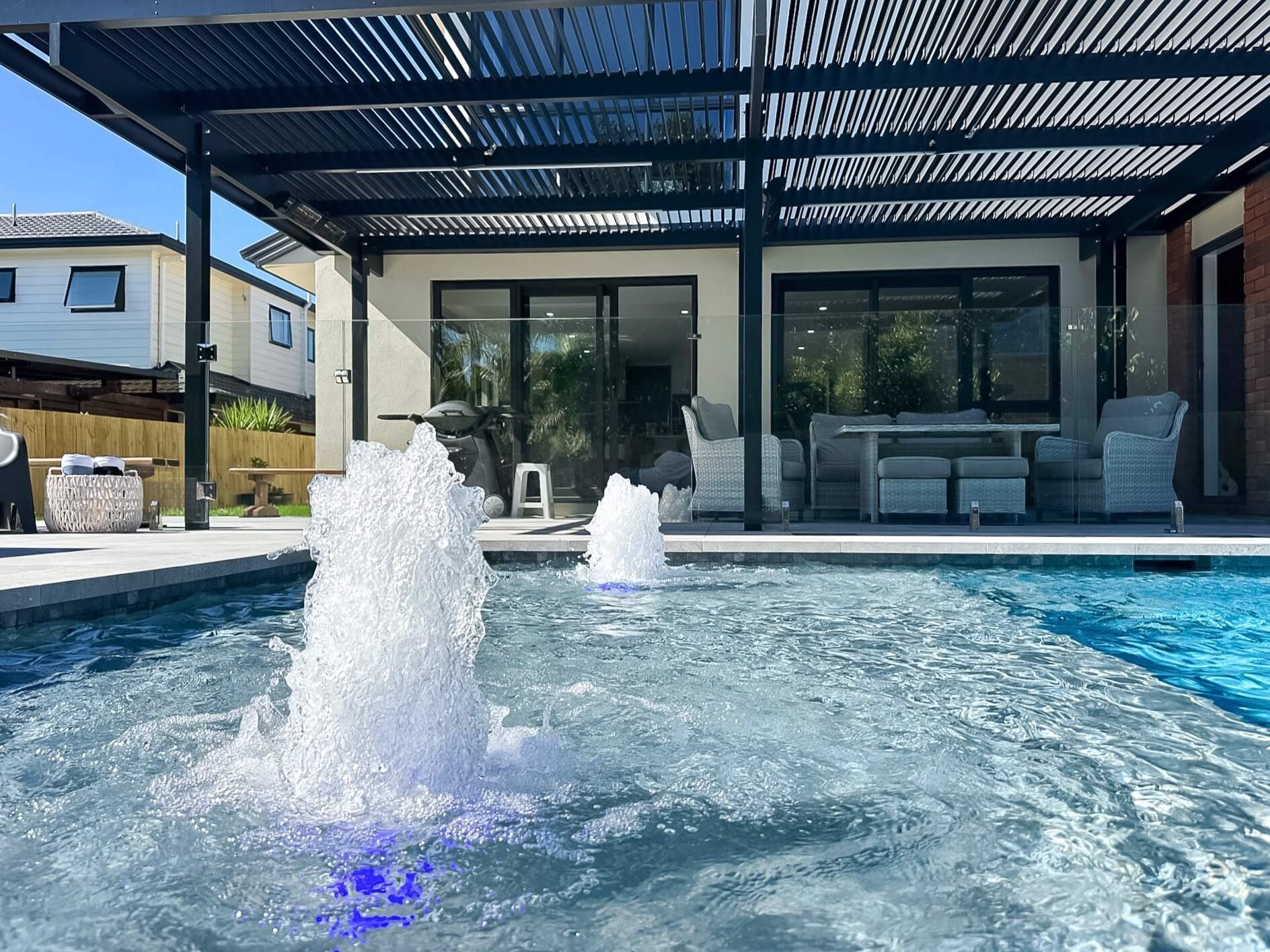 This fully featured swimming pool includes some unique water features including a blower, light boosted bubblers and laminar jets.