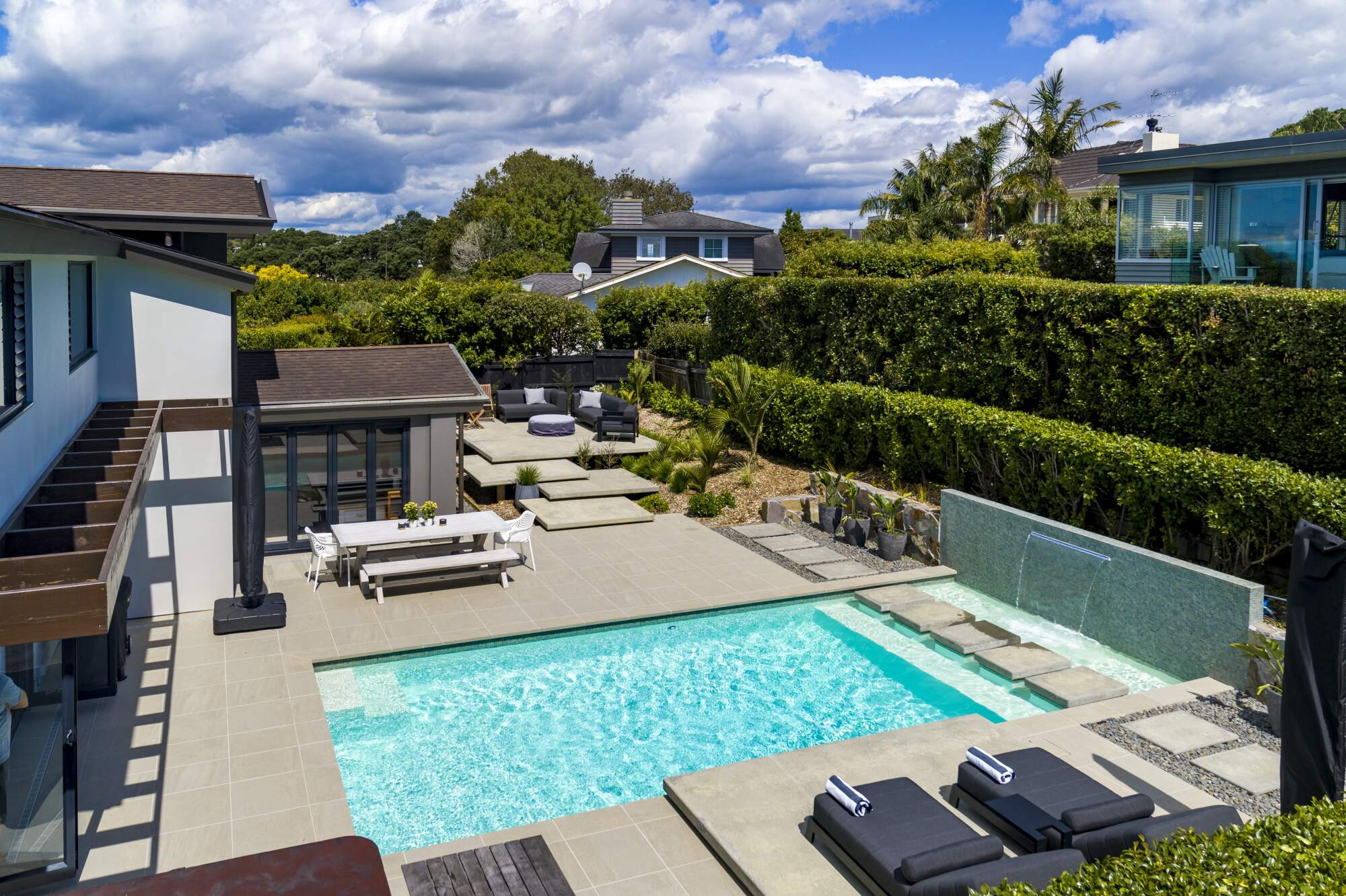 With the clever use of different materials and heights both around and within the pool, this renovation is a visual feast of modern minimal – and functional – design.