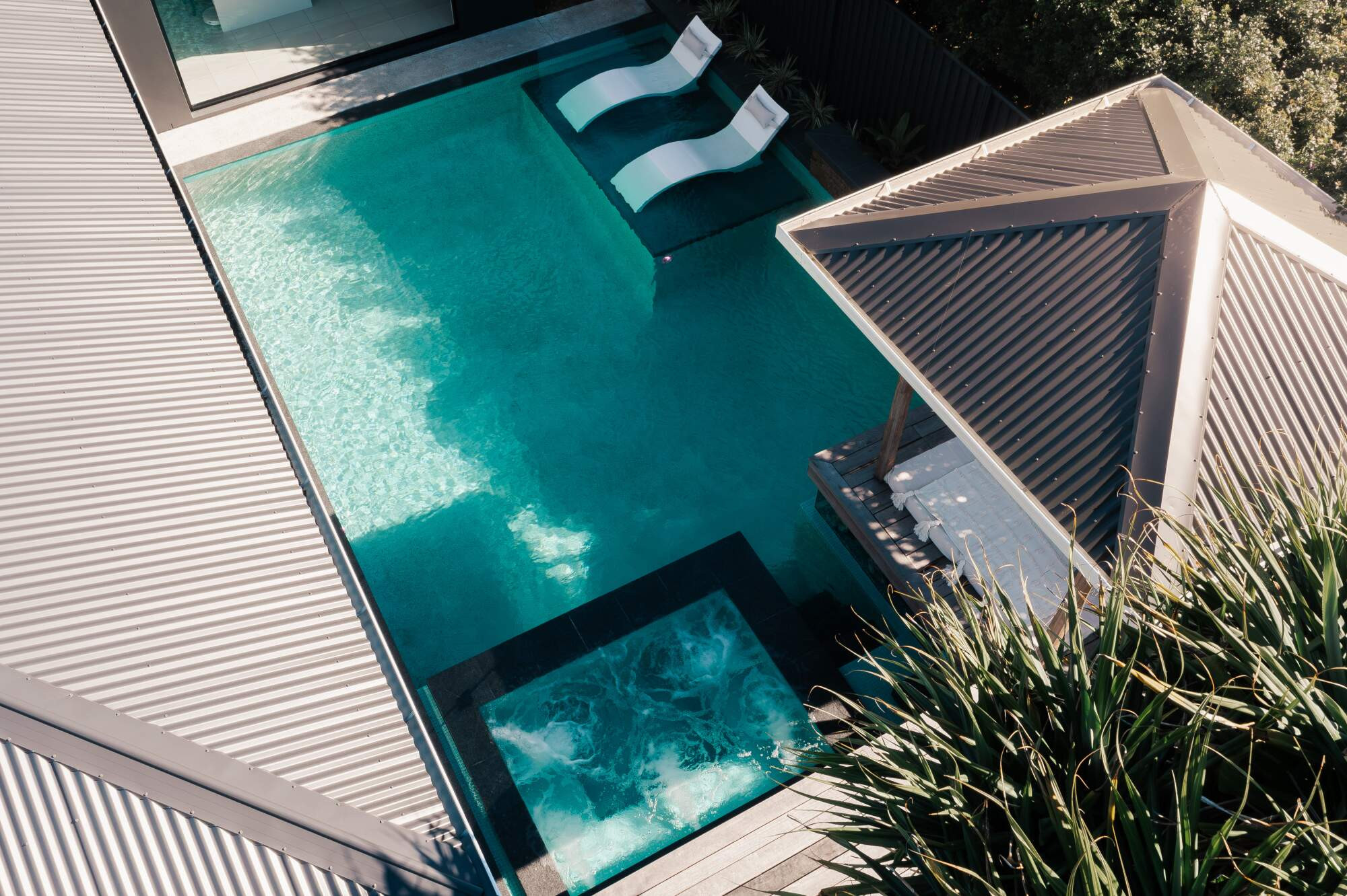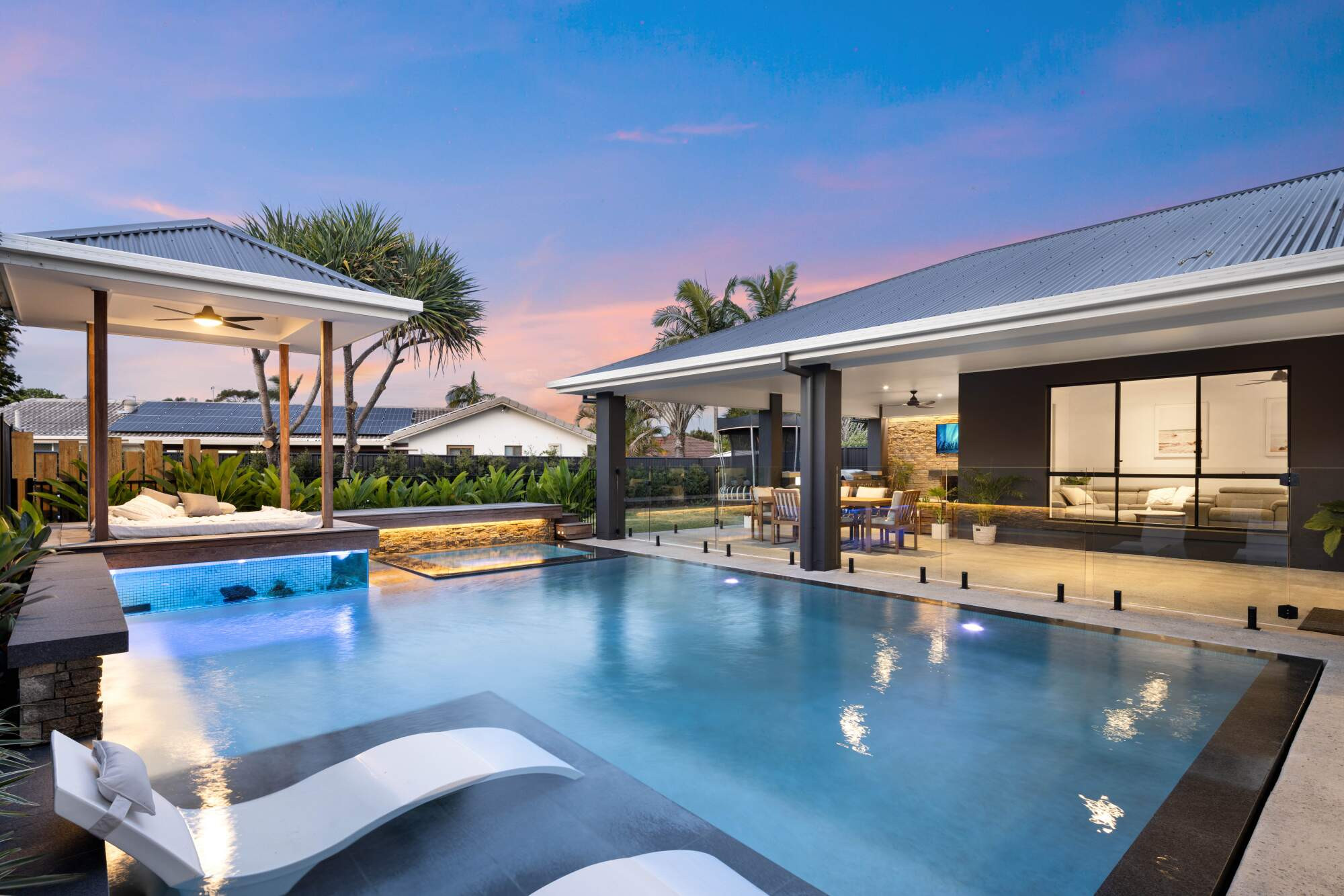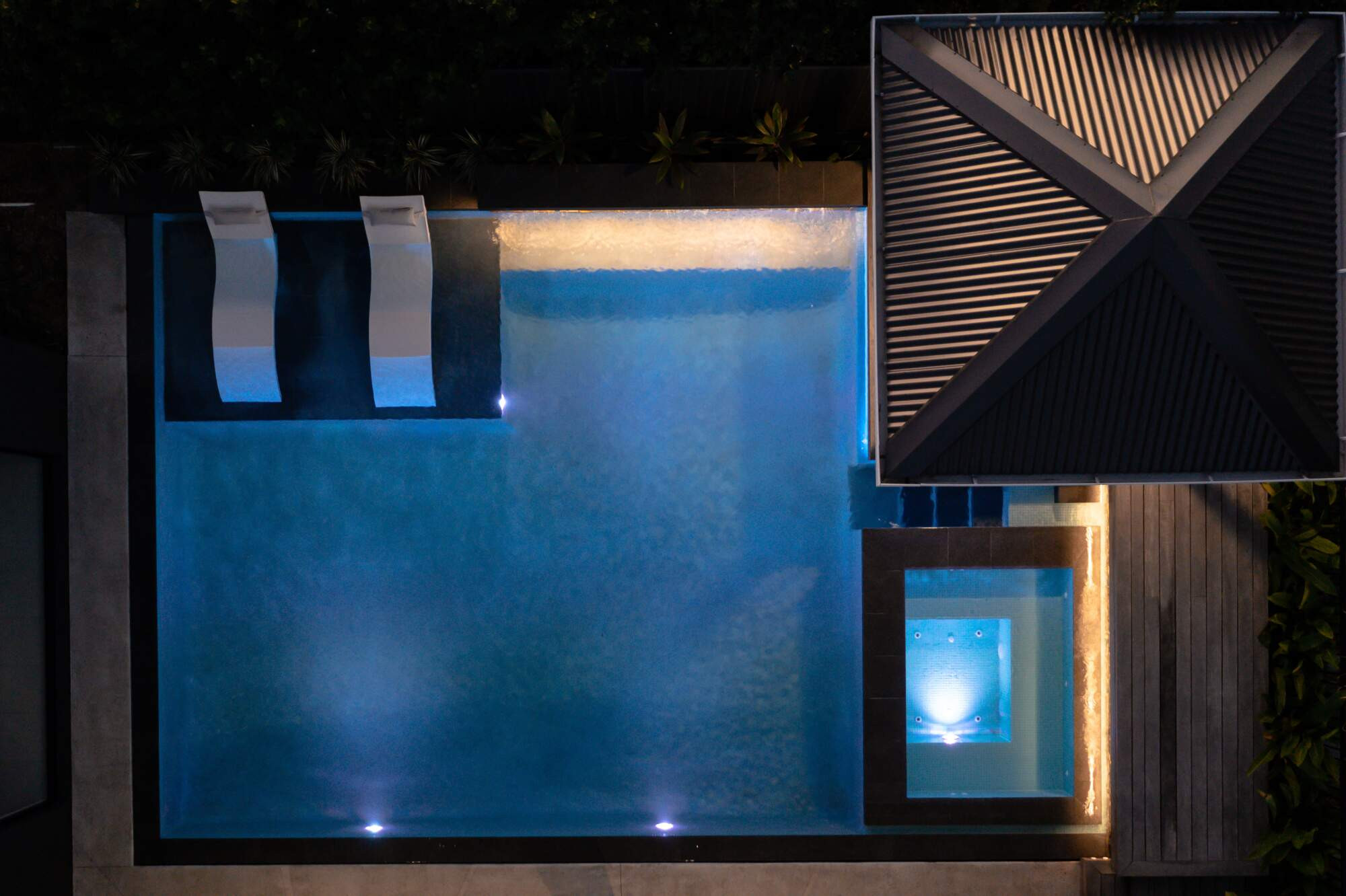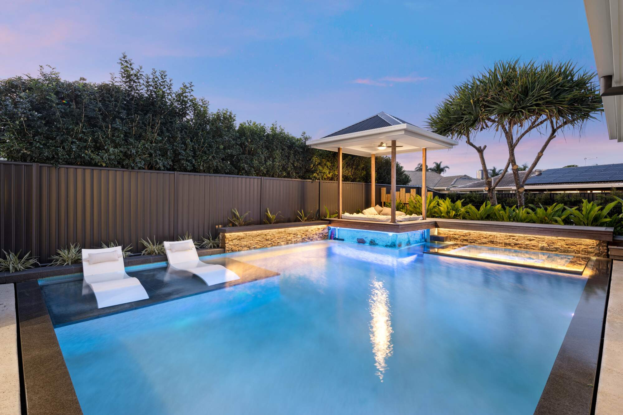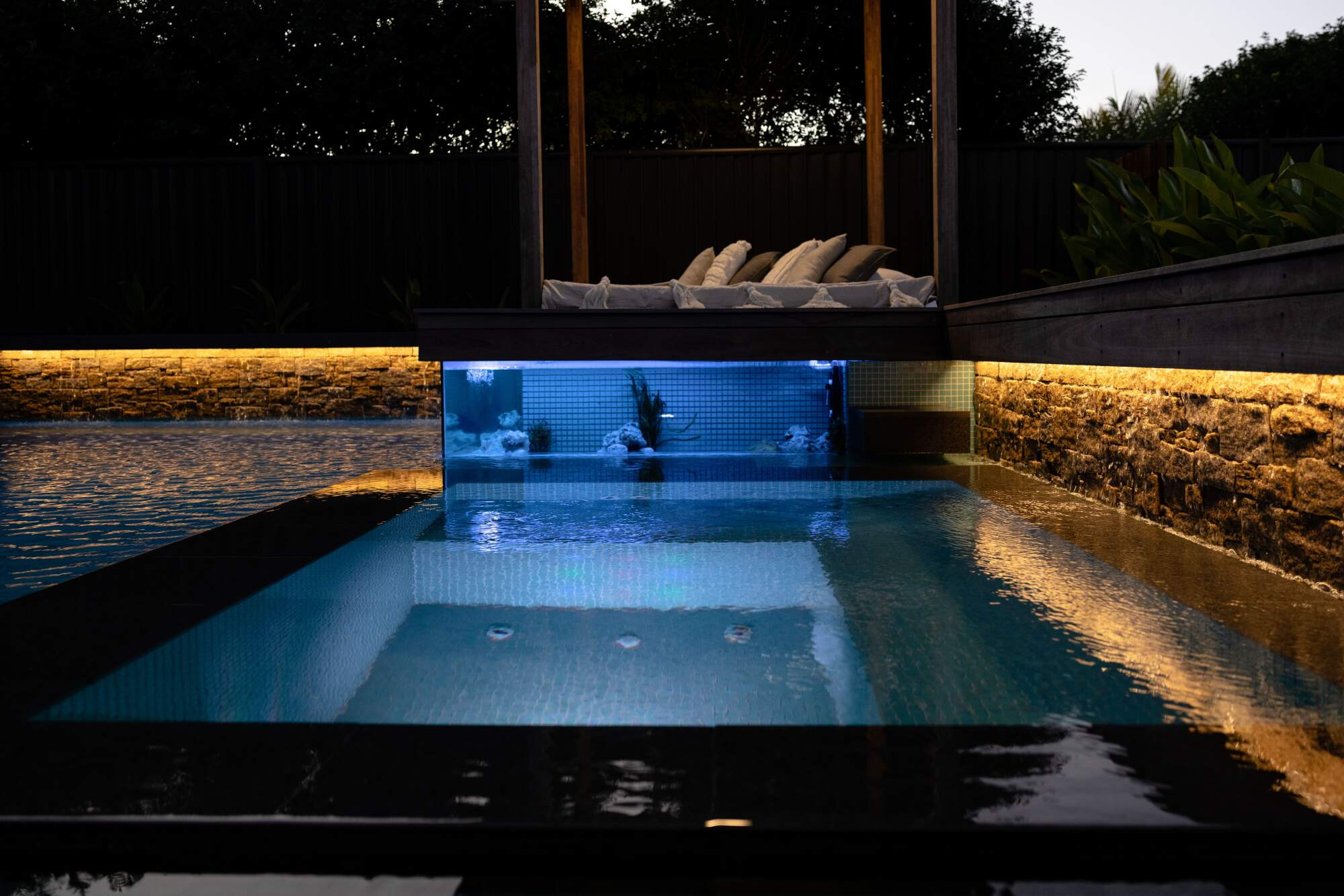 This project challenged out team from the design all the way through the construction as we needed to create the level and structures to allow water flow from above and below the pool. Adding the fish tank was a gamble as it was a first for us but it made the project 1000% better and to hear the house is known for the pool with a fish tank is very cool