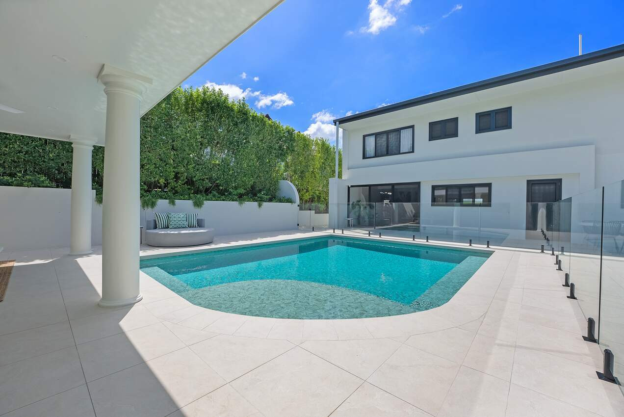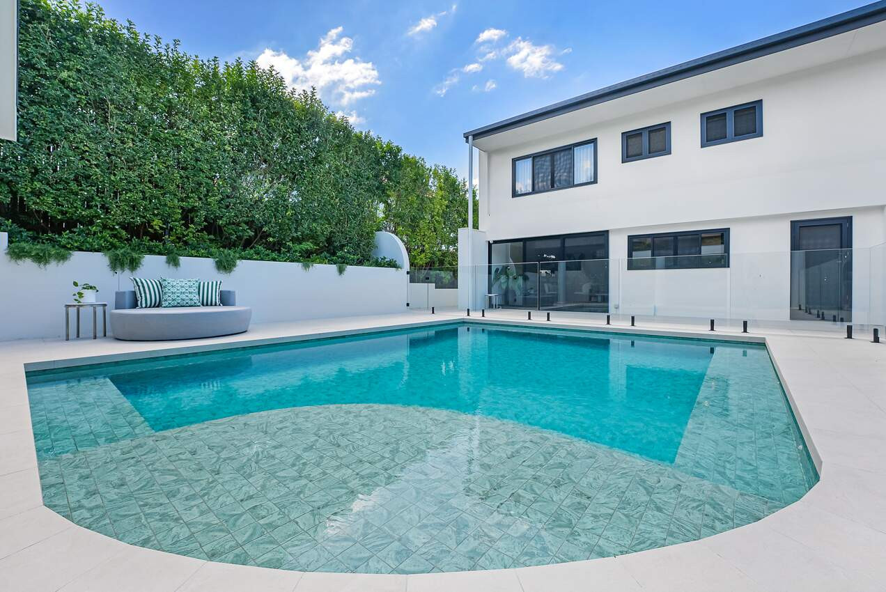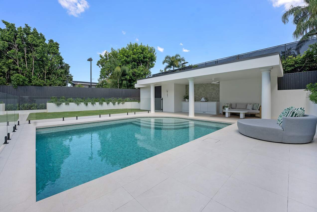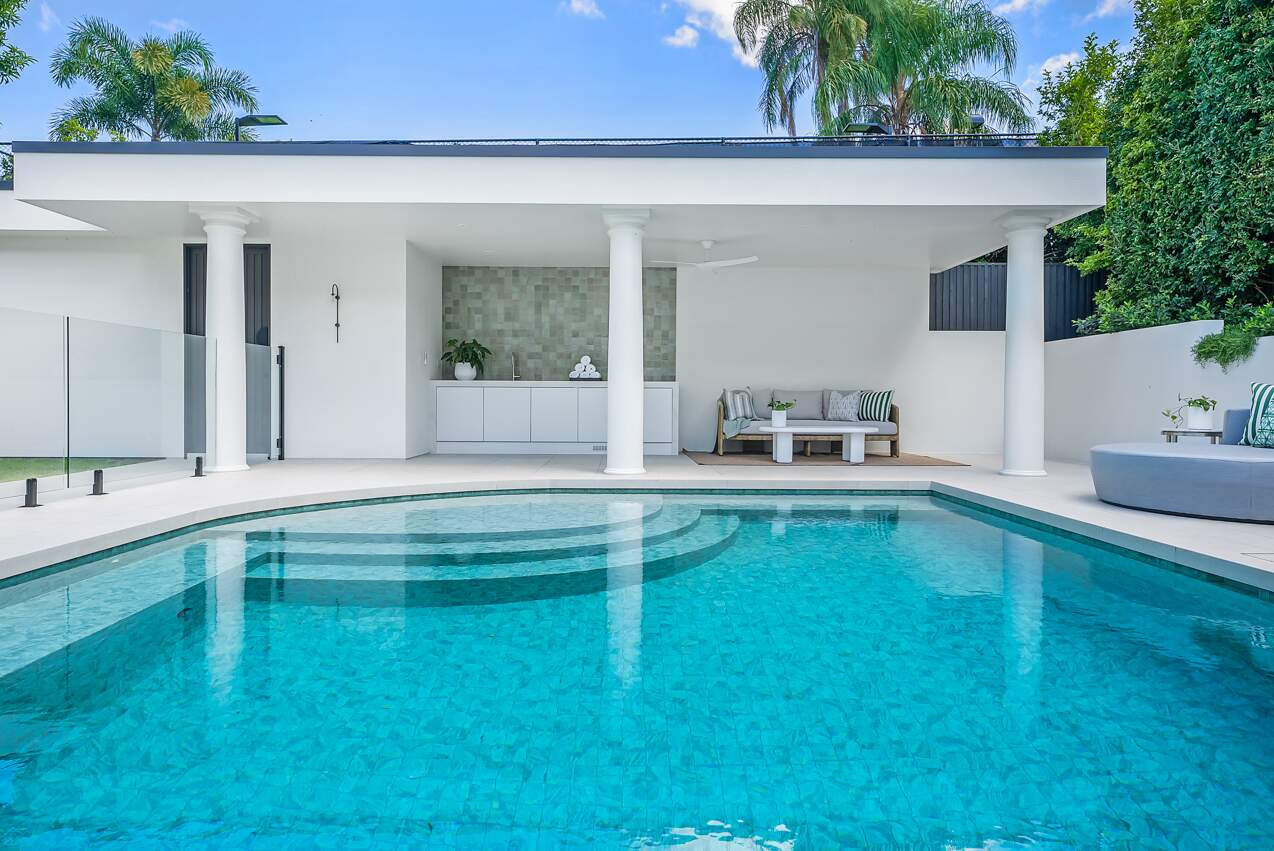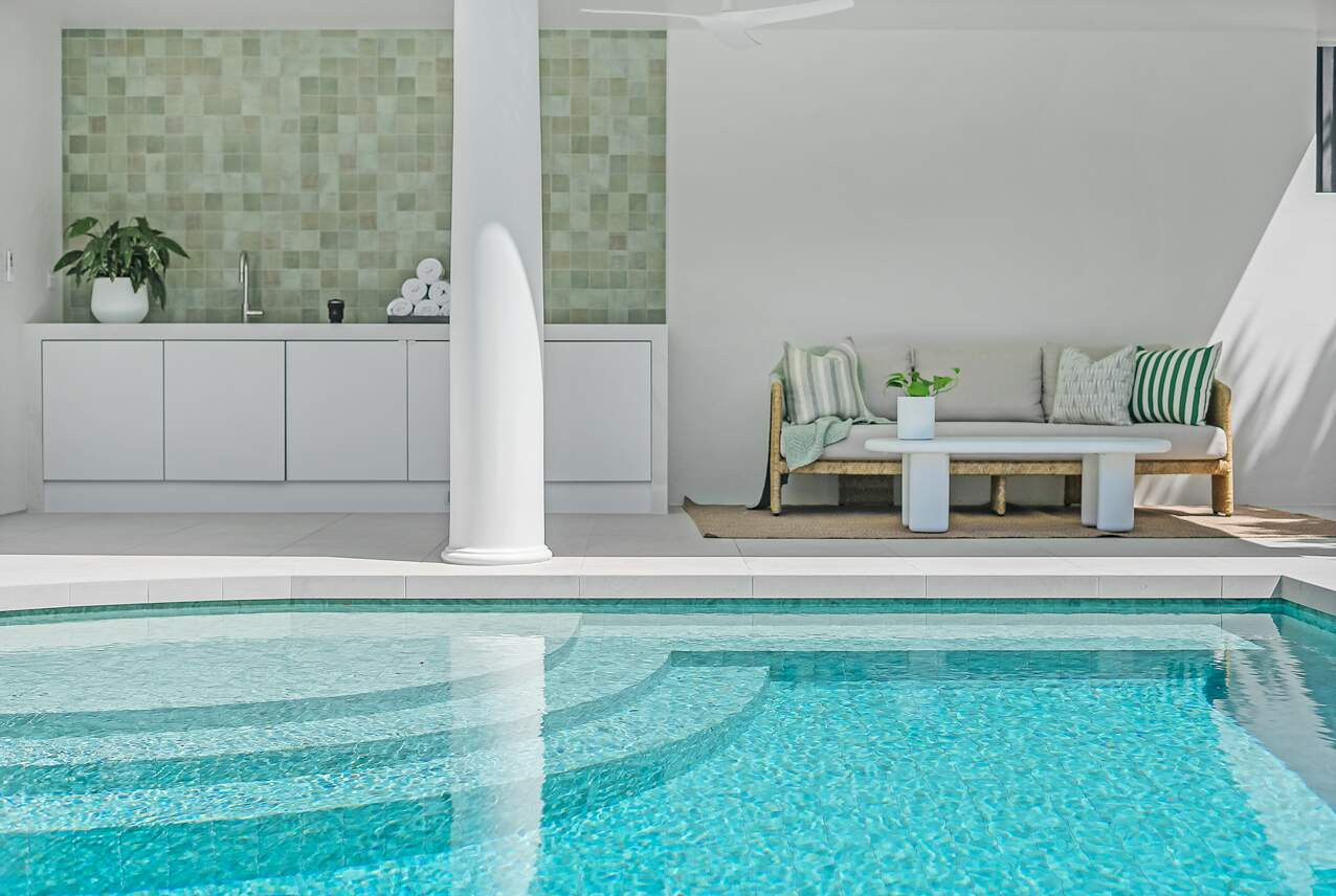 This custom design adds luxury and style to this gorgeous space. The pools greatest feature is the eye capturing Sukabumi Ceramic Mosaic which fully lines the interior. Gentle curves of the circular steps, clean lines and glass fencing permits a clear view from the custom built pool house to the pool. An inviting and lavish entertaining area for the clients to enjoy.