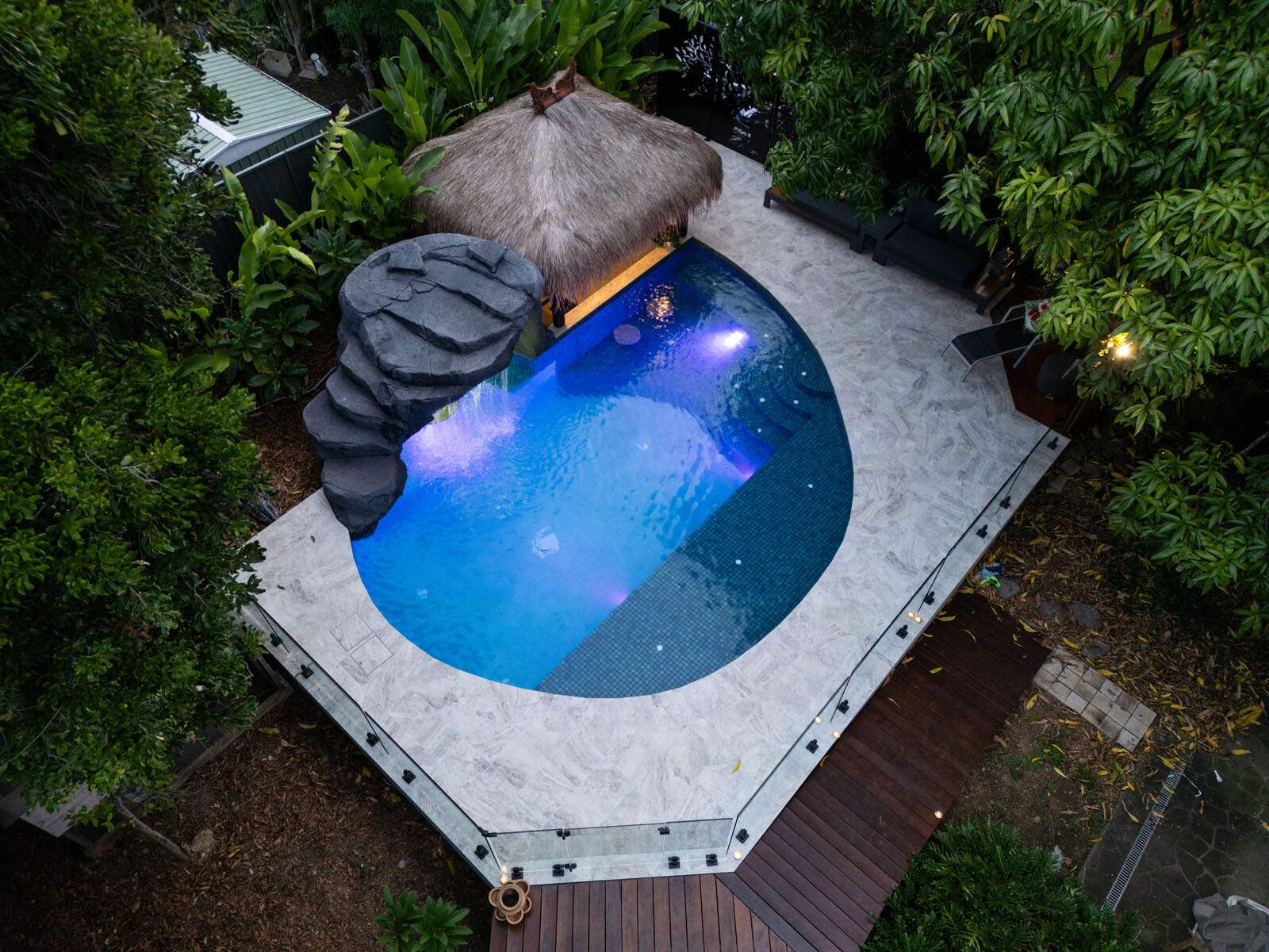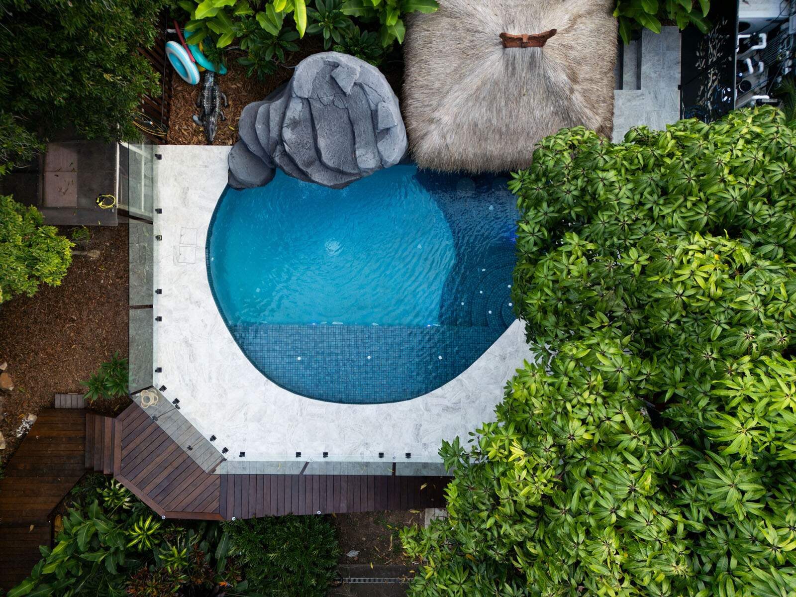 This freeform pool is the very definition of a hidden oasis. Complete with a rock grotto, cascading waterfall and a swim-up bar, this space is the perfect place to unwind after a busy week and to entertain family and friends. A resort worthy pool right at their back door.