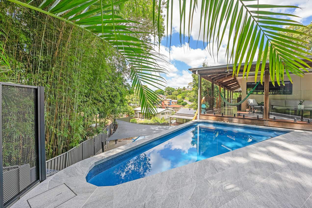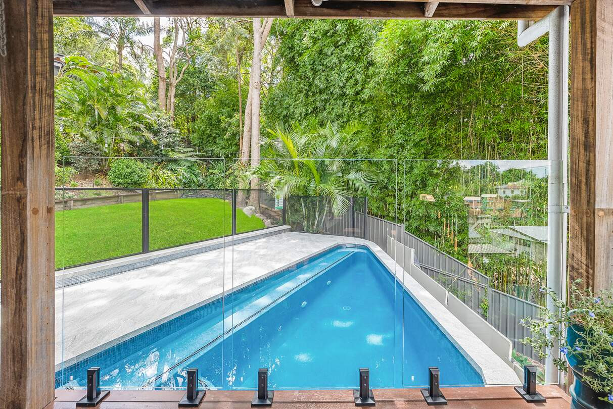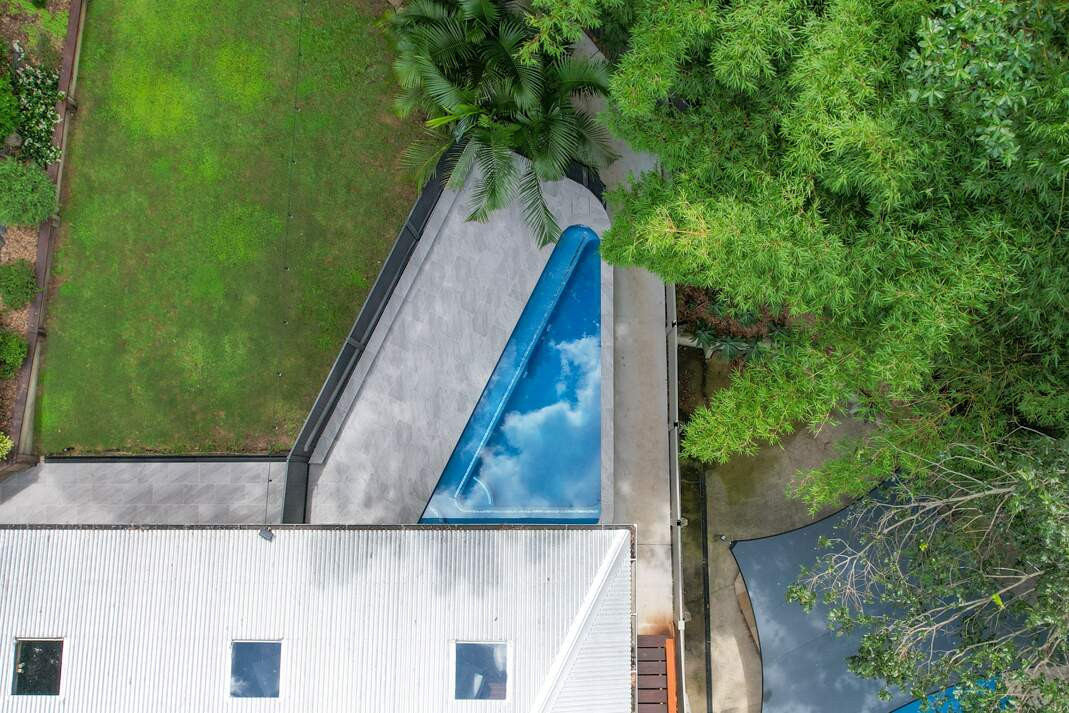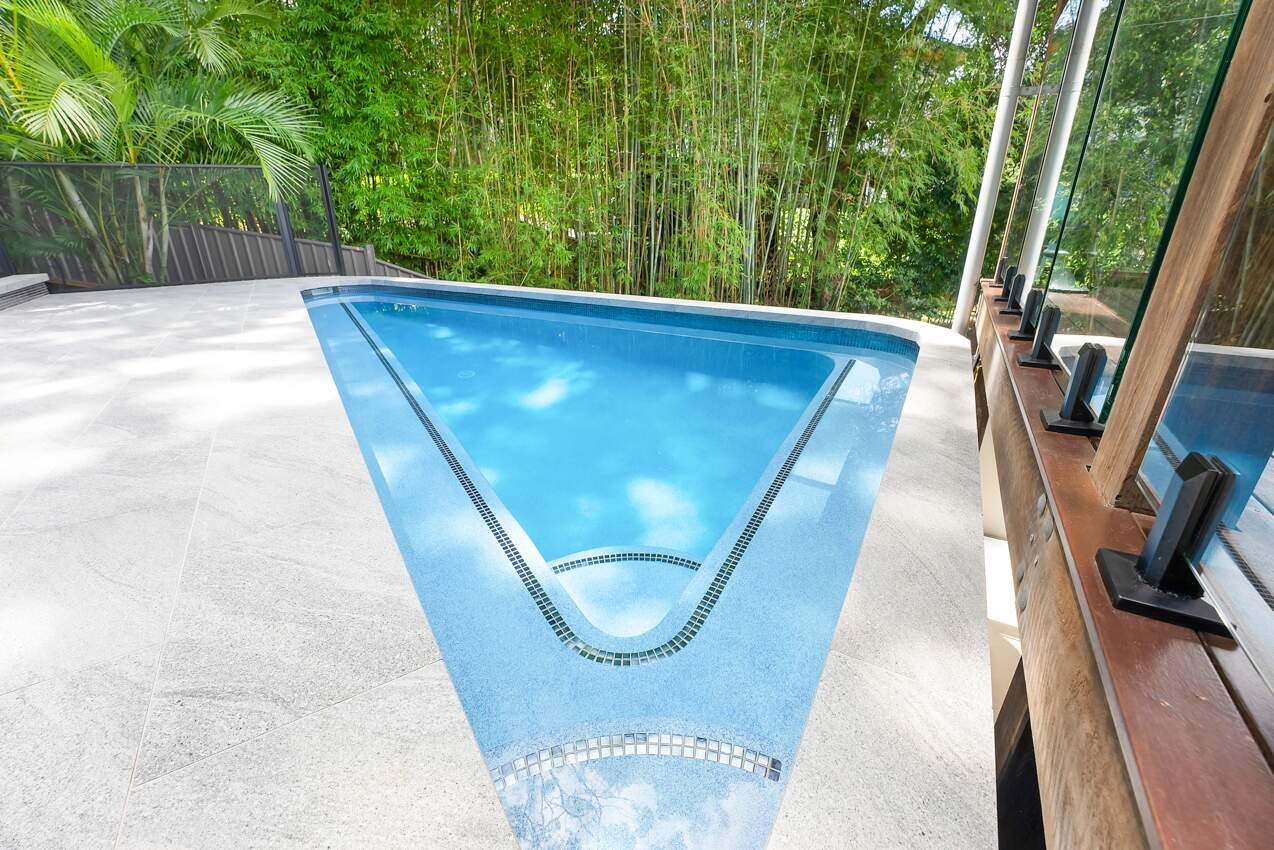 The uniquely designed soft-edged triangular pool. Elevated over 2 meters above ground level, this stunning creation has transformed a previously overlooked space into a visual spectacle. With its sleek lines and soft edges, this pool is a striking centrepiece that adds a touch of modern elegance. But it's not just about aesthetics – our innovative design also maximizes functionality, creating a versatile space for relaxation and recreation.