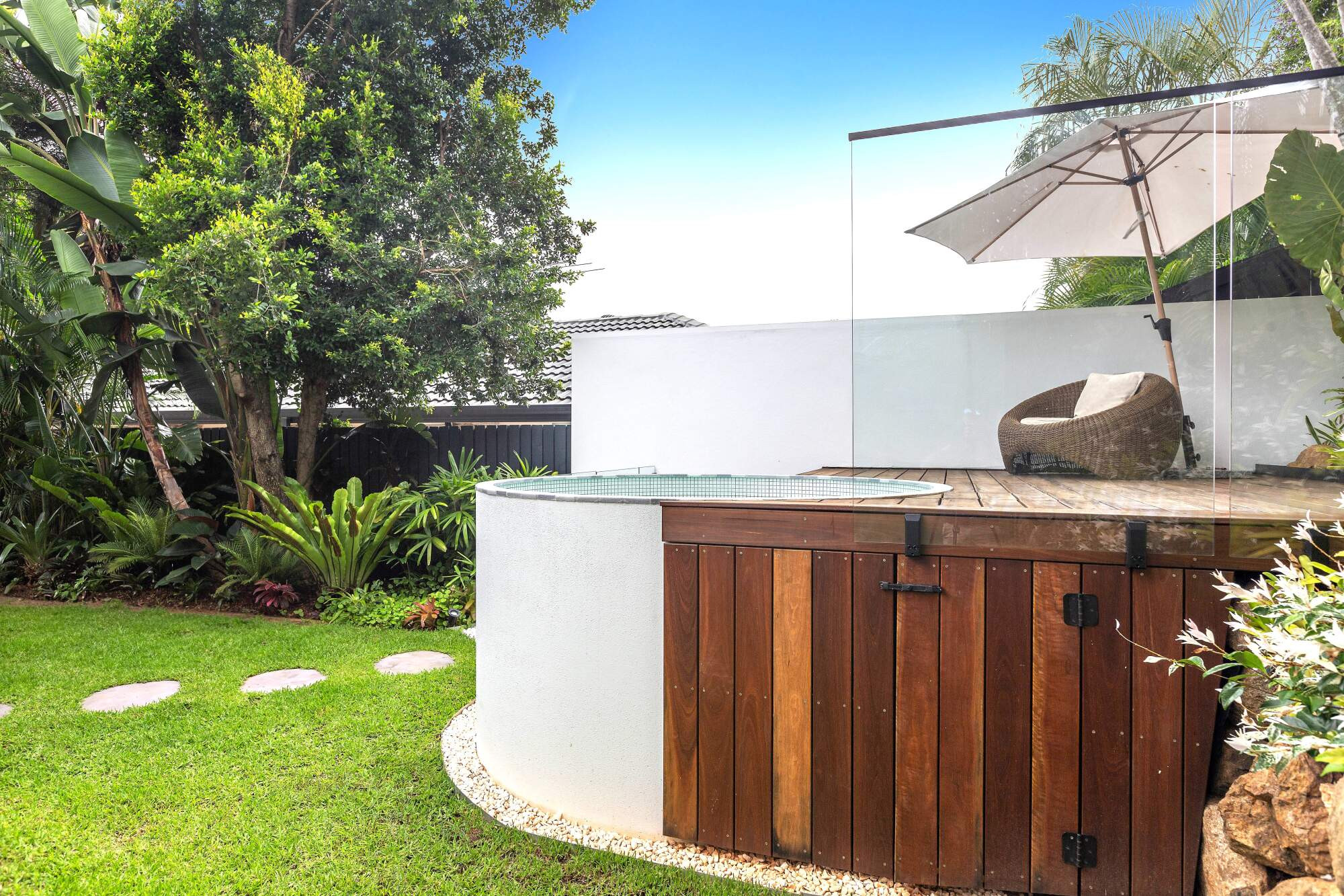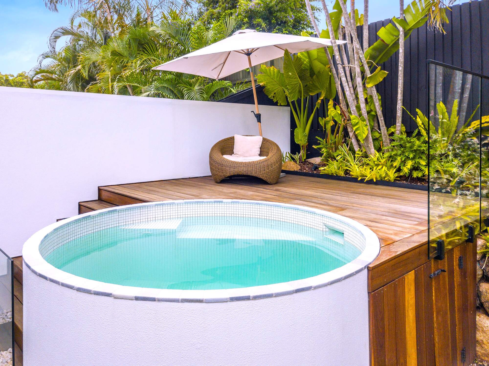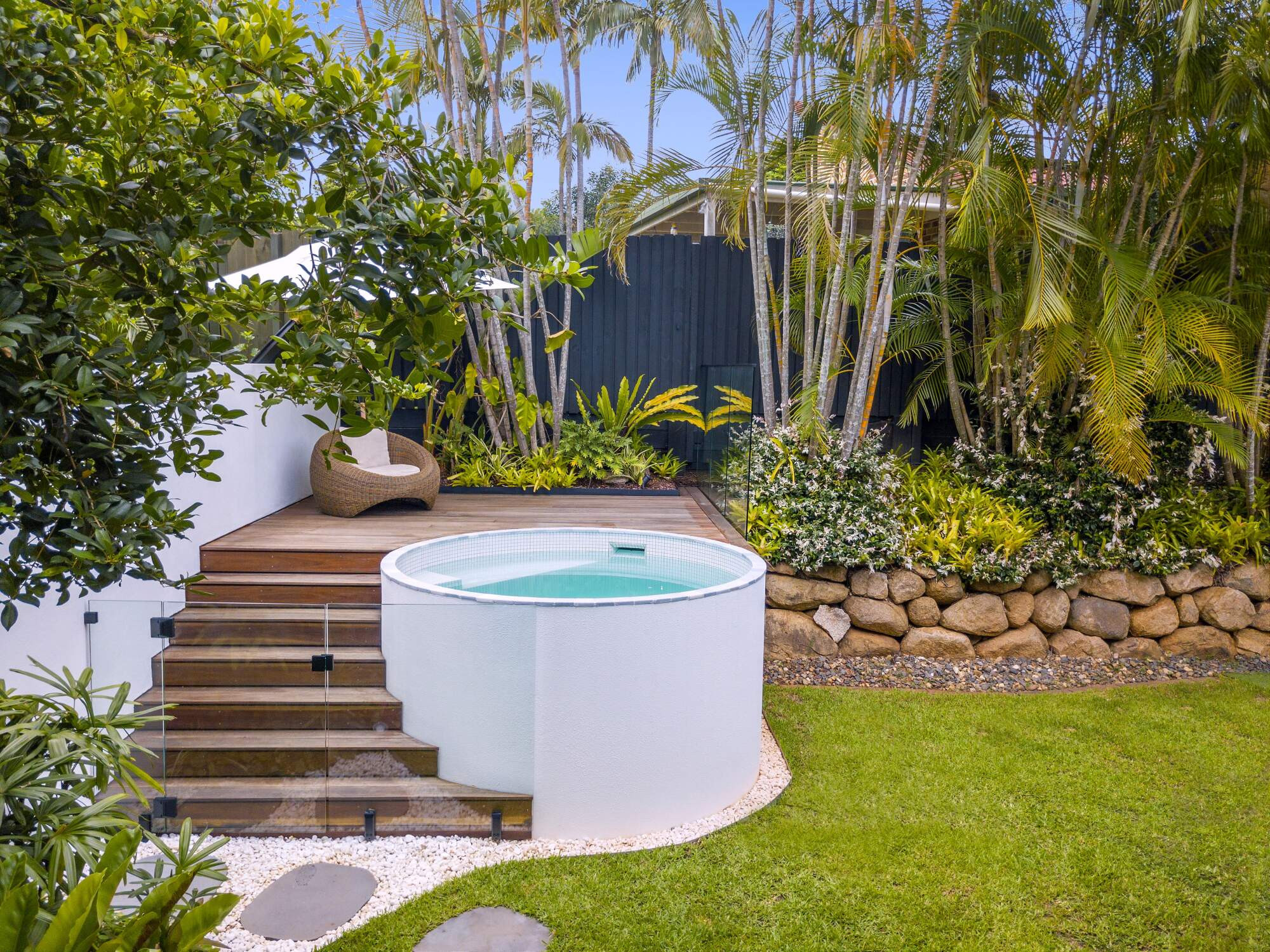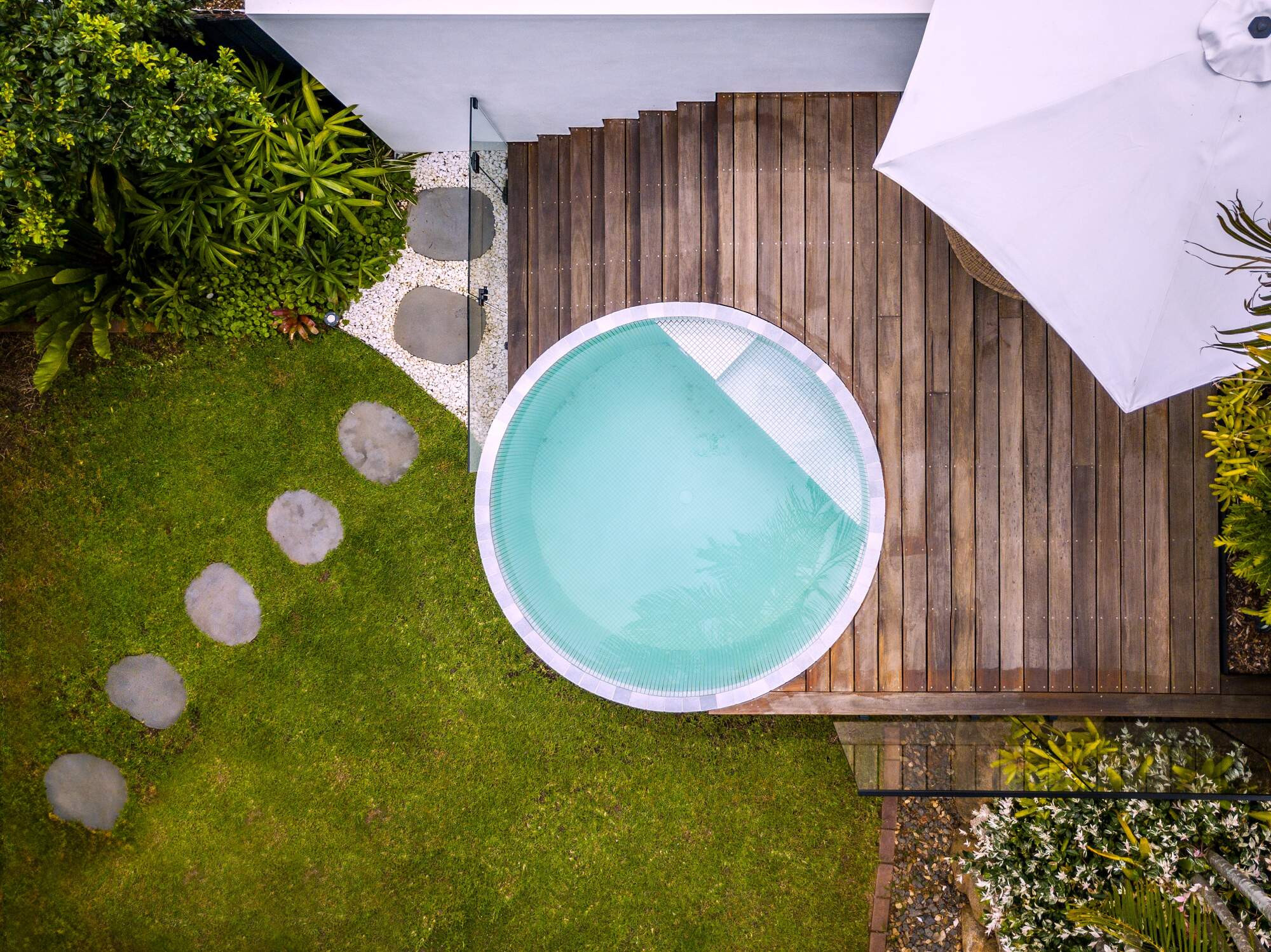 This stunning circular pool oozes relaxed sophistication and is both visually stunning and practical, using well-crafted, carefully chosen materials. The decking and foliage achieve a perfect balance between hard and soft finishes that effortlessly combine in elegant harmony to form an exceptional outdoor space.