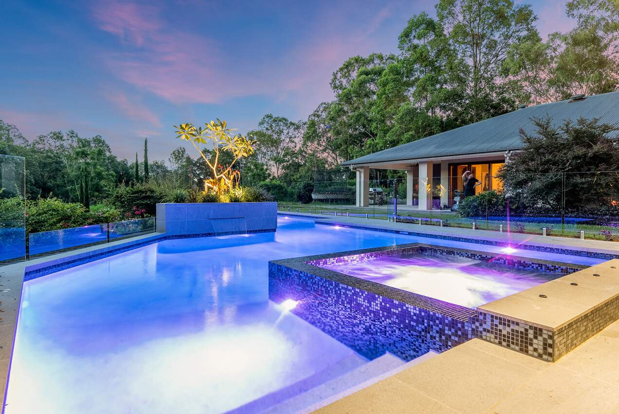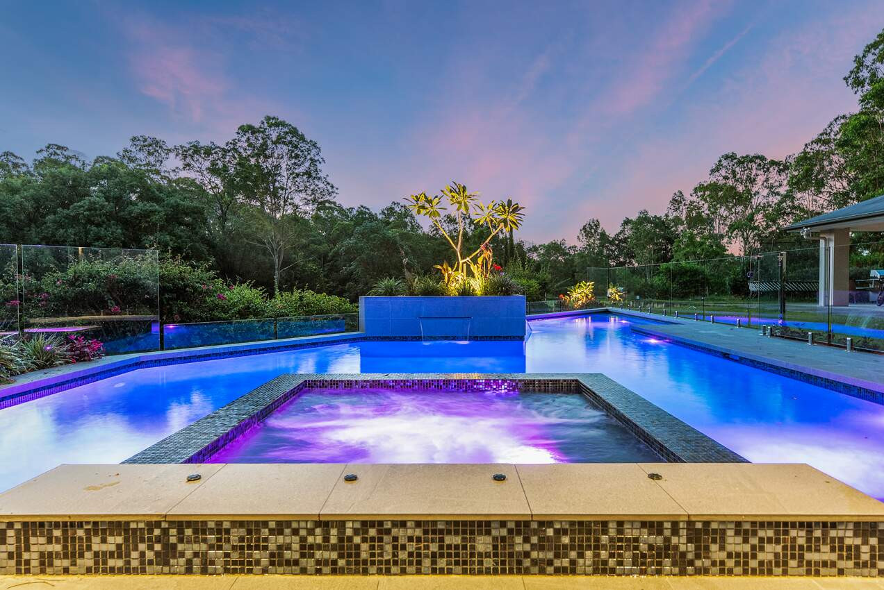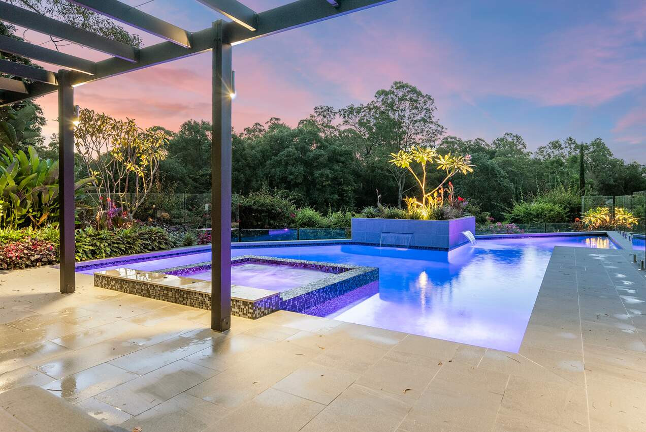 This exquisite pool with fully tiled risen spa boasts a mesmerizing multi-blade water feature and carefully placed lighting throughout, creating an ambiance that is simply unrivaled.