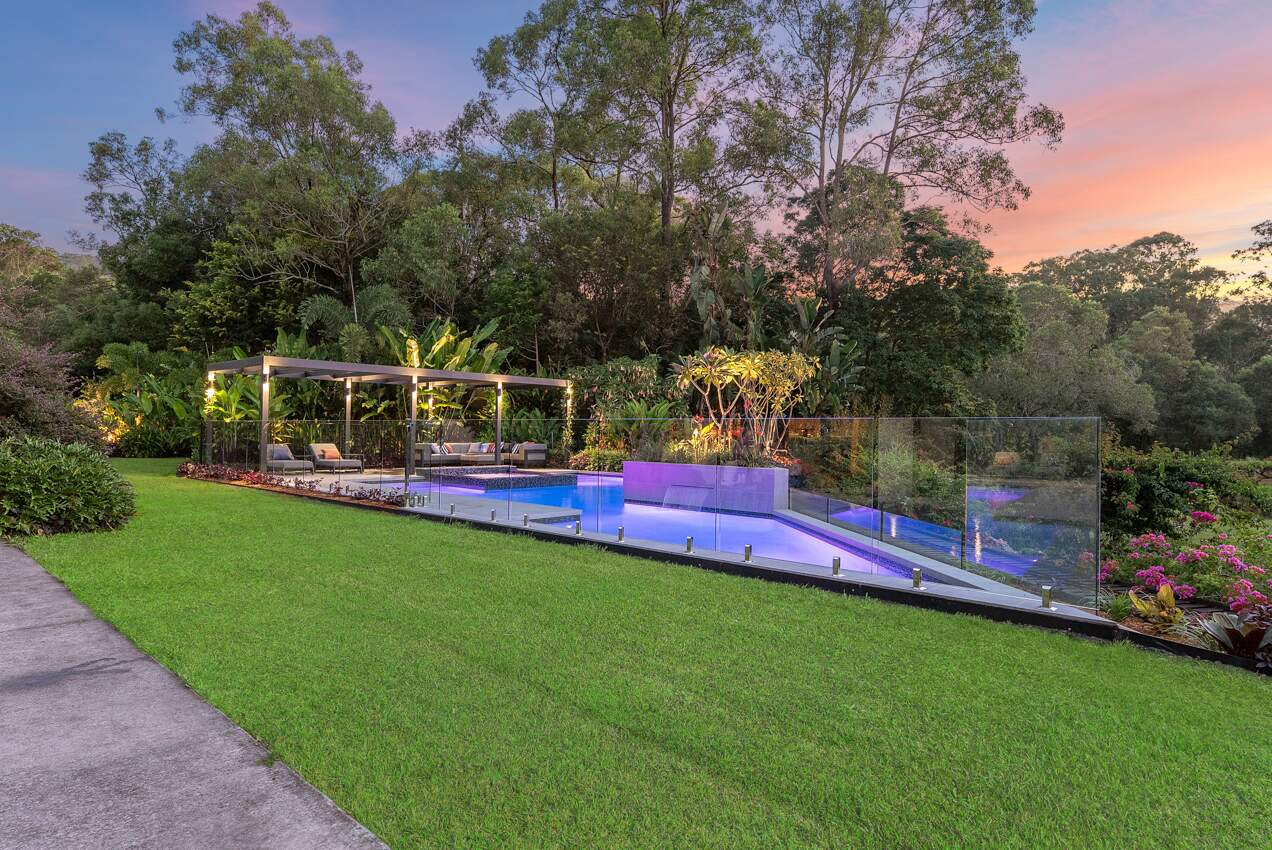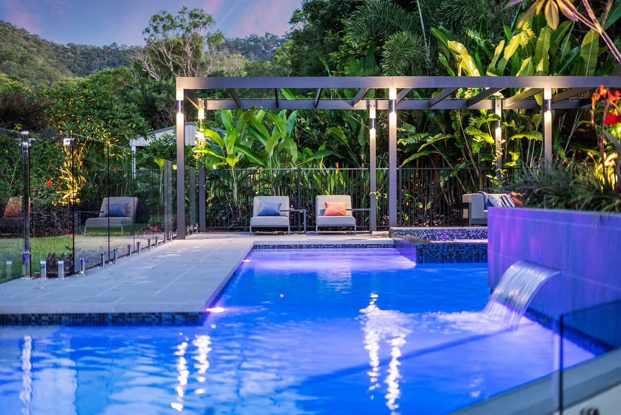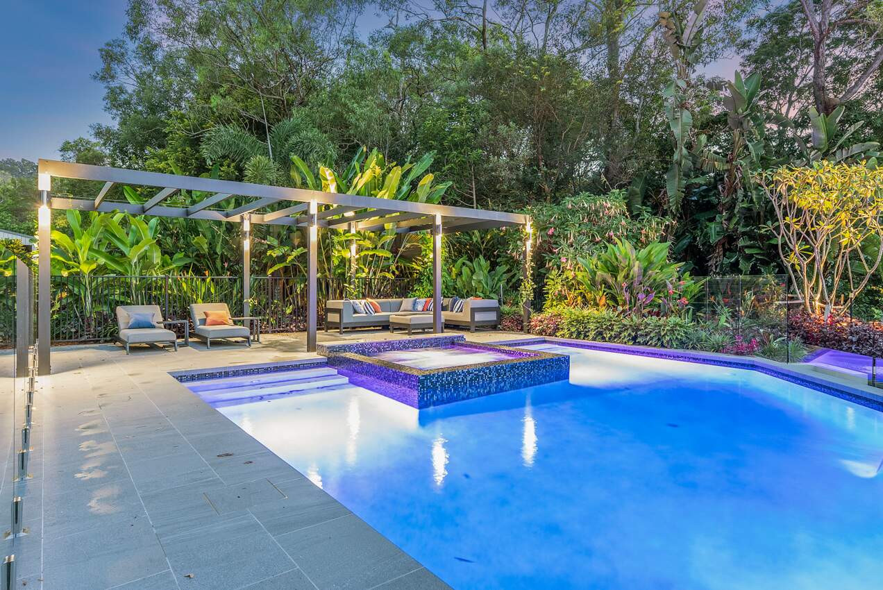 This exquisite pool with fully tiled risen spa boasts a mesmerizing multi-blade water feature and carefully placed lighting throughout, creating an ambiance that is simply unrivaled.