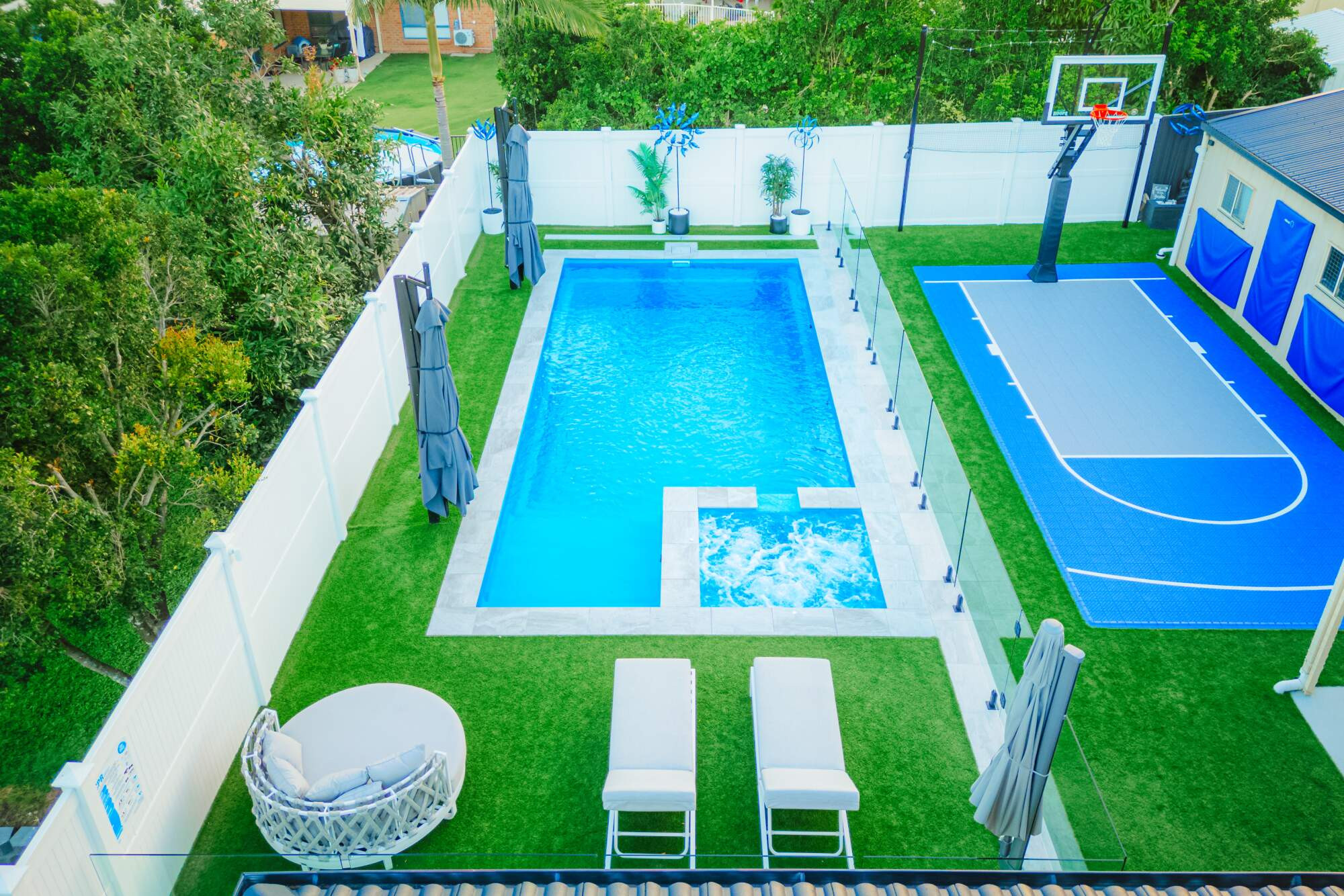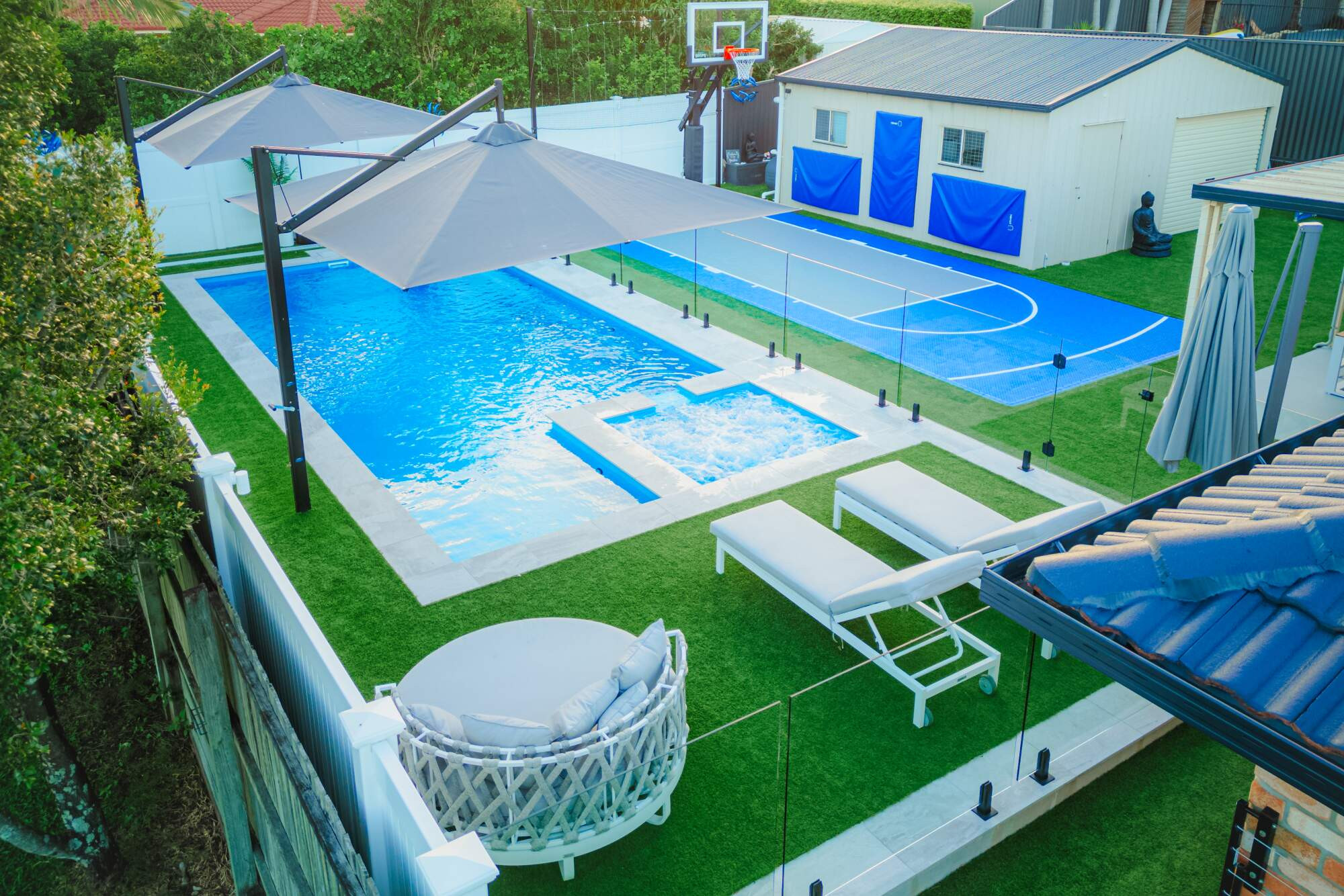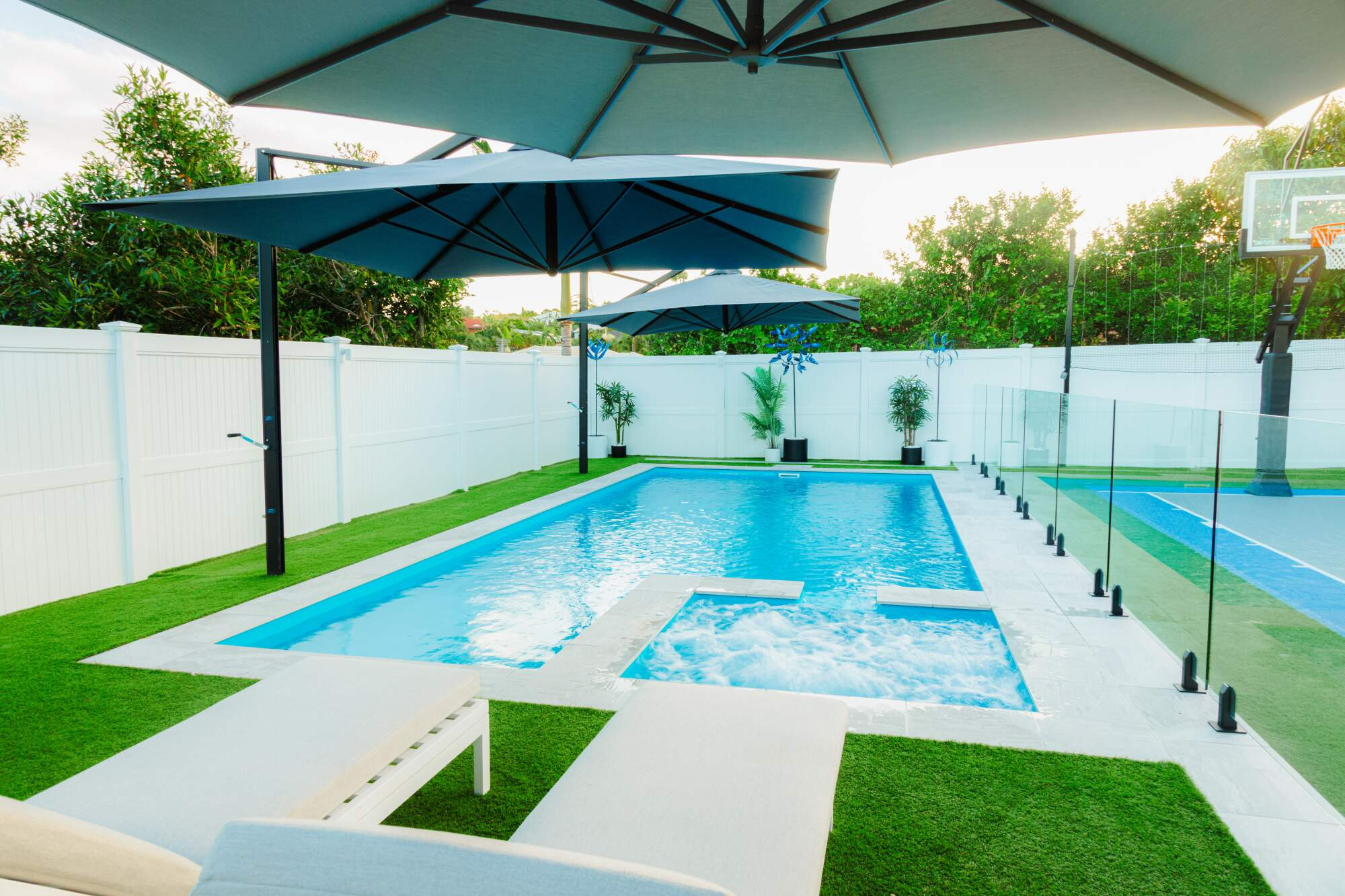 This 9.6 Manhattan pool & spa combo boasts it all. A shallow platform for the small kids, an uninterrupted main swimming pool area & a 6 person spa. To top it all off, the entire pool has been fully automated, all by the touch of a button on your phone. Adding a couple of oversized umbrellas & an underground blanket box, all surrounded by artificial grass... makes this backyard 'resort fantasy' complete!