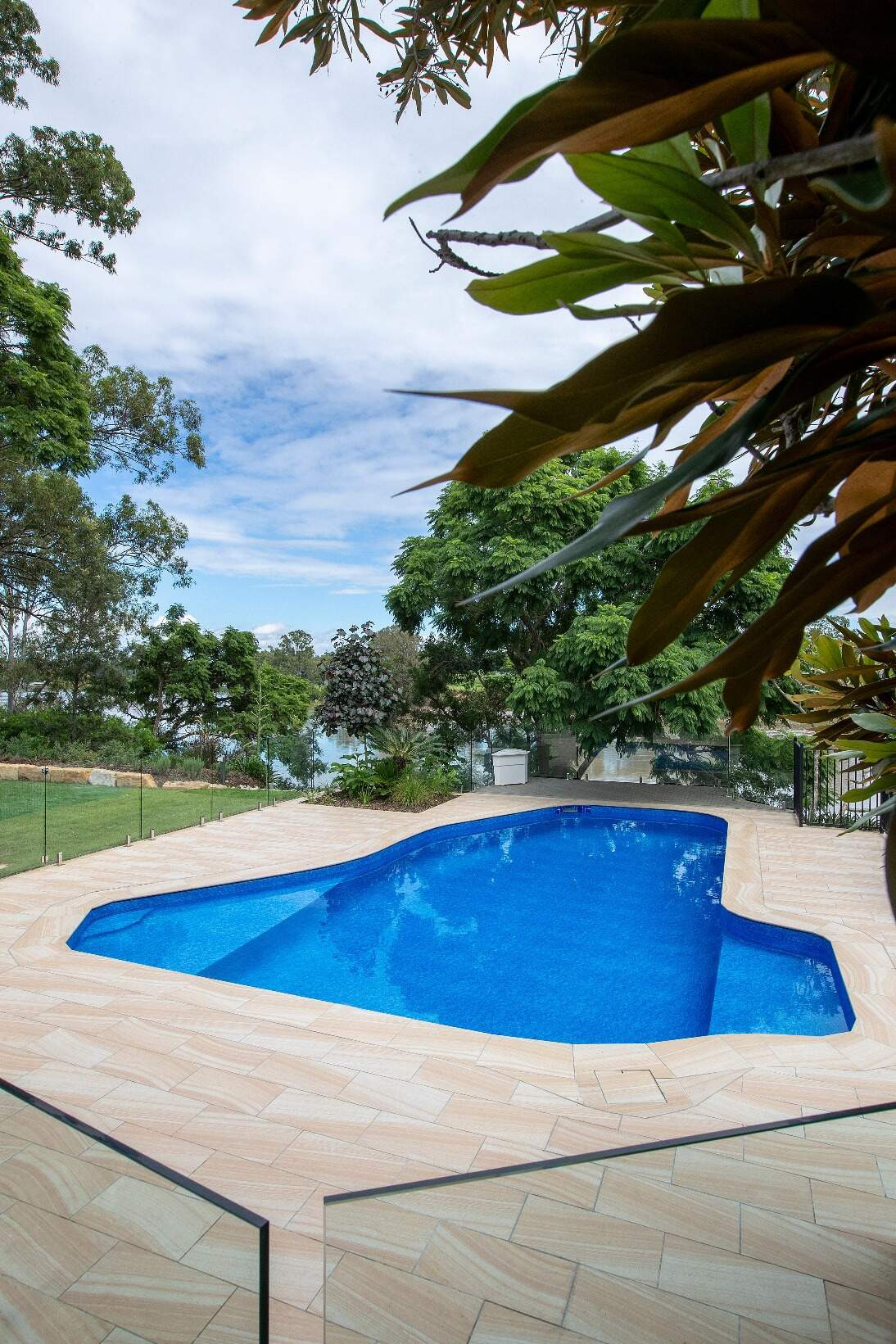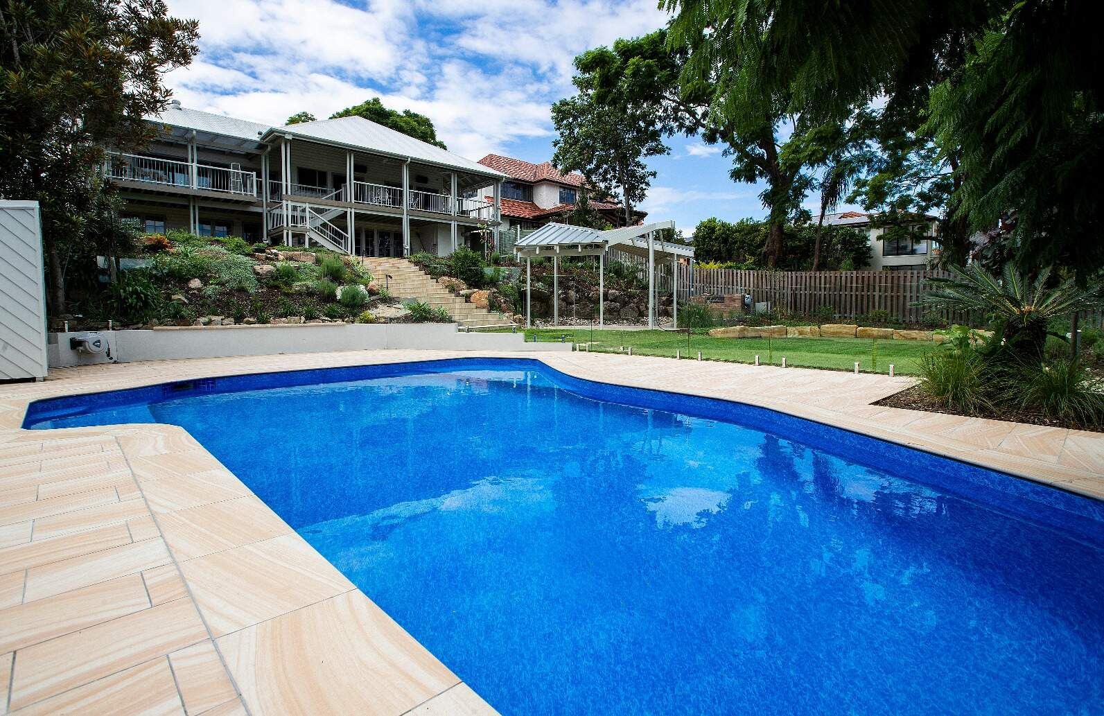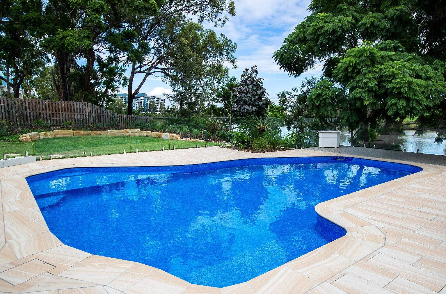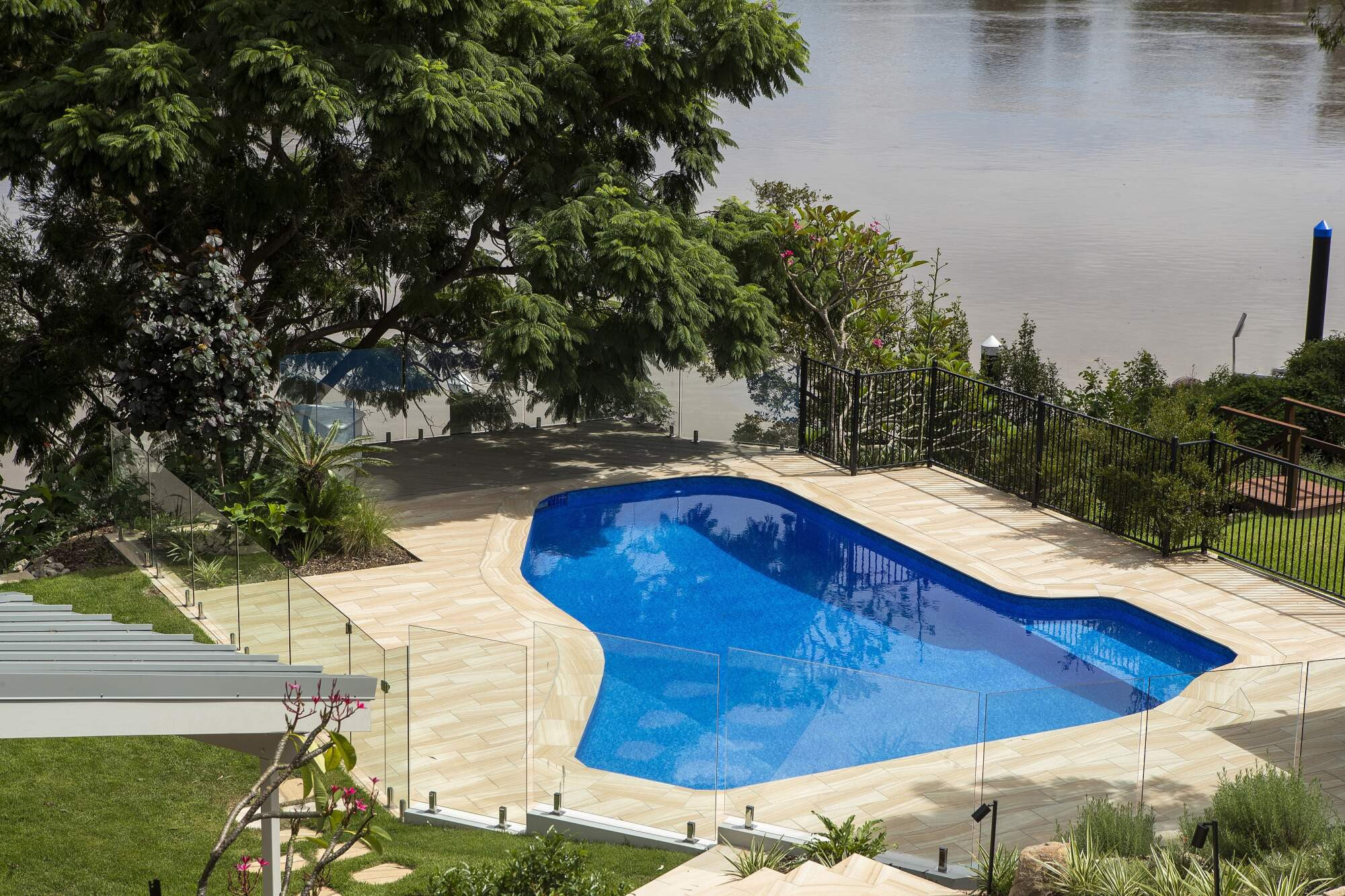 Finished in Aqualux Maui Pool Finish this geometric pool is now beautifully modernised and pops against the Brisbane River