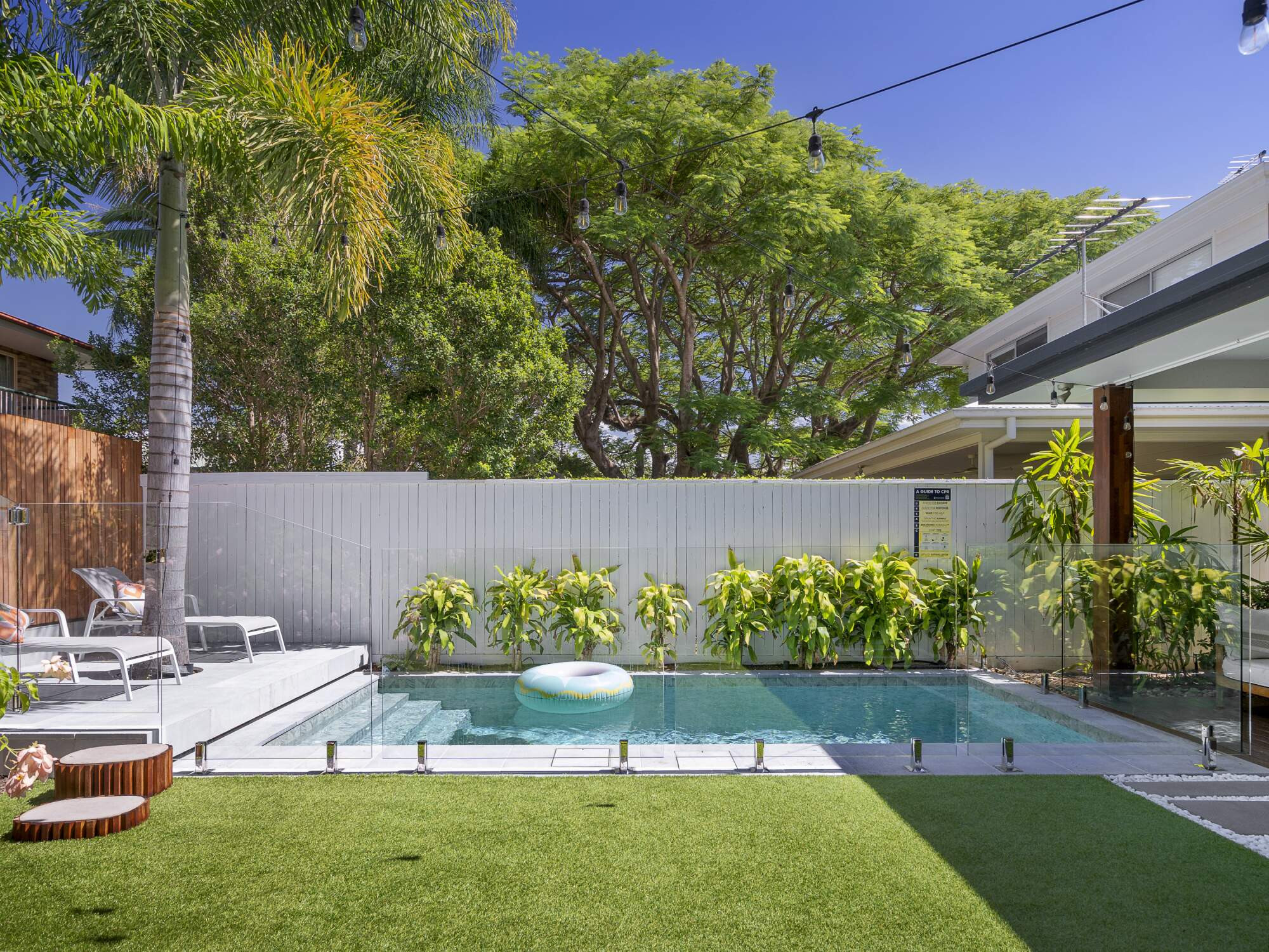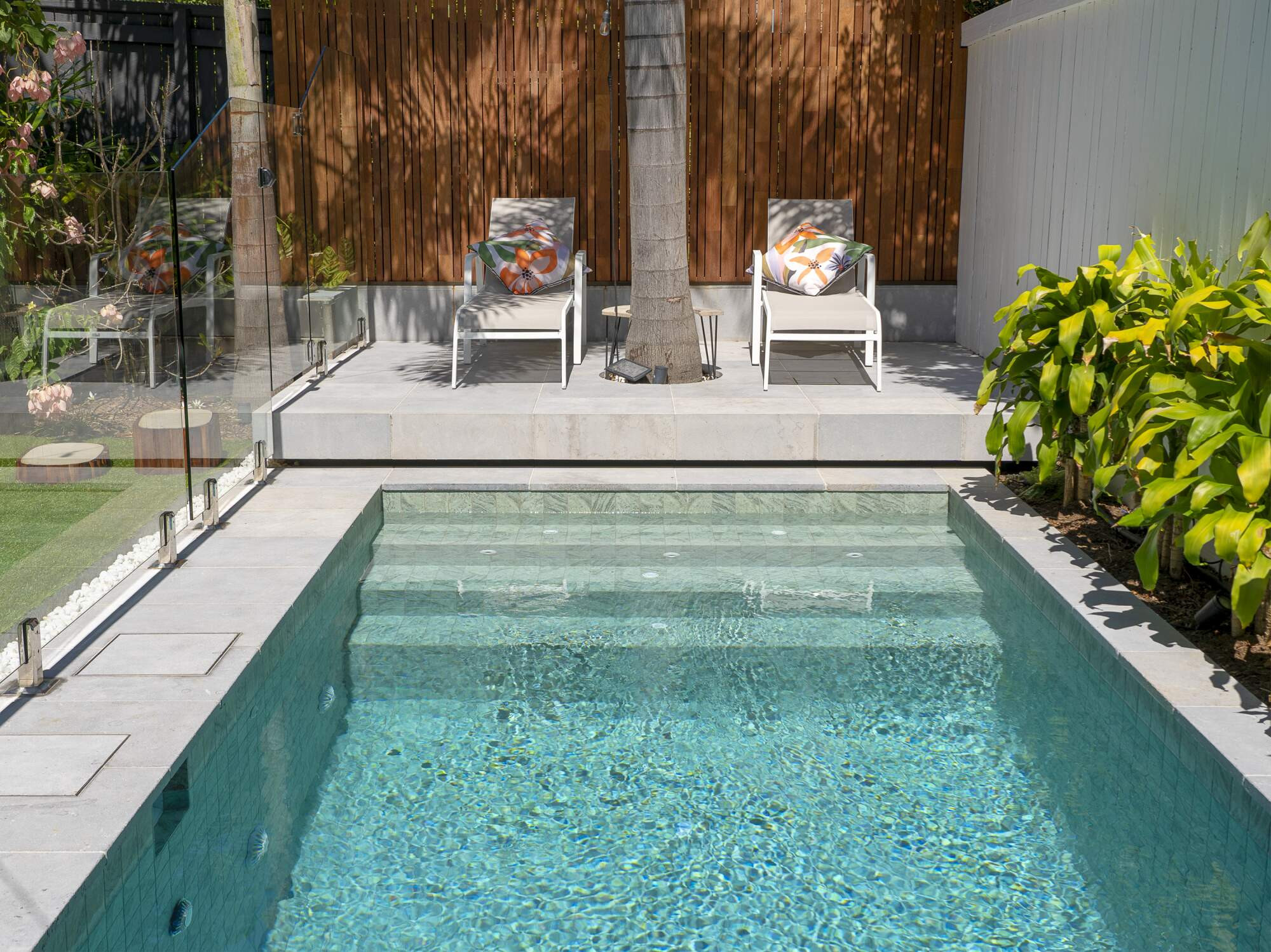 Queensland Family Pools & Spas love a challenge and this certainly filled the brief. Tight access saw the team think outside the box which resulted in an Excavator, machinery and supplies transferred through the middle of the client’s house in order to access the backyard. The end result was a sleek and elegant pool, Fully tiled with the stunning Sukabumi tile, the pool shines in hues of emerald and jade green as the sun moves across the sky.
