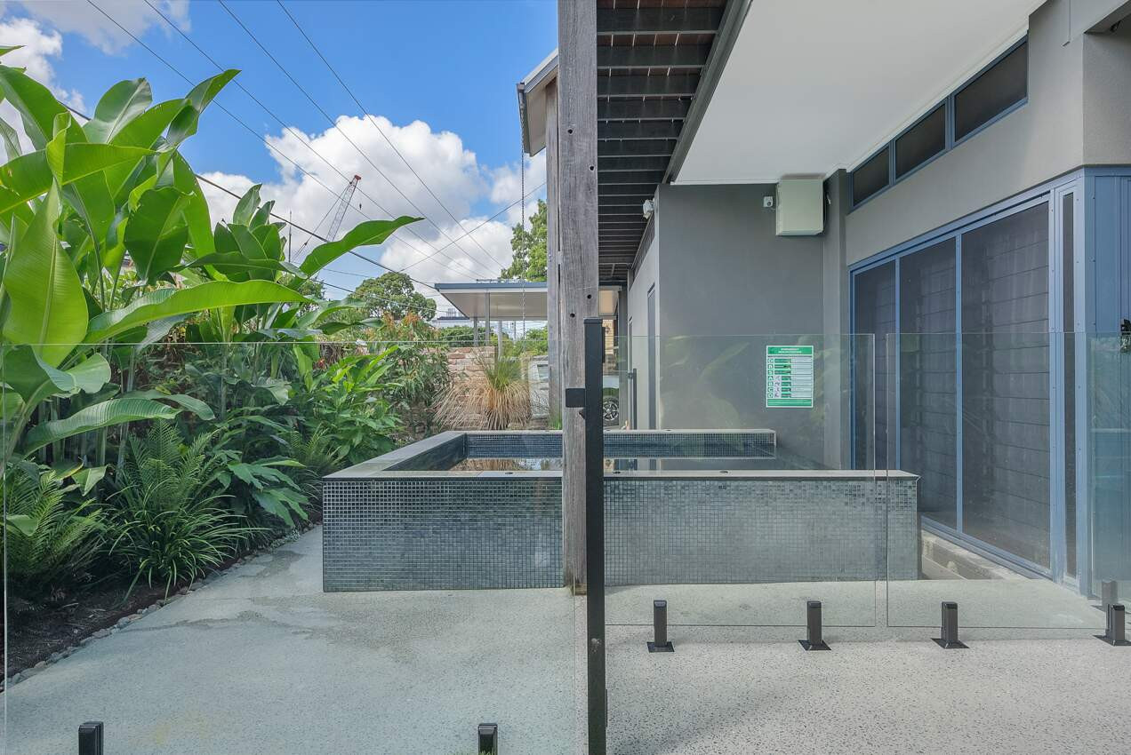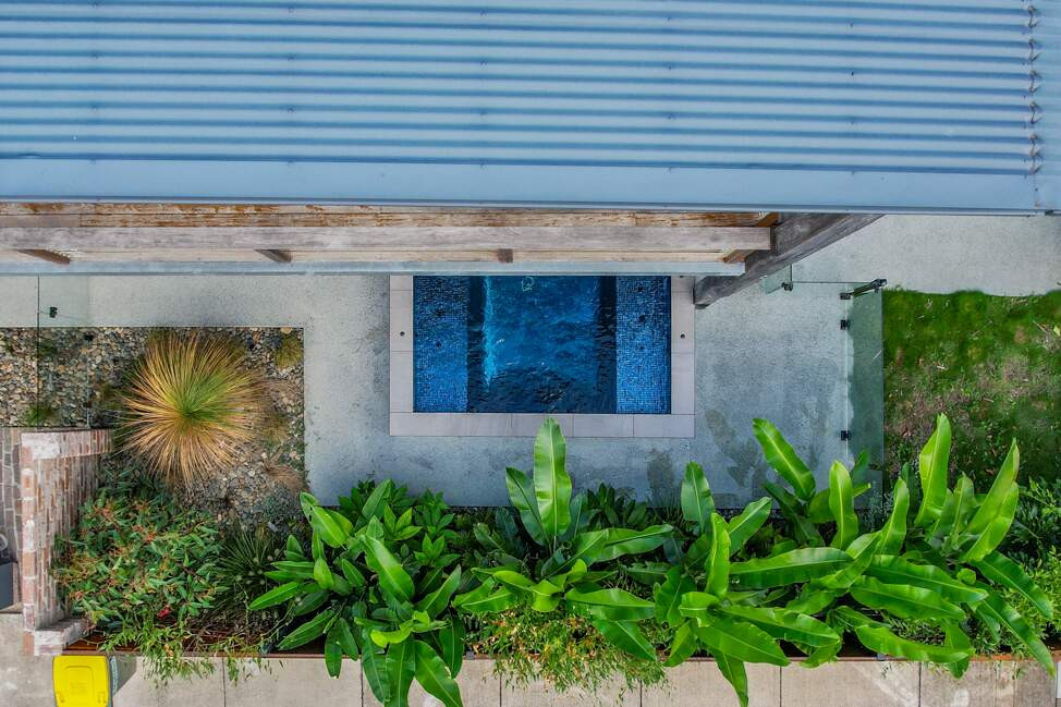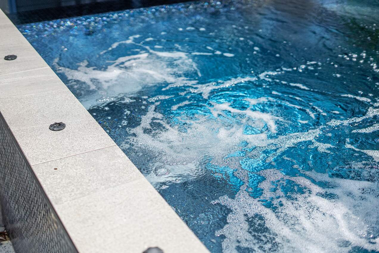 A seamless blend from the house to spa, featuring a fully tiled interior with the stunning Charcoal Pearl Glass Mosaic. The external feature wall brings the interior out with the matching Pearl Glass. The tiled spill wall is captured in open view from the reading room of the residence and the glass fencing creates unobstructed views of the gardens. The dark tones fulfills the clients request of a luxurious relaxing spa.