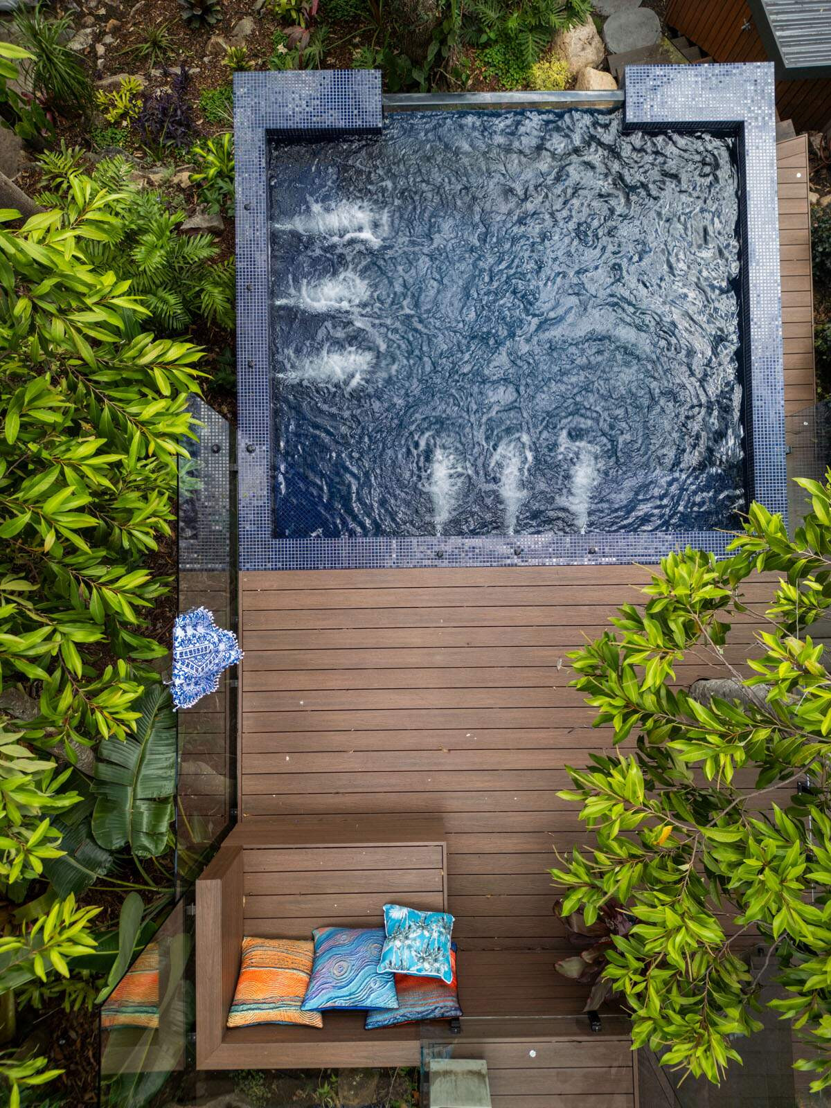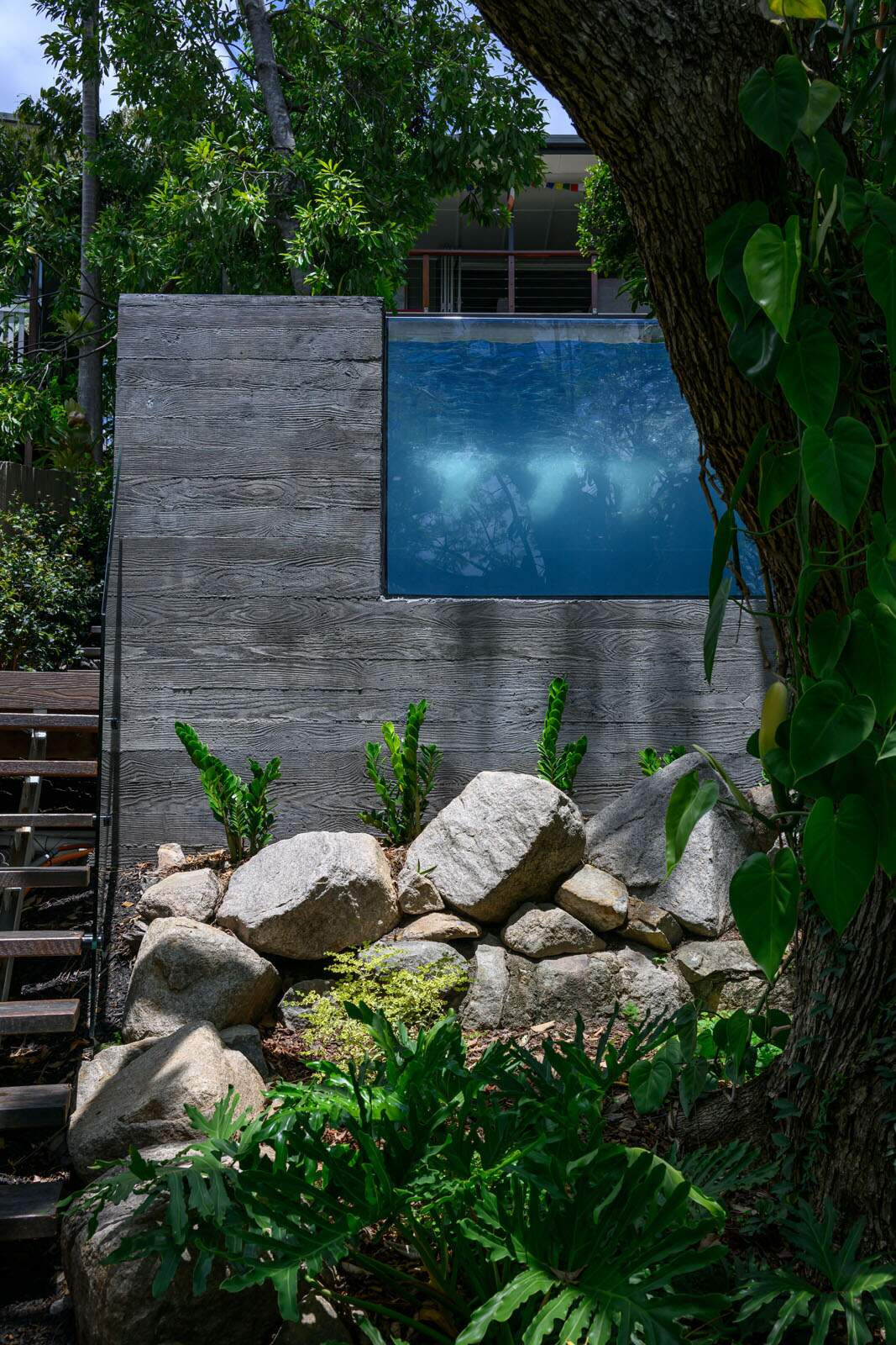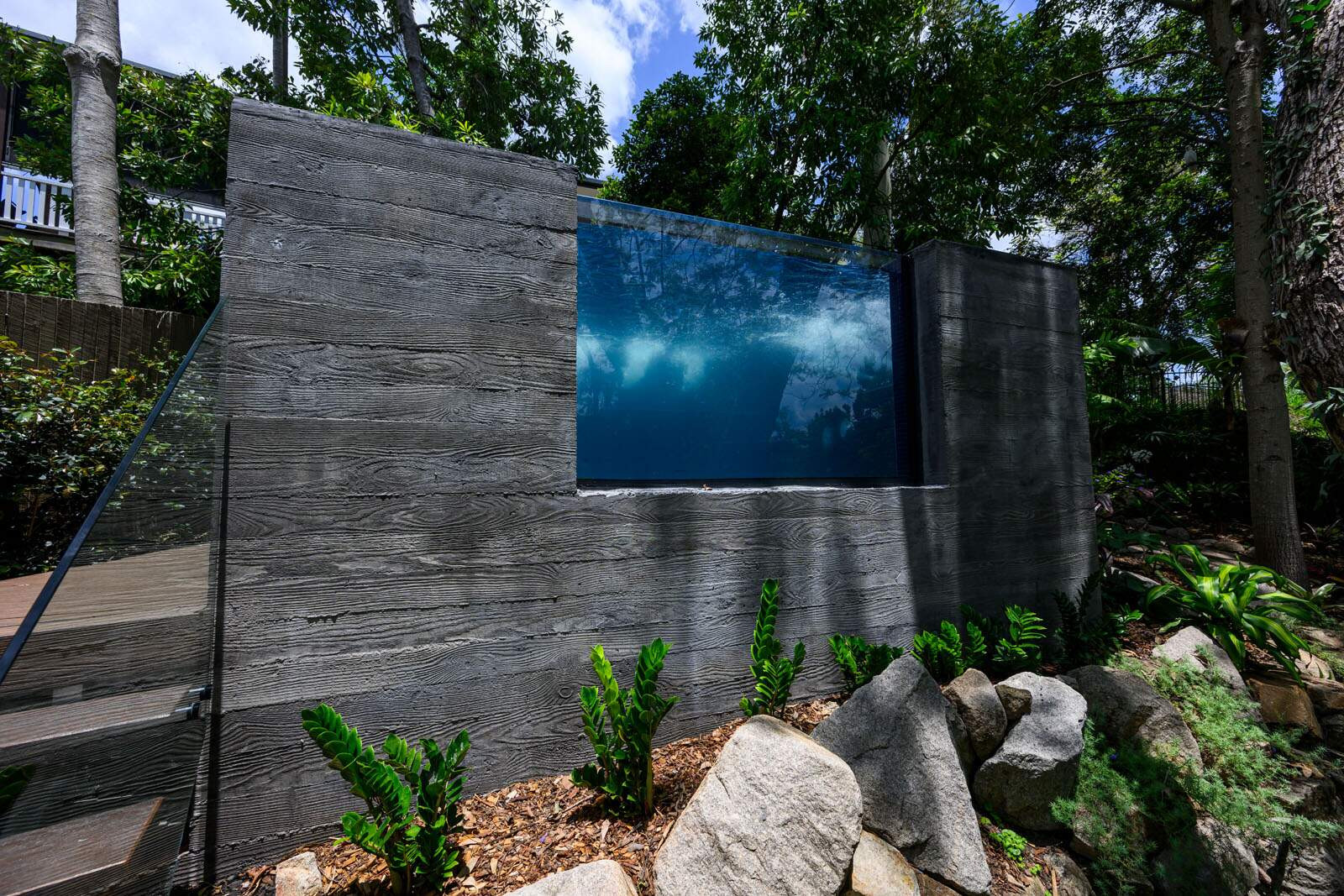 This pool not only compliments its surrounds to a tee, it also comes with all the bells and whistles; a pool window, fully tiled interior, in-floor circulation system, freshwater, spa features, off-form timber look exposed walls... just to name a few.