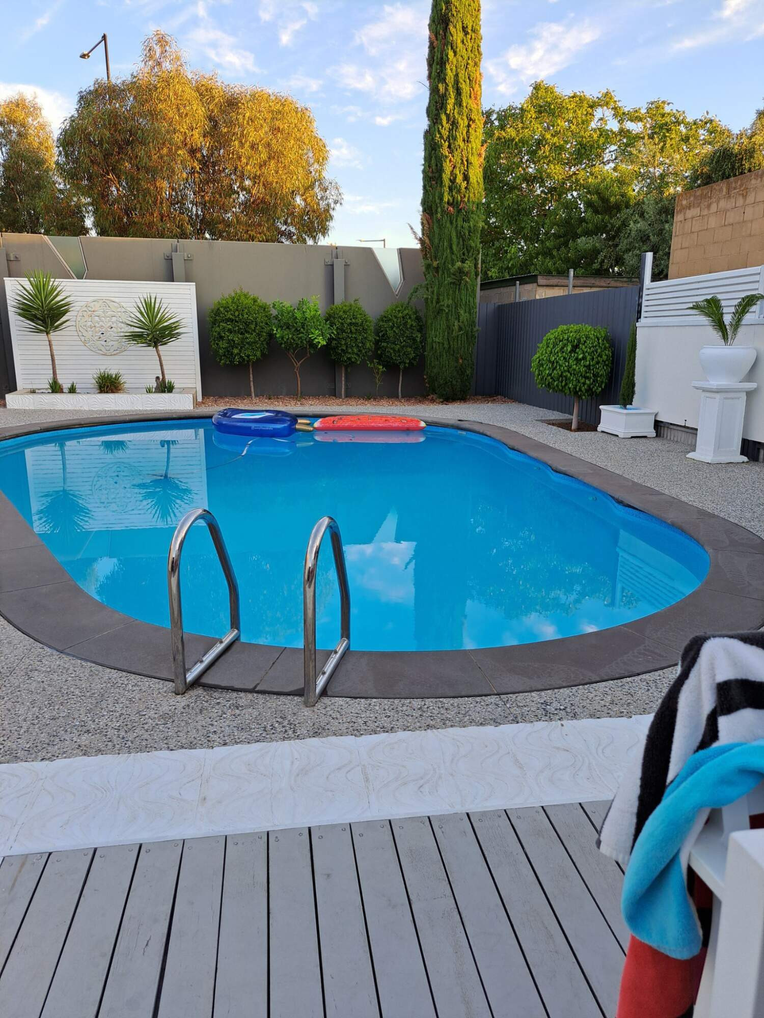 Classic Pools 8.9m Teardrop mineral swimming pool. This pool features a deep-end, a stainless steel ladder for easy access, and led lighting for a stunning night-time effect. The mineral water system is low maintenance and gentle on your skin and eyes.