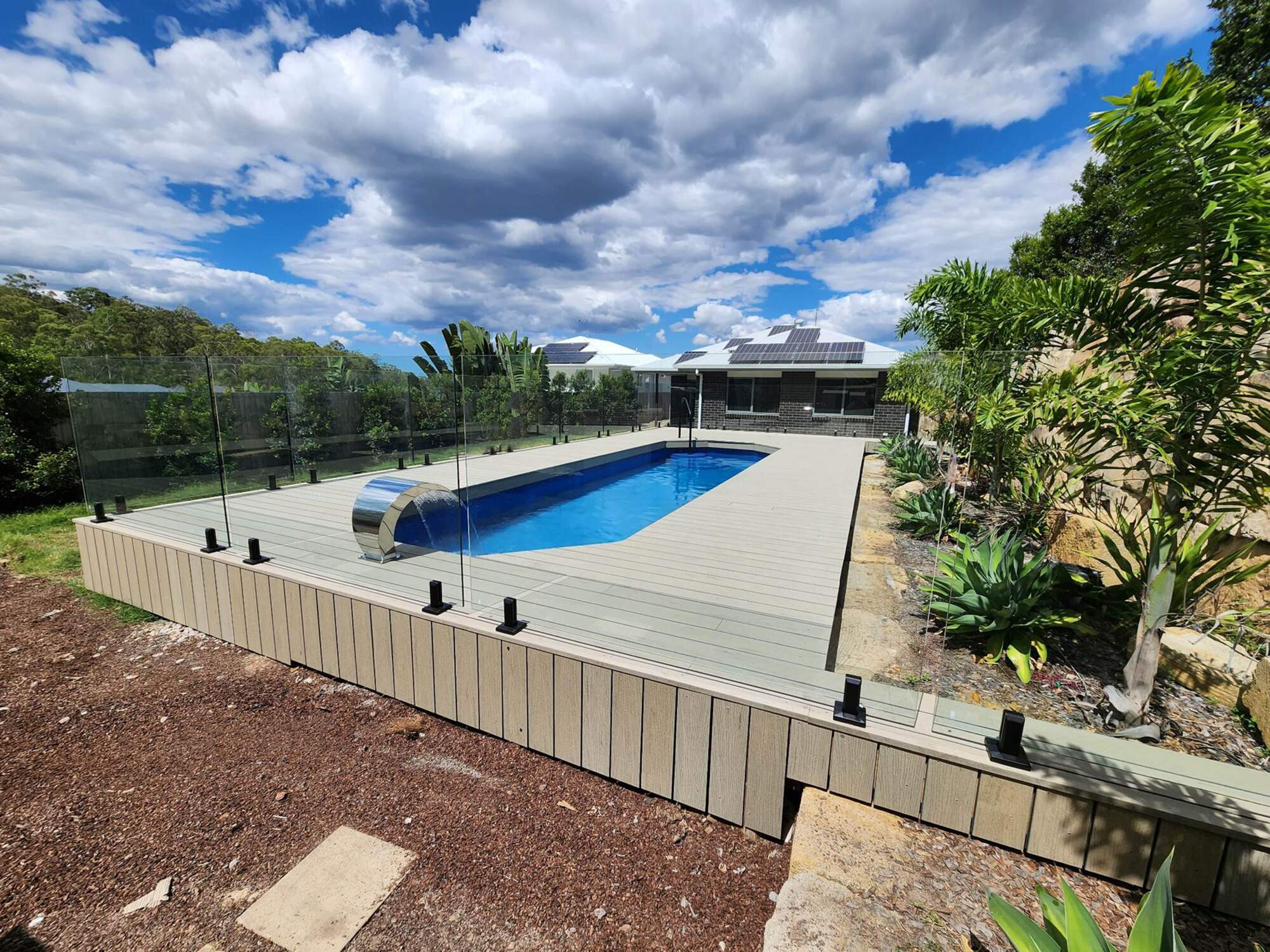 This pool has a sleek and modern design that fits your lifestyle and budget. This pool features a mineral sanitation system that keeps the water crystal clear and gentle on your skin and eyes. The composite decking provides a durable and low-maintenance surface that complements the pool's elegant lines. The glass fence adds a touch of sophistication and safety, while the step entry system with striking black handrail offers easy access and comfort.