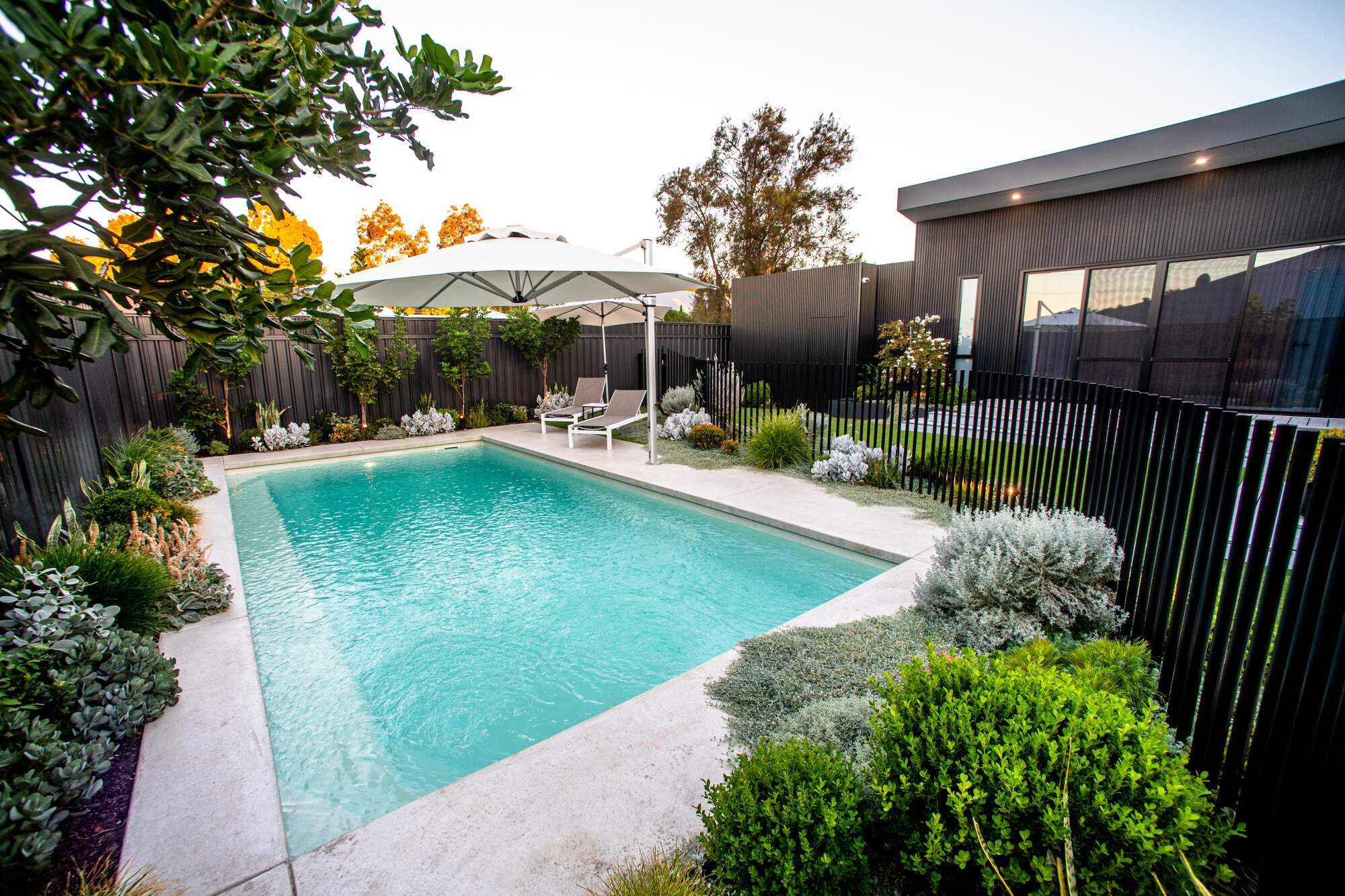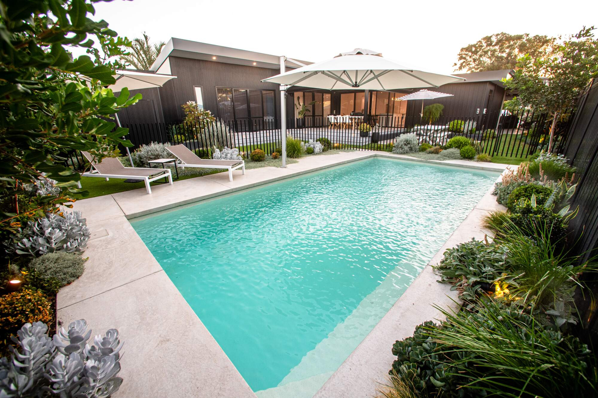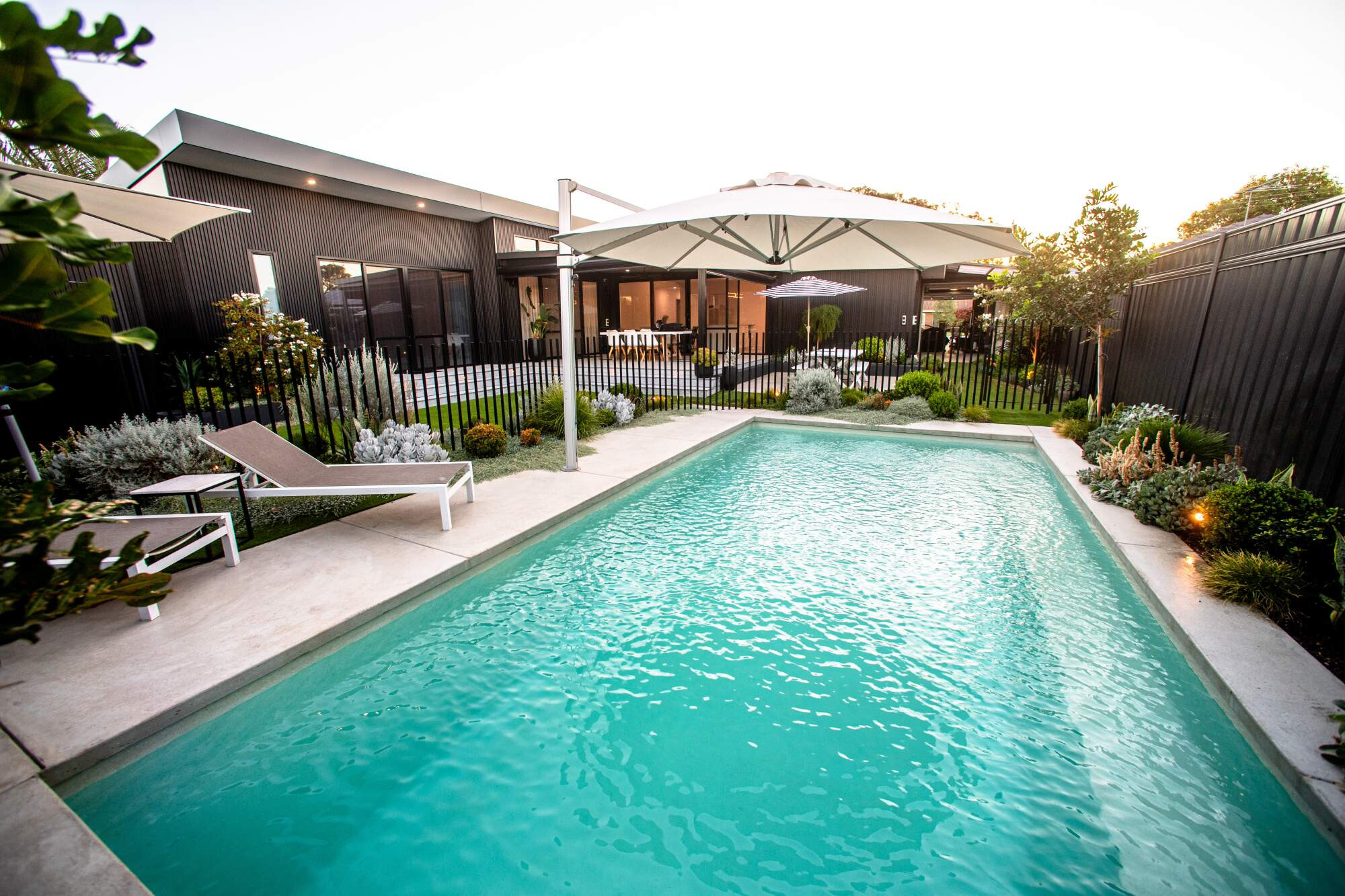 Nestled alongside this stunning contemporary home, the 8m x 4m geometric swimming pool effortlessly blends form and function. Meticulously crafted to complement the sleek lines of the residence, every detail – from the carefully chosen pool colour to the curated flora and fencing – exudes innovation and sophistication, culminating in a space where every detail contributes to the overall brilliance of the outdoor living area.