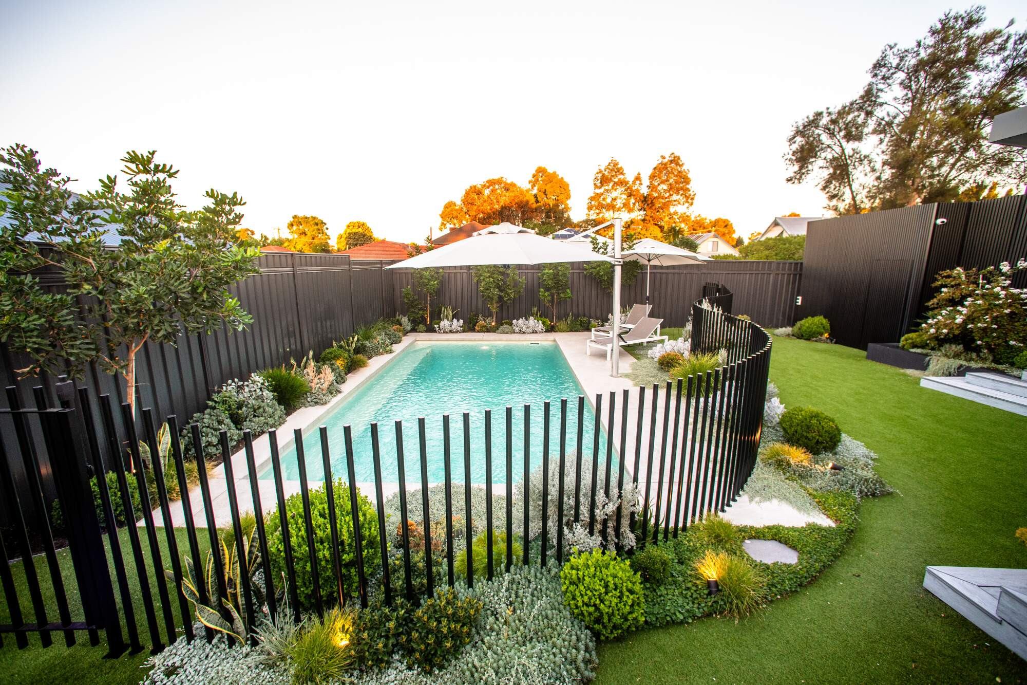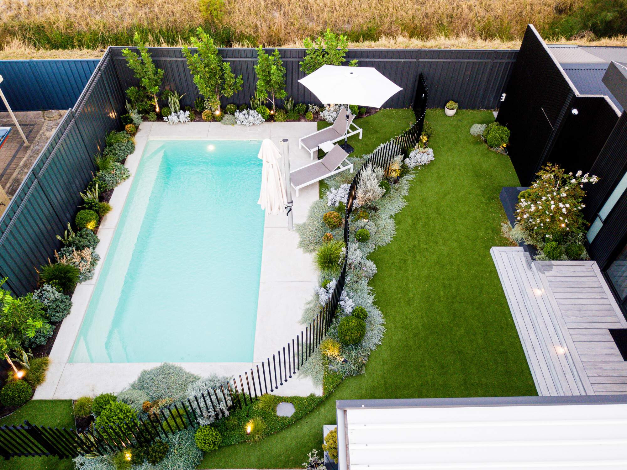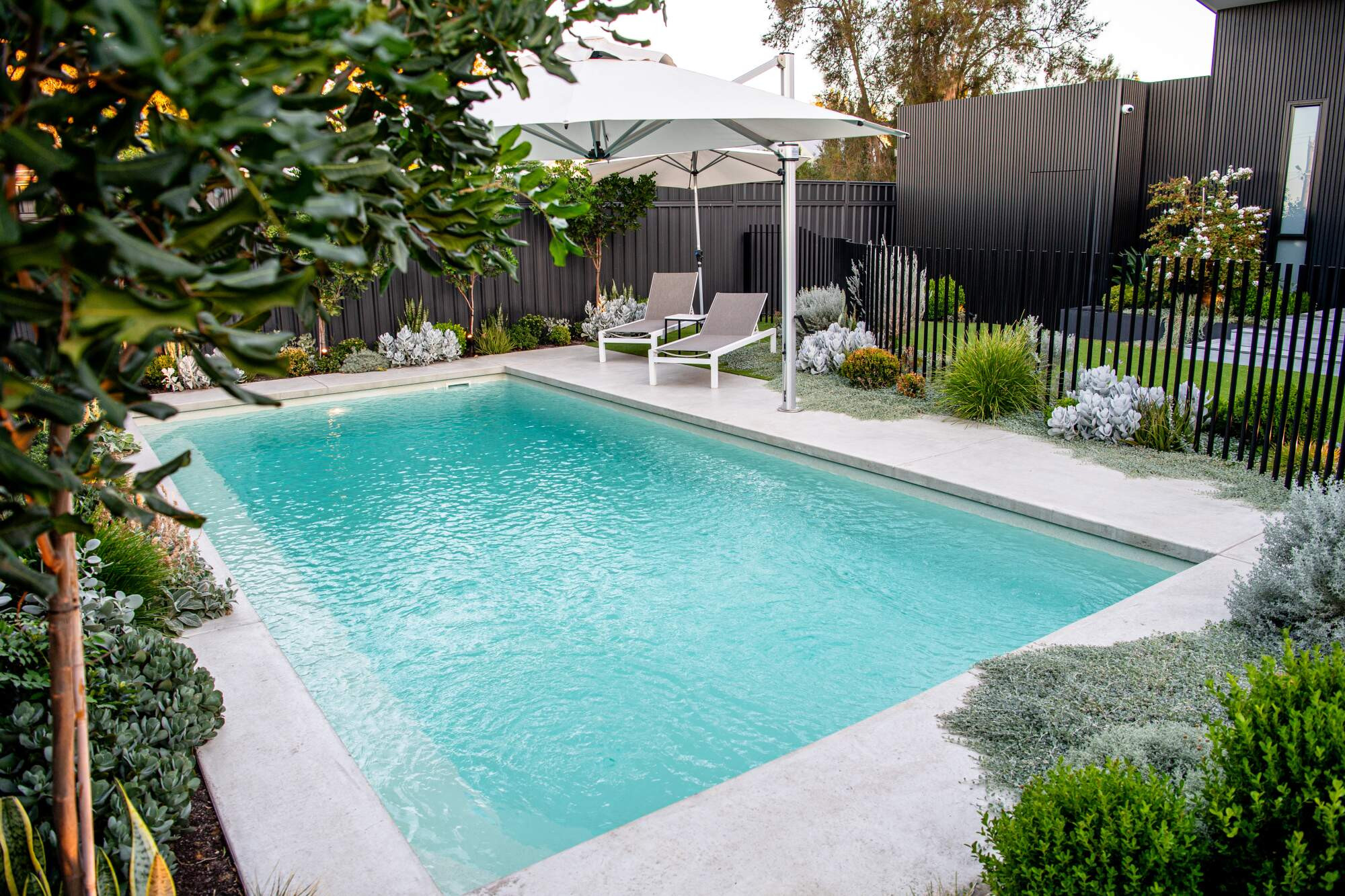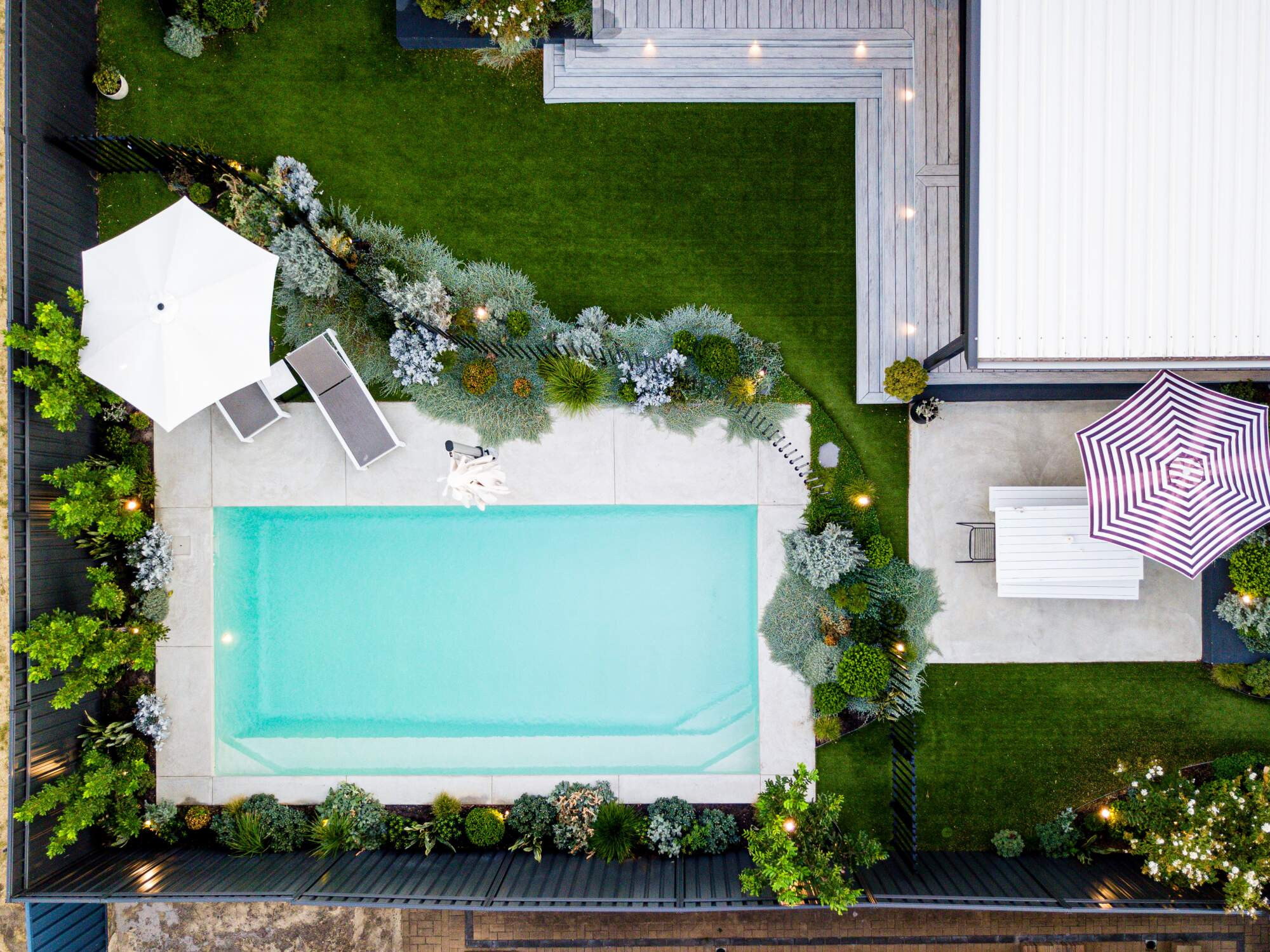 Nestled alongside this stunning contemporary home, the 8m x 4m geometric swimming pool effortlessly blends form and function. Meticulously crafted to complement the sleek lines of the residence, every detail – from the carefully chosen pool colour to the curated flora and fencing – exudes innovation and sophistication, culminating in a space where every detail contributes to the overall brilliance of the outdoor living area.