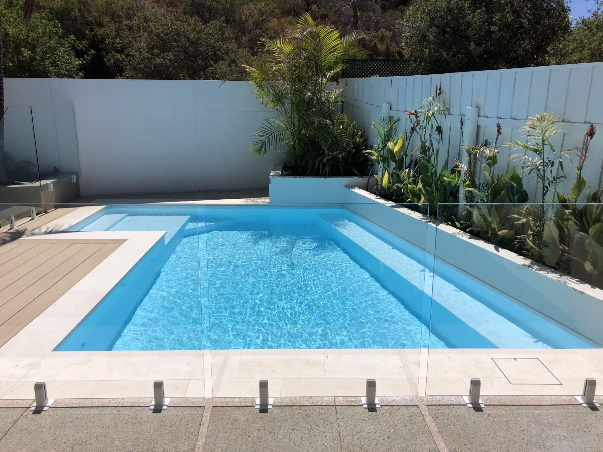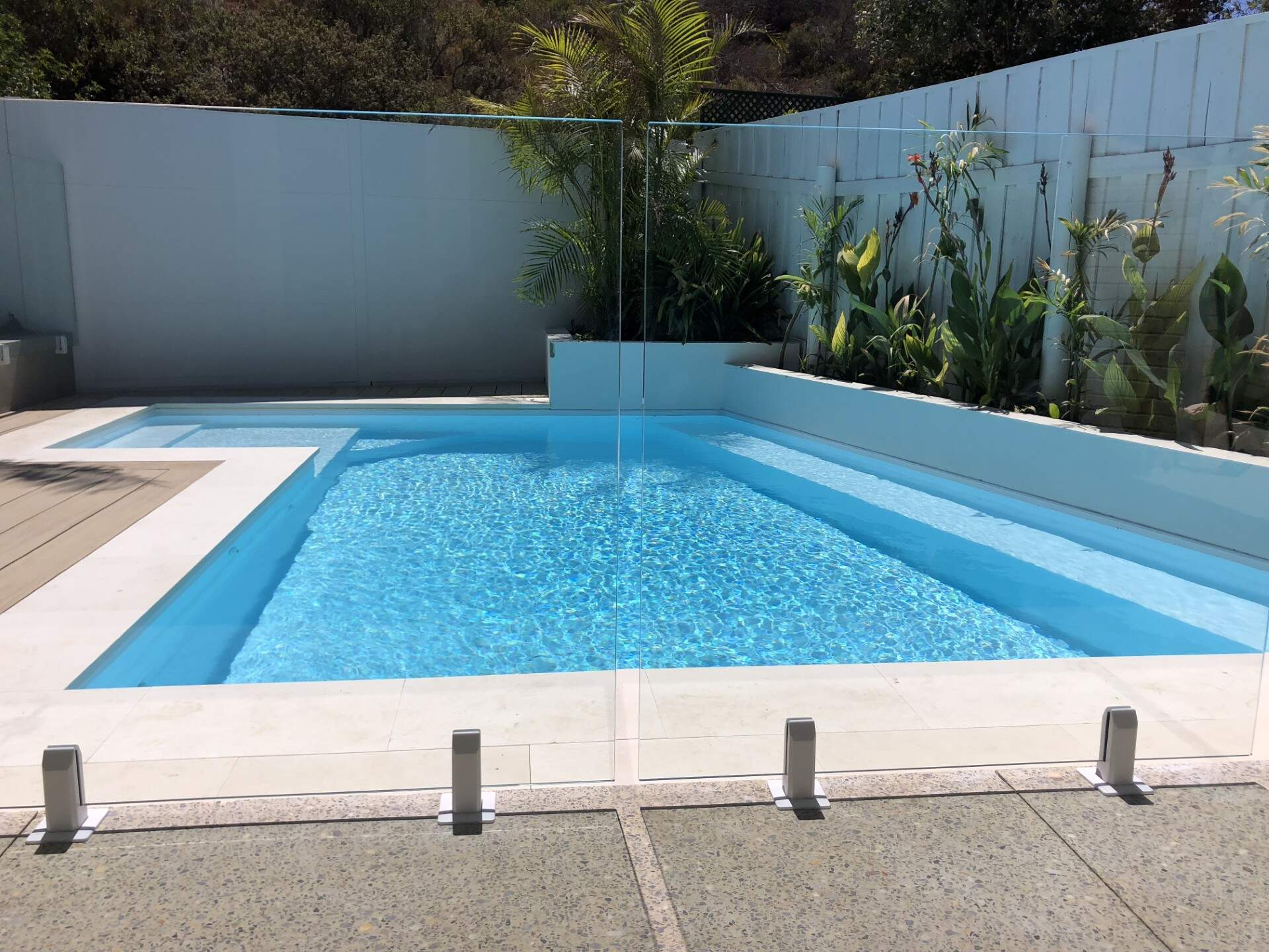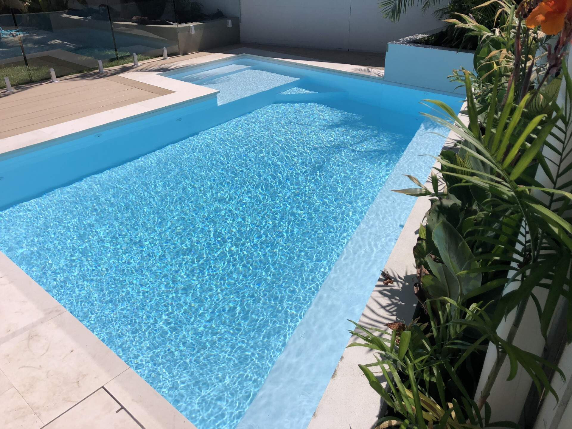 the request from this customer was simply white, so that we did, the dig was not challenging but required some permits from neighboring properties to gain rear access, the pool was then constructed following the boundary lines of the site to maximize the pool area in a unique shape, also requested by the customer was a swim out area for the young kids to grow in, the final white look was then achieved with white glass spigots and abgals new white haven liner