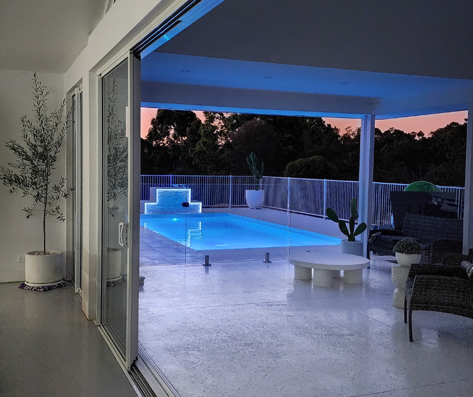 This refined project perfectly embodies modern elegance, seamlessly harmonizing with indoor/outdoor living and complementing the house's aesthetics. The standout residential water feature, intricately designed with white pavers & stack stone cladding on a platform at the pool's deep end, adds a captivating dimension. The illuminated water blade and synchronized LED lights transform evenings into mesmerizing experiences, making it a unique residential water feature that elevates the entire space.