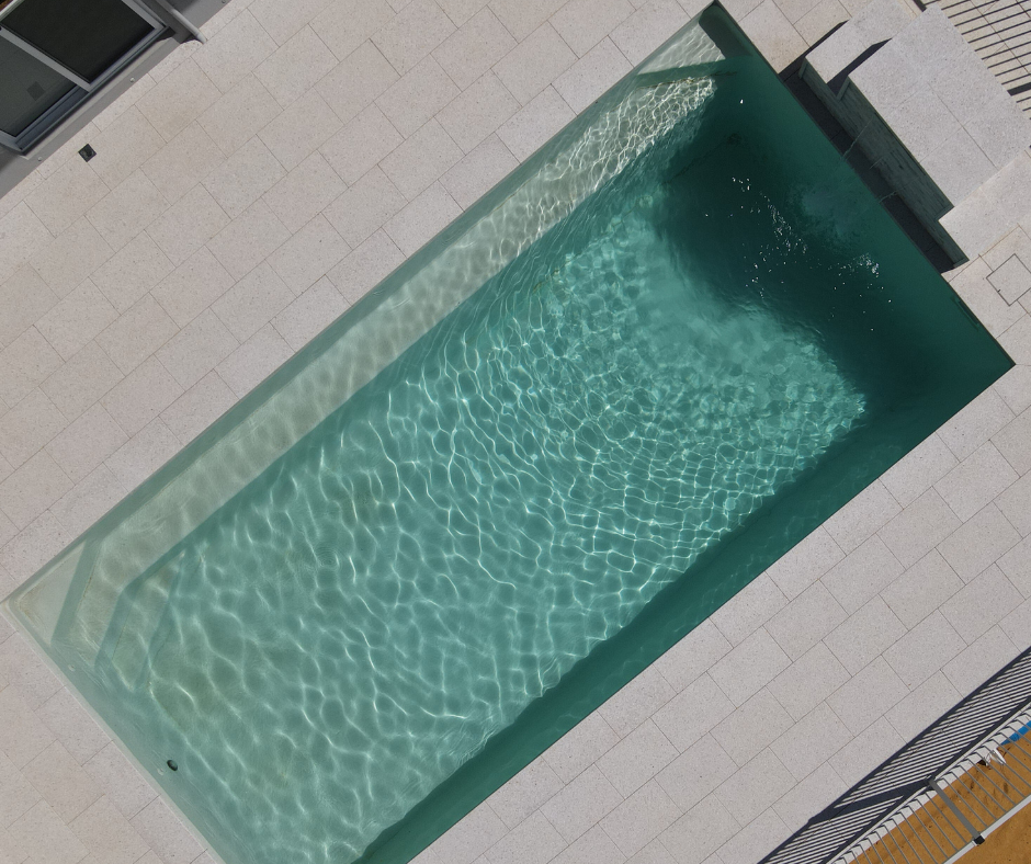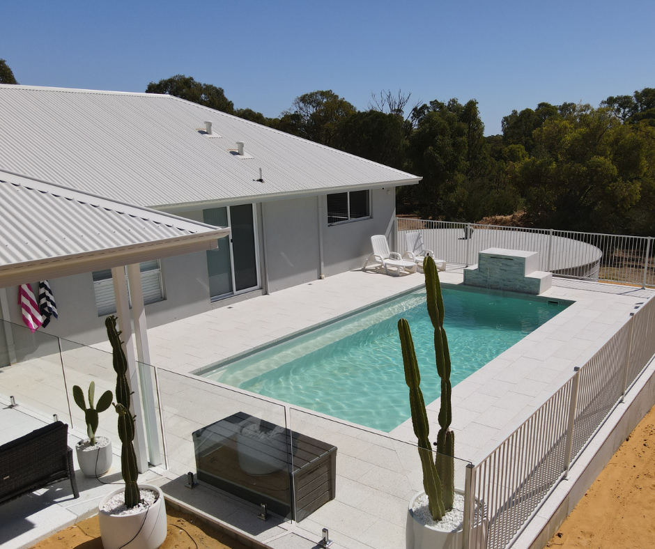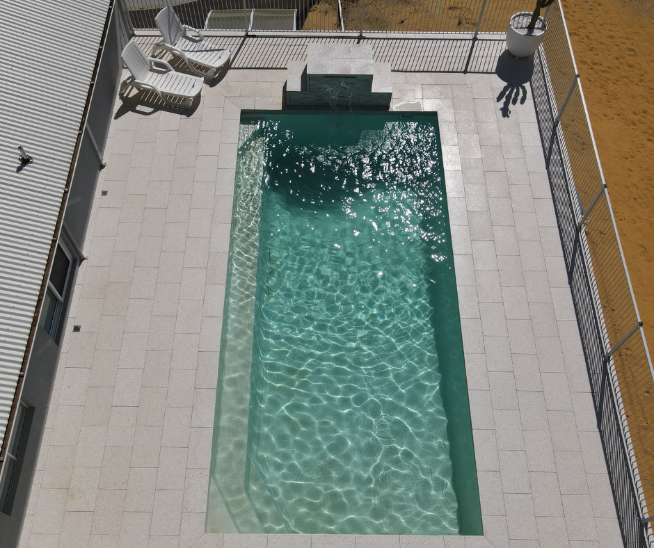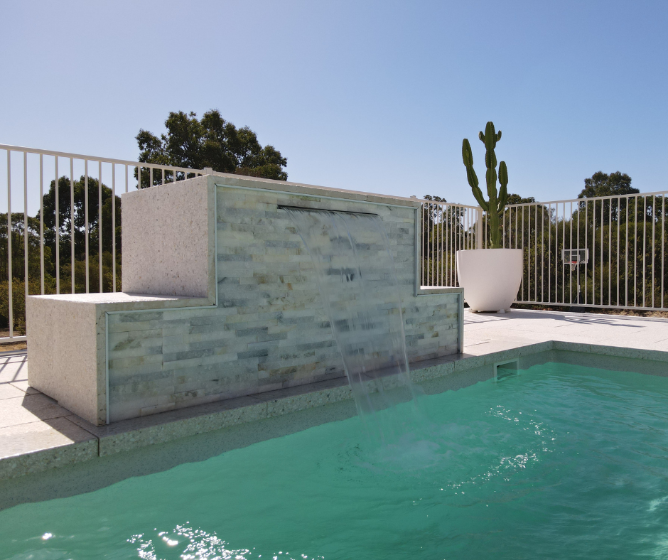 This refined project perfectly embodies modern elegance, seamlessly harmonizing with indoor/outdoor living and complementing the house's aesthetics. The standout residential water feature, intricately designed with white pavers & stack stone cladding on a platform at the pool's deep end, adds a captivating dimension. The illuminated water blade and synchronized LED lights transform evenings into mesmerizing experiences, making it a unique residential water feature that elevates the entire space.