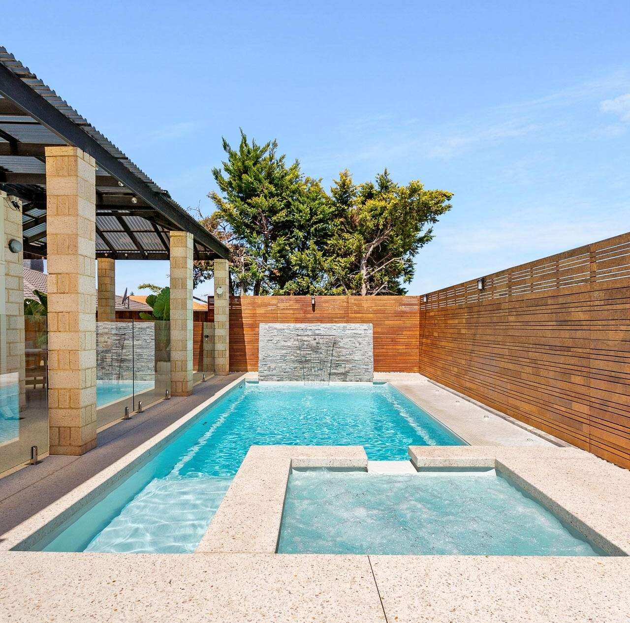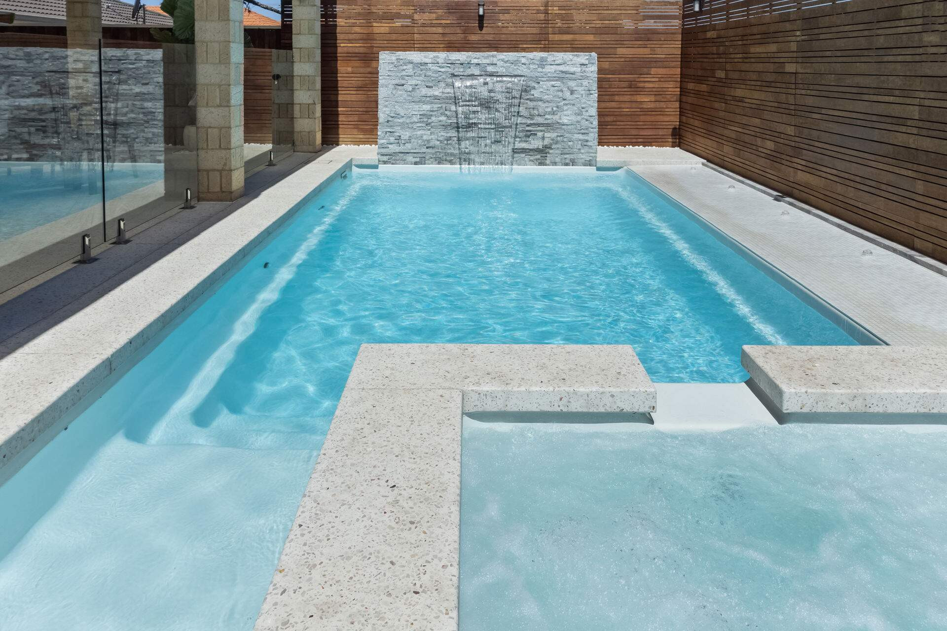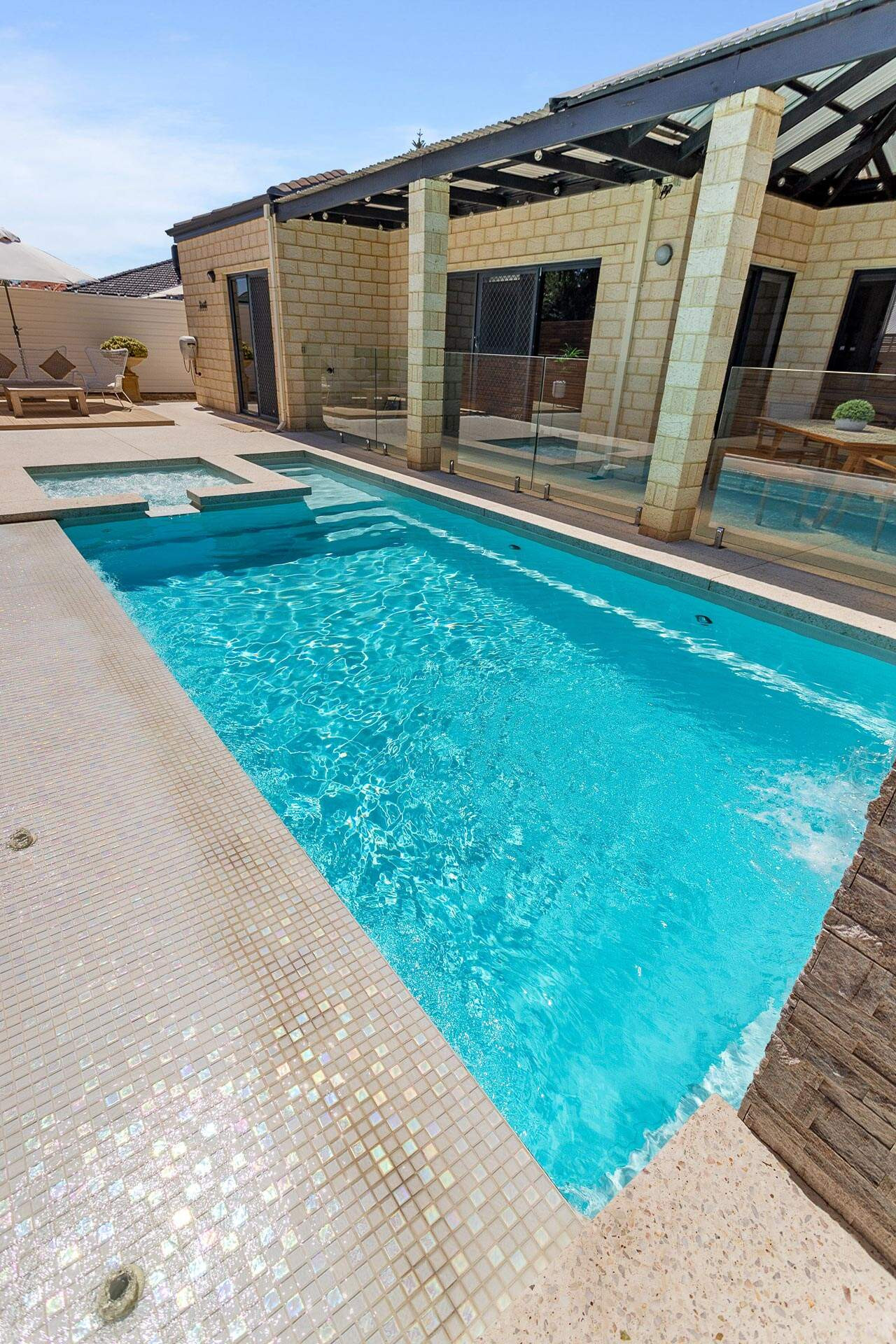 This pool & spa commination allowed room for a few innovative touches including fully mosaic tiled water sunbed with 4 x light bubblers as well as separately operated rock clad waterfall with 900mm blade, allowing water to cascade into the pool, both of these water features adding visual appeal and water acoustics.