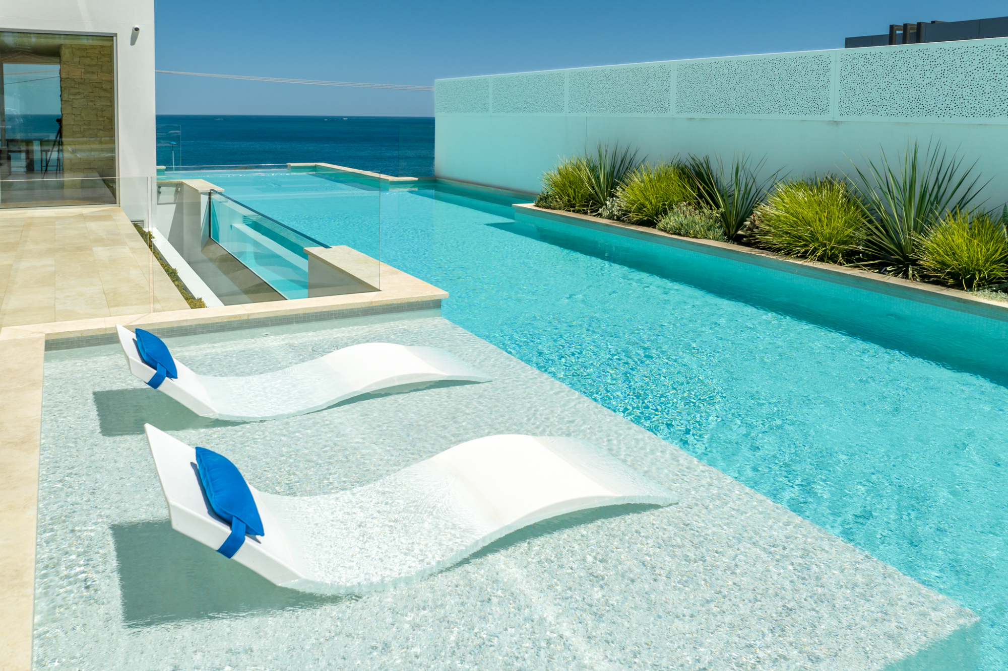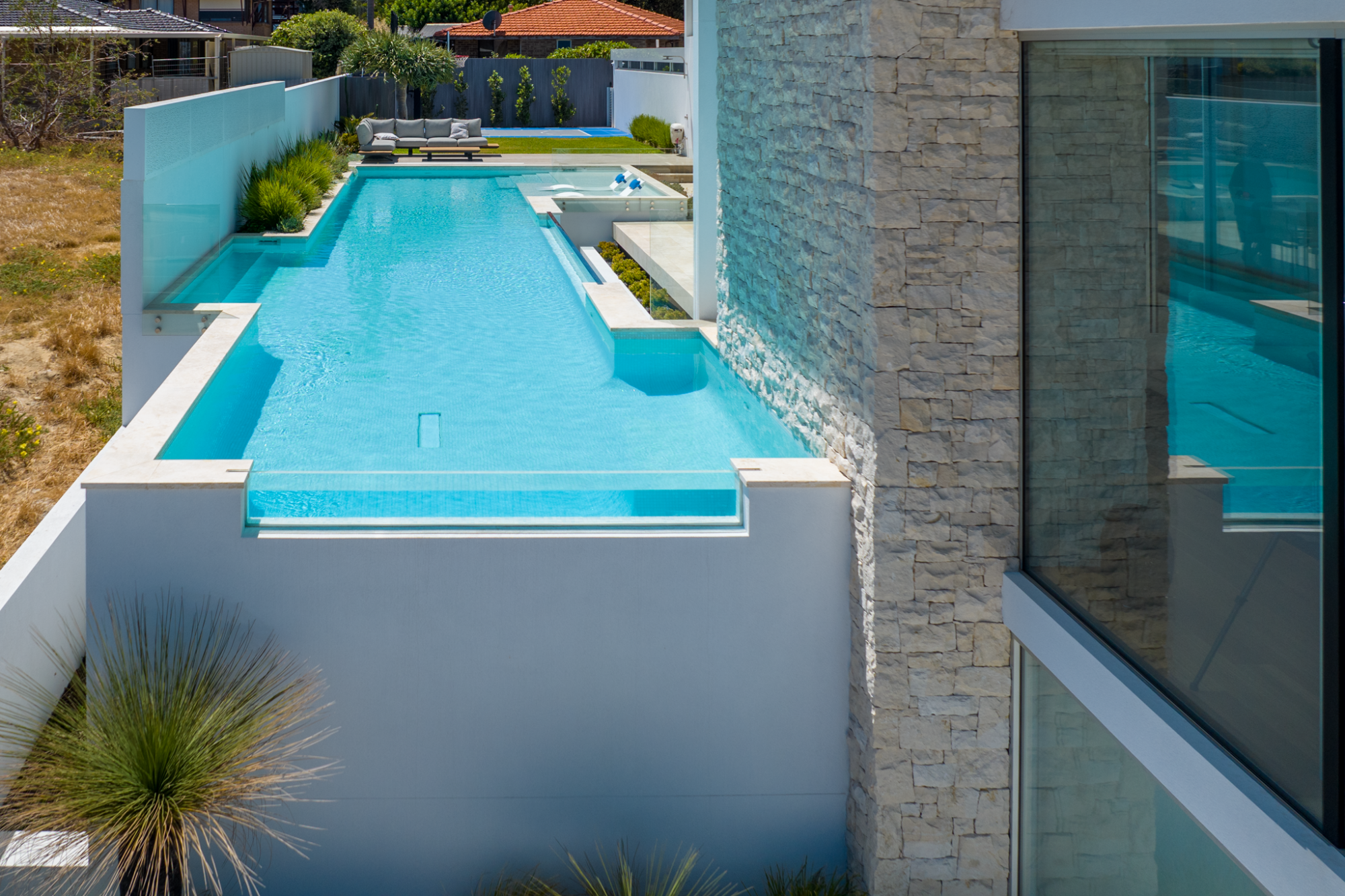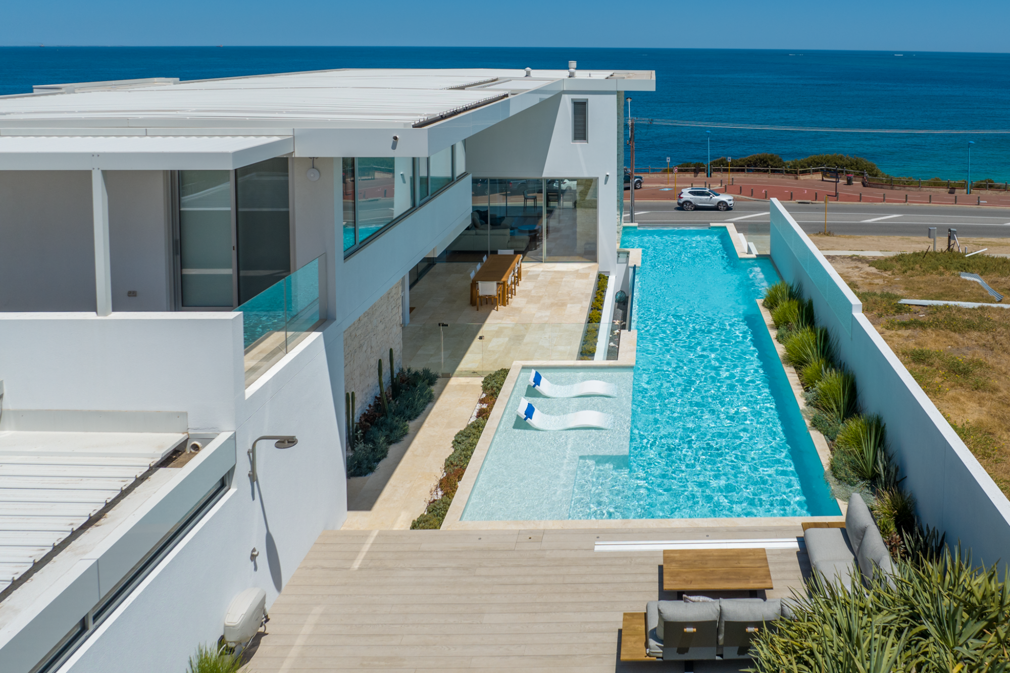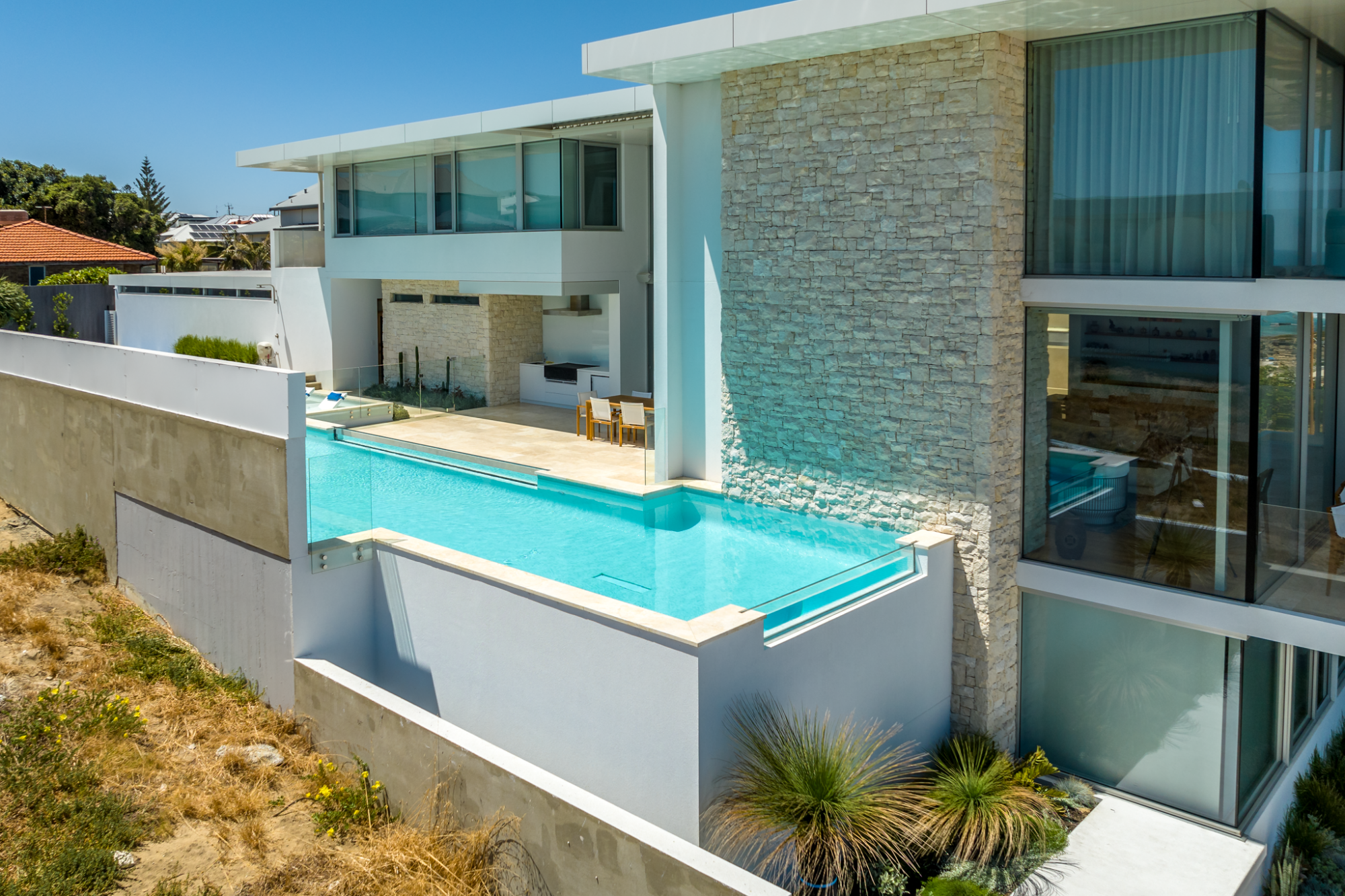 This lap pool is ‘out-of-this-world’ incredible…it honestly has it all! Fully tiled with a Baja shelf, the pool offers an incredible coastline from one of its two windows. When viewed from West Coast Drive, it is apparent how much design, engineering, construction and finesse have played a part in delivering this masterpiece. The client is so happy he decided to take our advice and completely change the design and the result is outstanding.