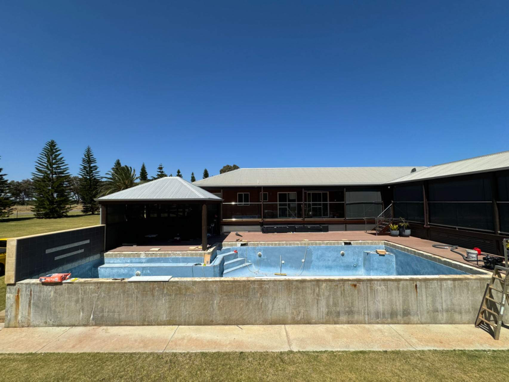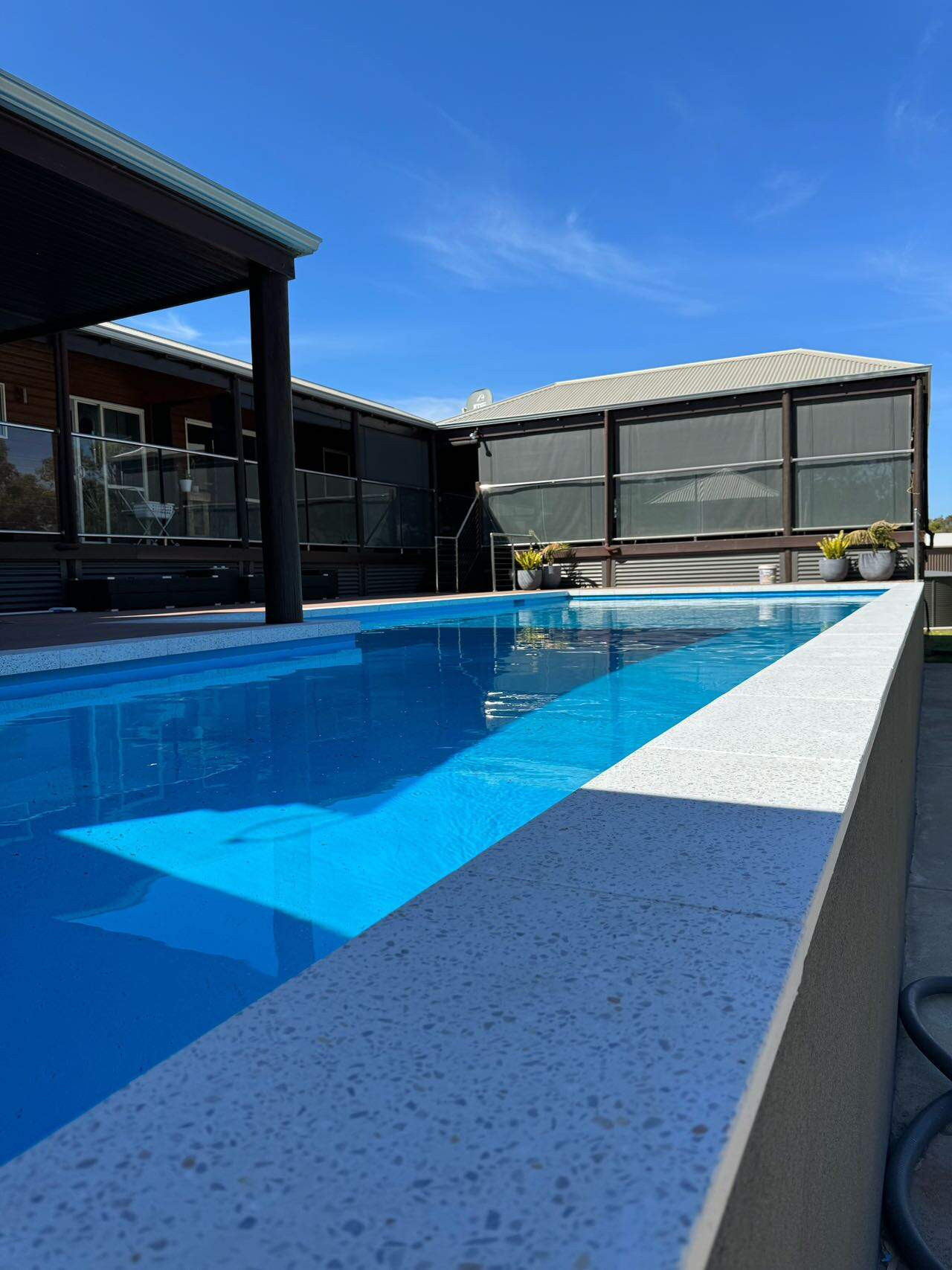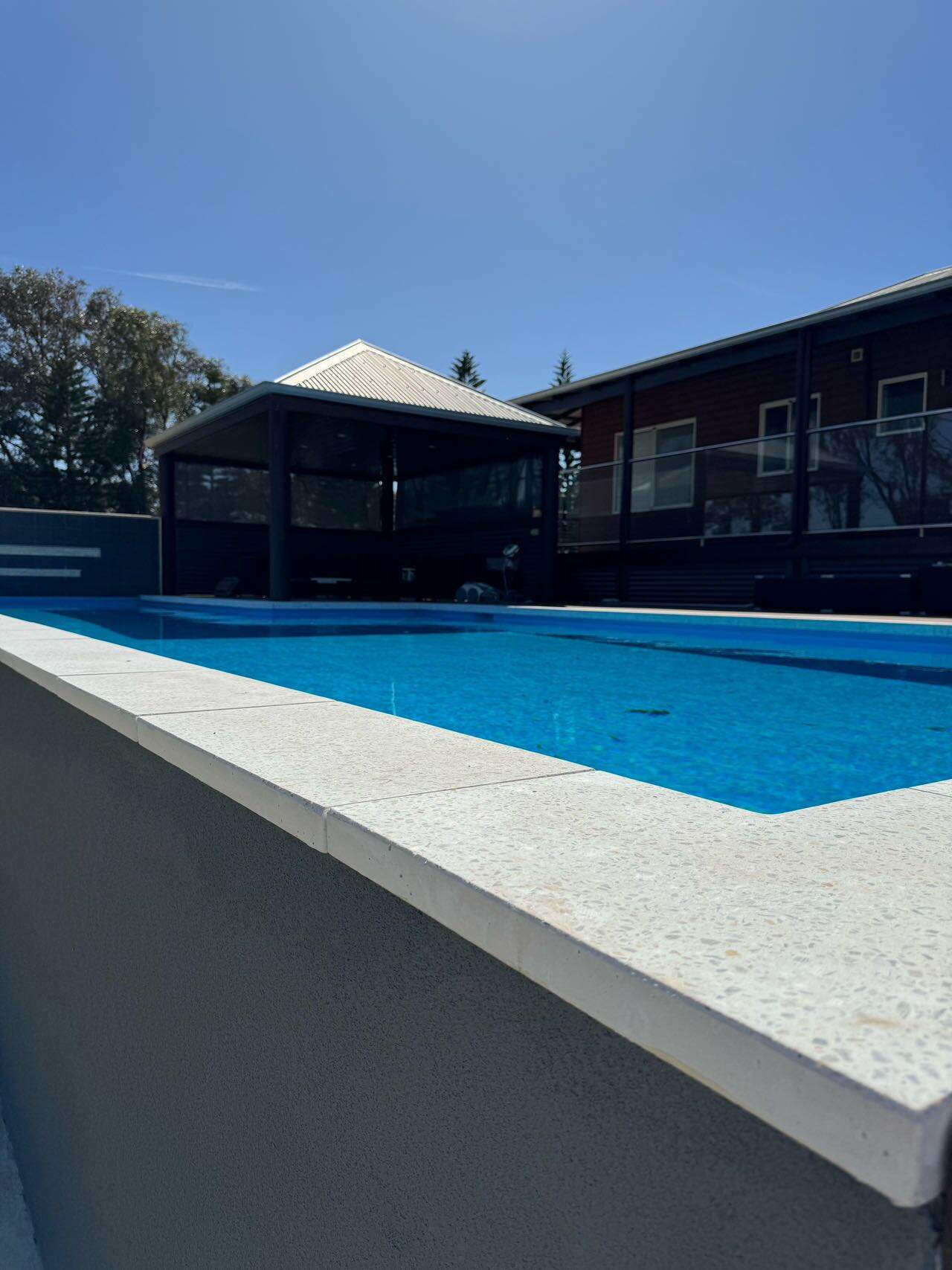 Up the coast in the beautiful township of Dongara, an above-ground concrete pool renovation with a modern, inviting look.