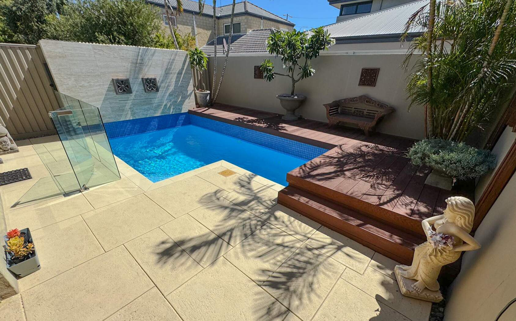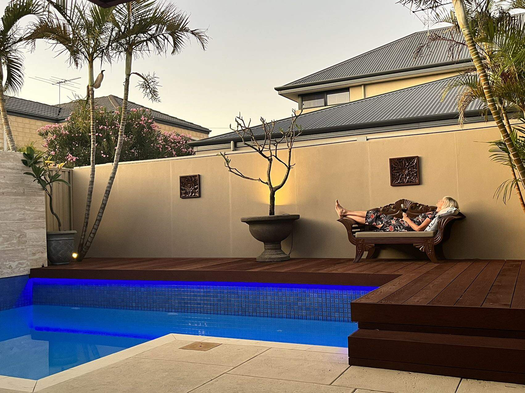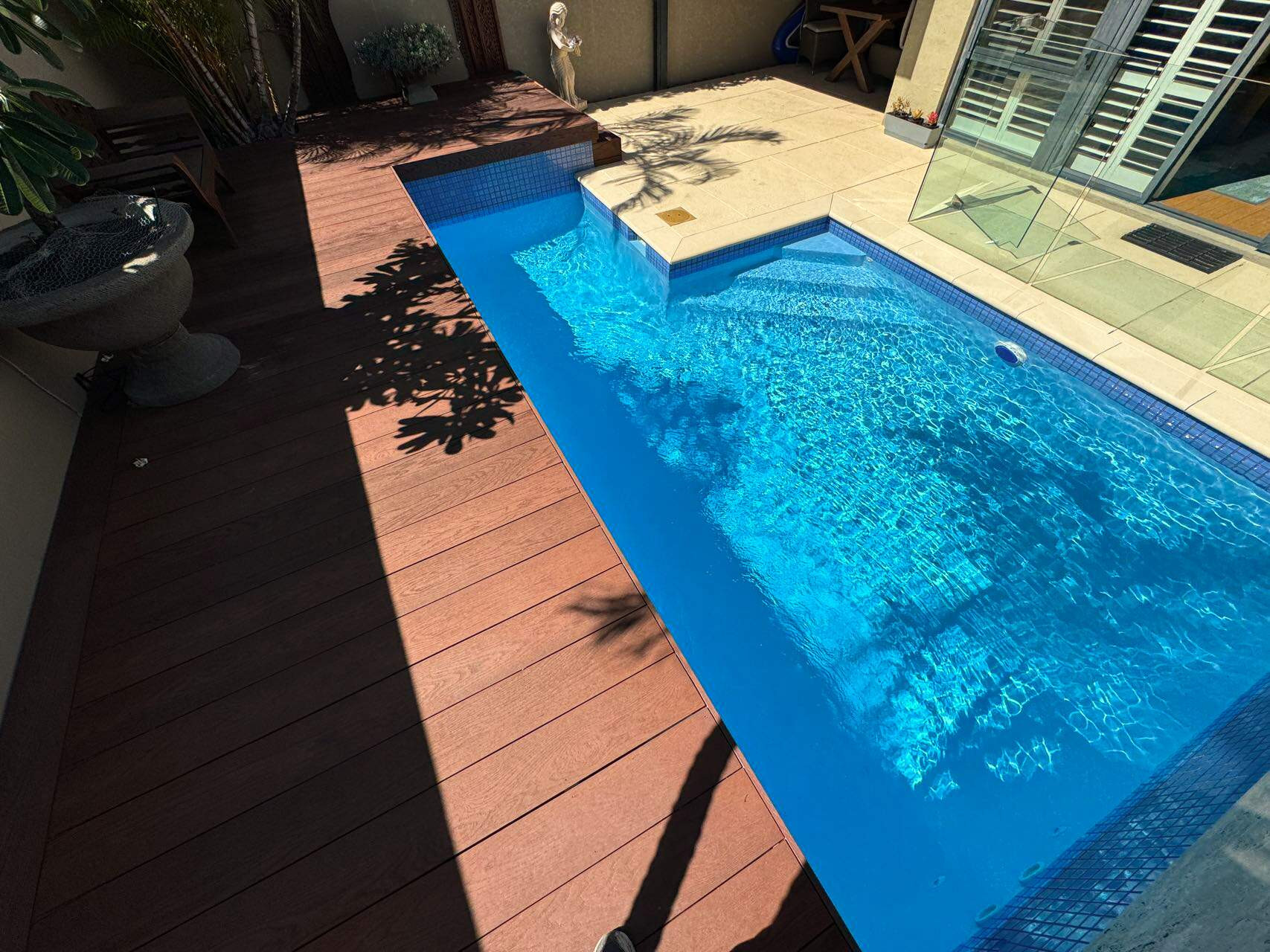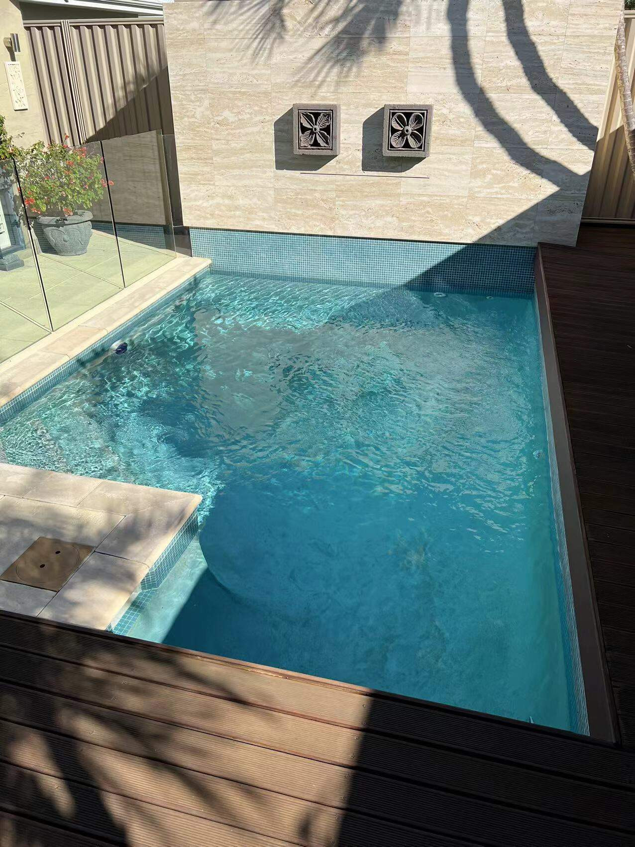 Plunge pool and decking restoration with Fiberglass surfacing and Mosaic waterline tile combination & hidden lighting