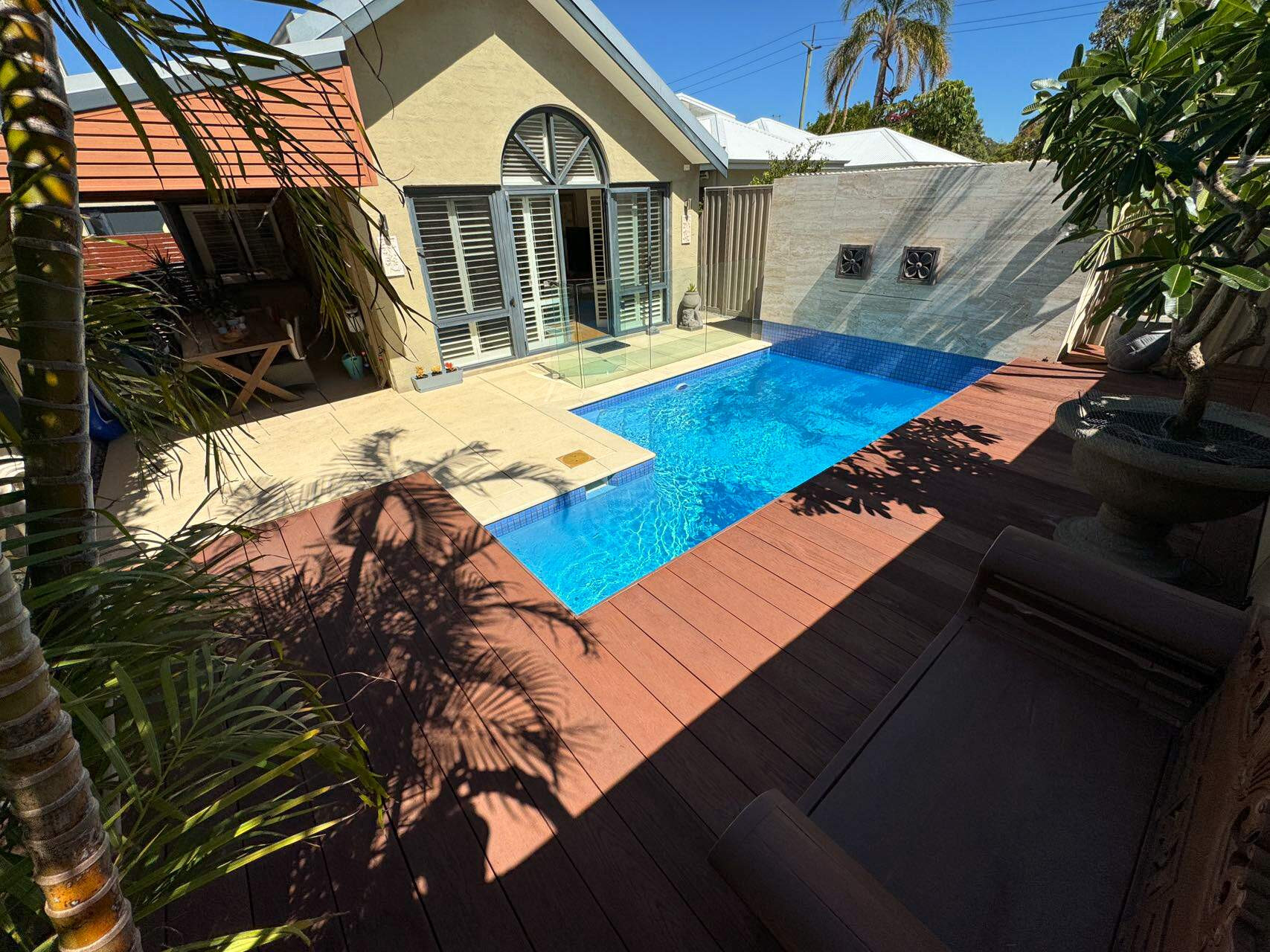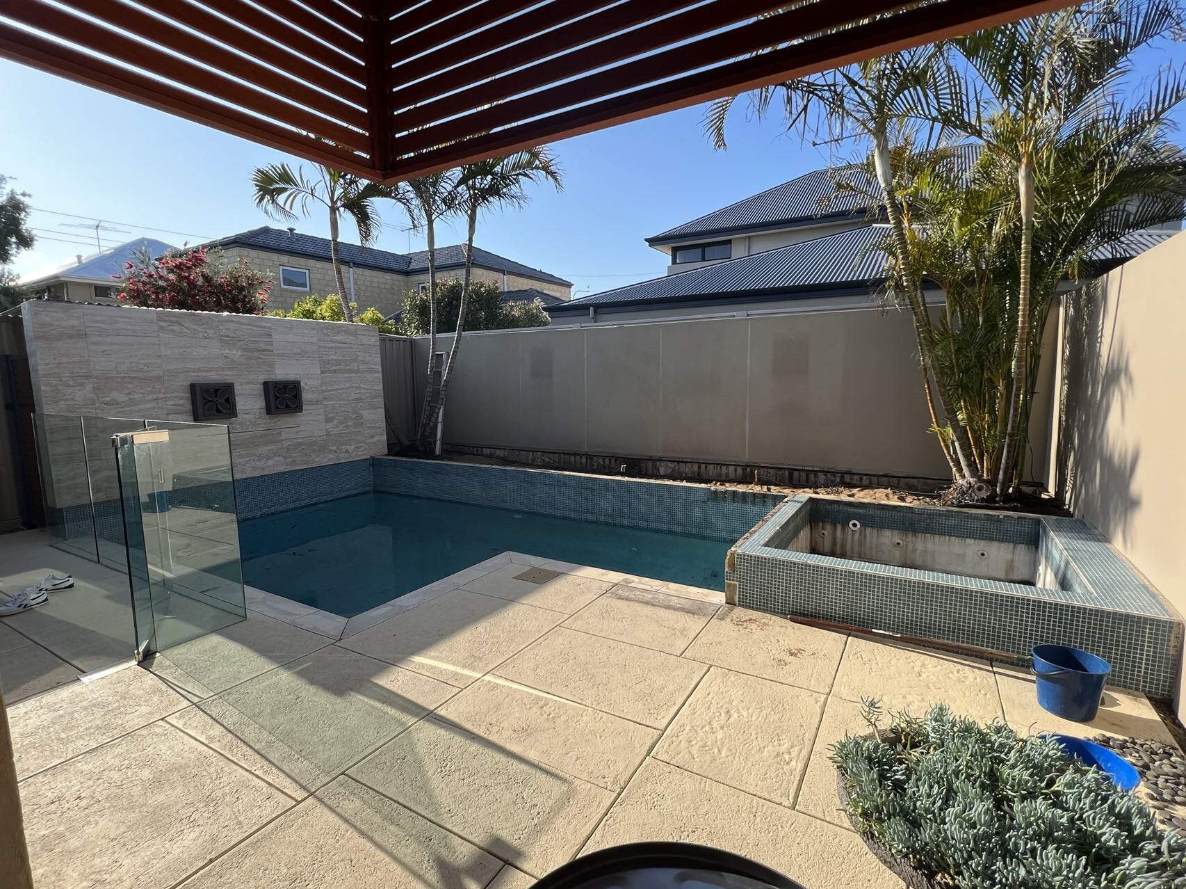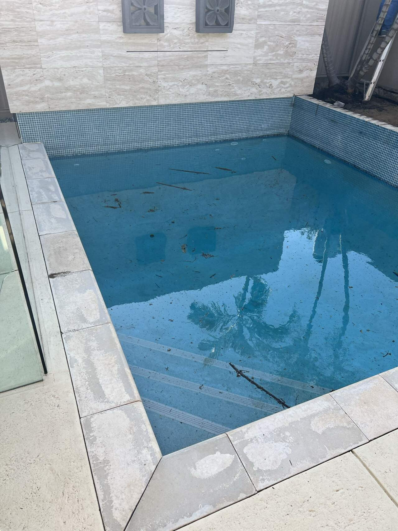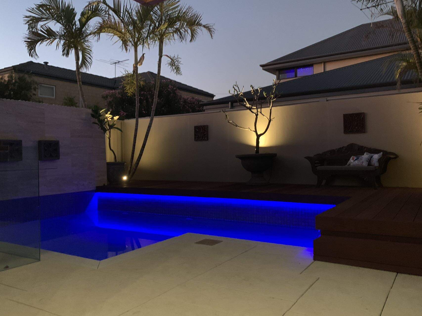 Plunge pool and decking restoration with Fiberglass surfacing and Mosaic waterline tile combination & hidden lighting