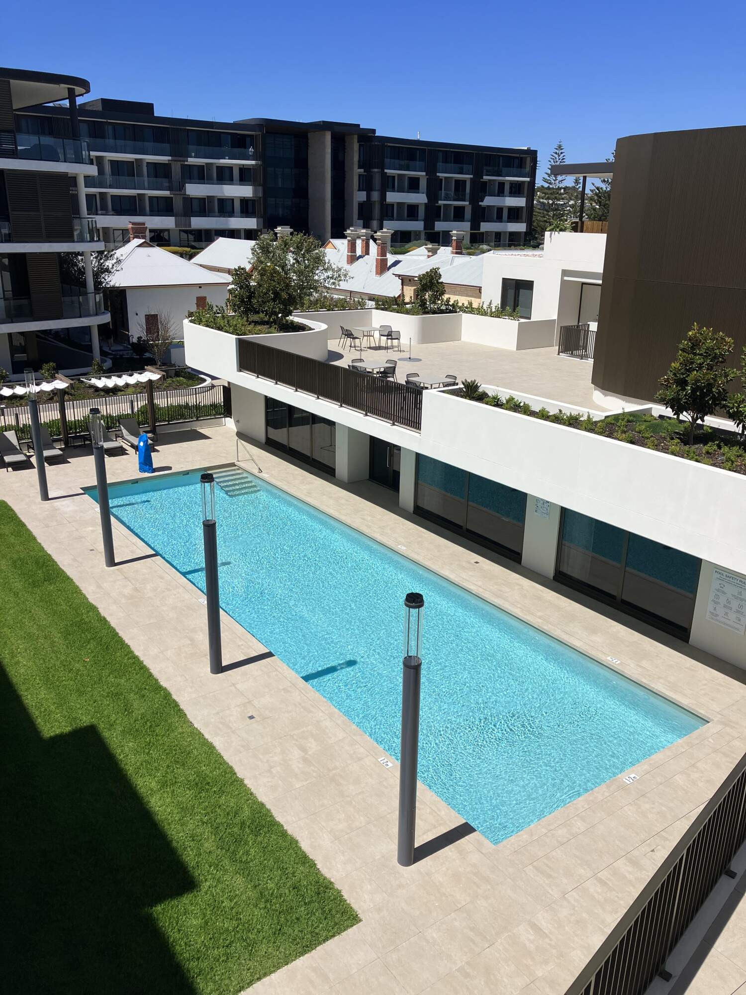 This gorgeous pool allows many people the ability to use it with a chairlift installed. The 1.2m depth and 20m length means it can be used as a walking pool for exercise or a relaxing place to cool off. The automatic hard-top pool cover makes maintaining the pool easier and keeps it clean and warm. Aesthetically complementing the surrounding gardens and buildings, this pool is truly a feature of the apartment complex.