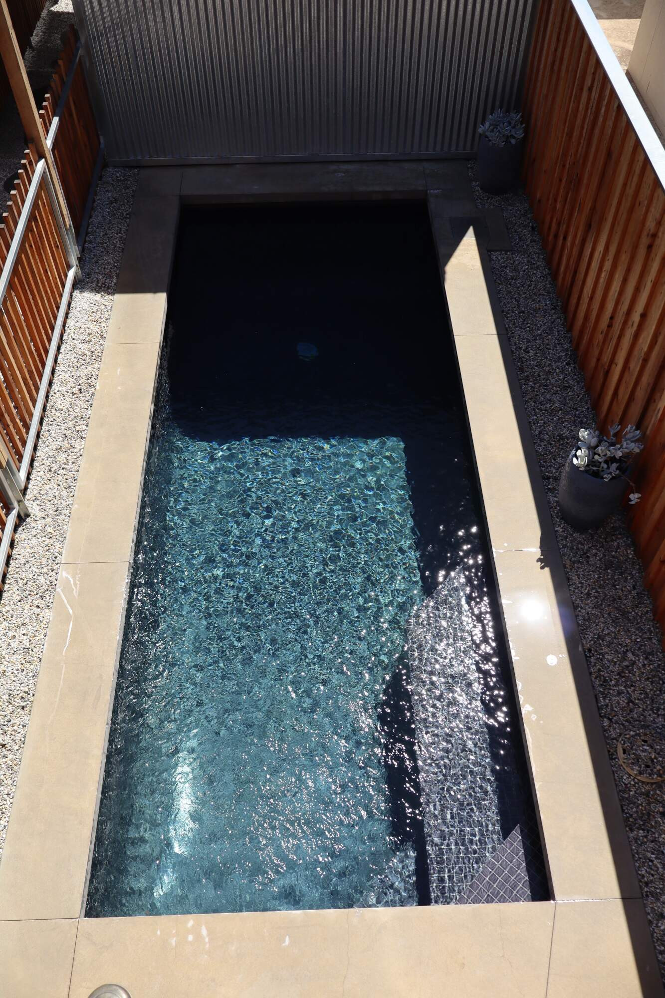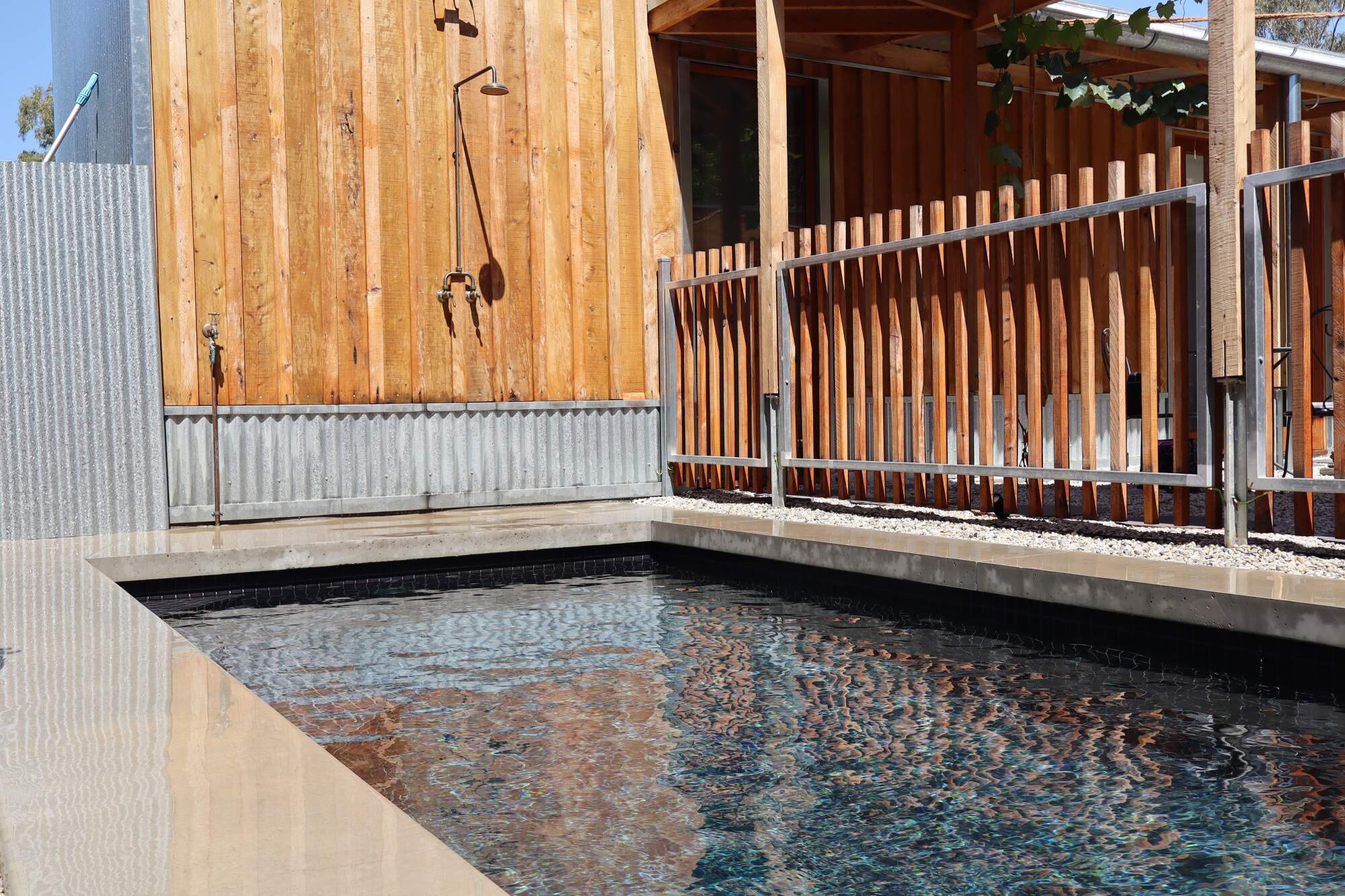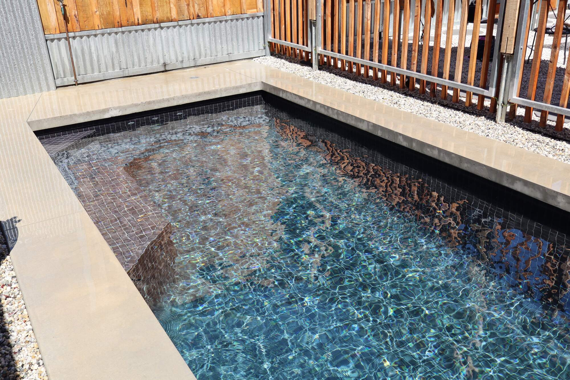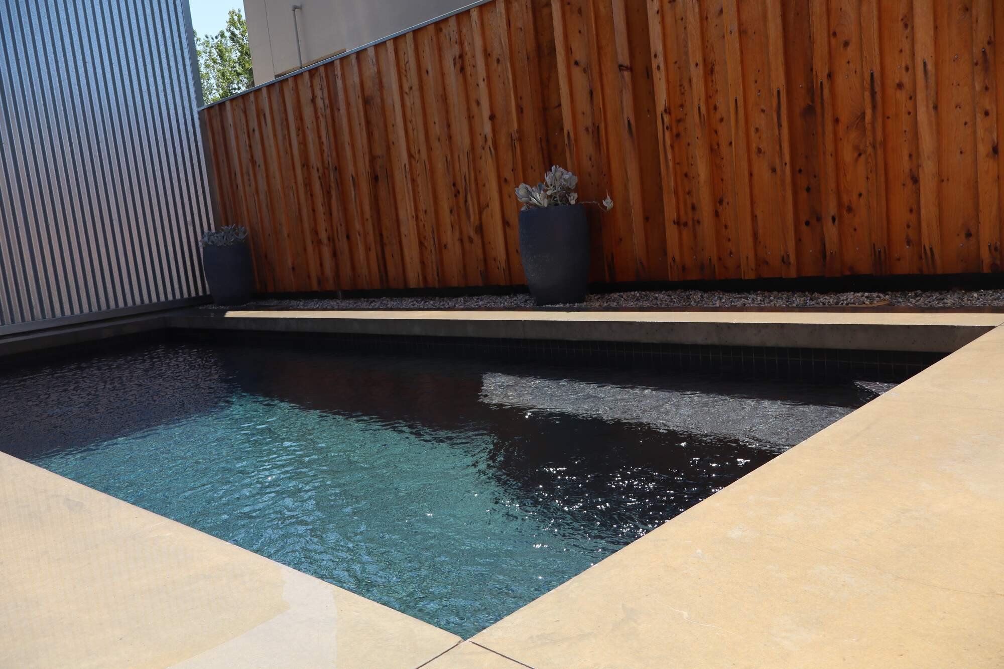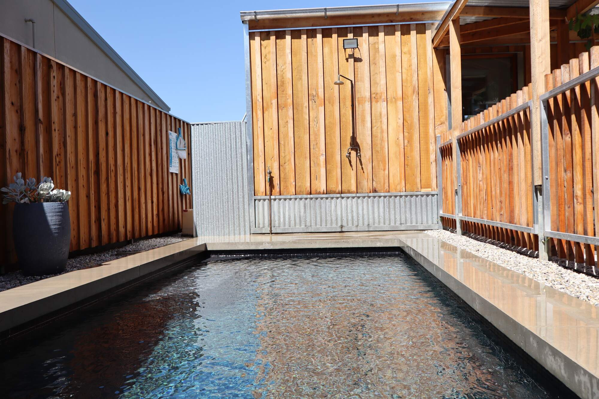 This sleek, courtyard-style concrete pool seamlessly blends clean lines with effortless style, maximising both functionality and aesthetic appeal within a compact space. Thoughtfully designed to complement its earthy surroundings, it features a built-in seating area, minimalist layout, and high-quality finishes that enhance its sense of openness and tranquility. A true oasis, this pool offers the perfect balance of relaxation and sophistication, inviting endless enjoyment.