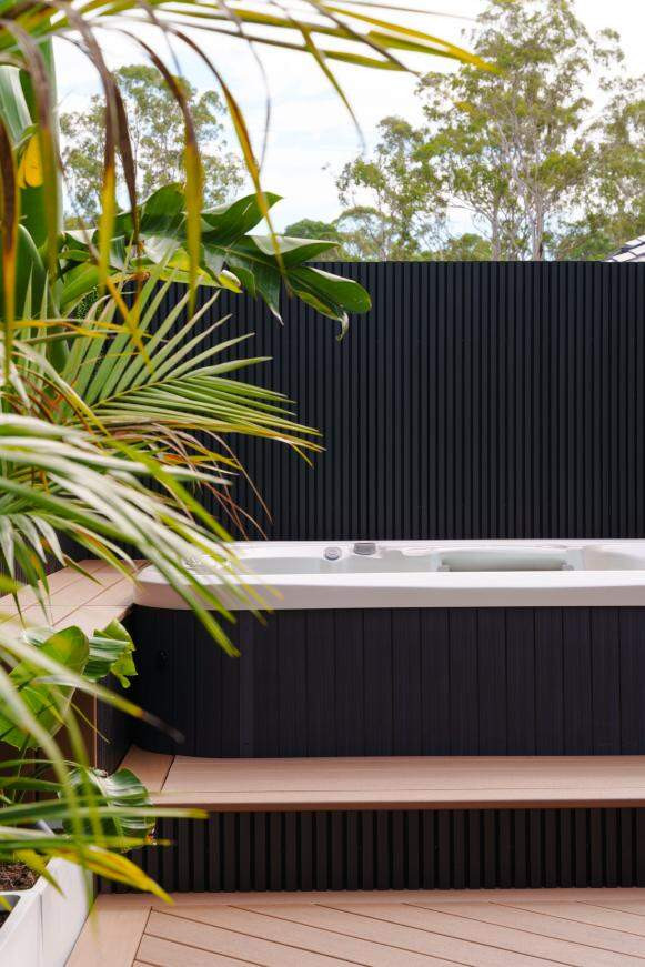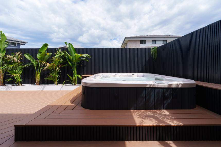 This stunning spa install was part of a complete backyard transformation. The Vortex Nitro spa was partially sunk into the deck for easy access and to match the customer’s sleek, modern aesthetic. With a tight installation space, the deck was prepped first, allowing the spa to be perfectly placed before the final planks and steps were added. The spa colour matched the fencing, creating a seamless look, while tropical plants added a natural, relaxing vibe to this stylish outdoor retreat.