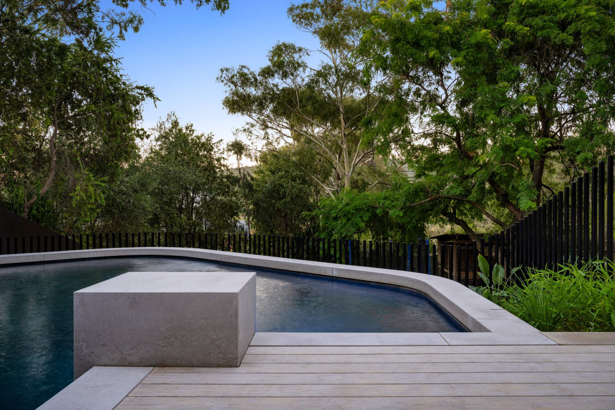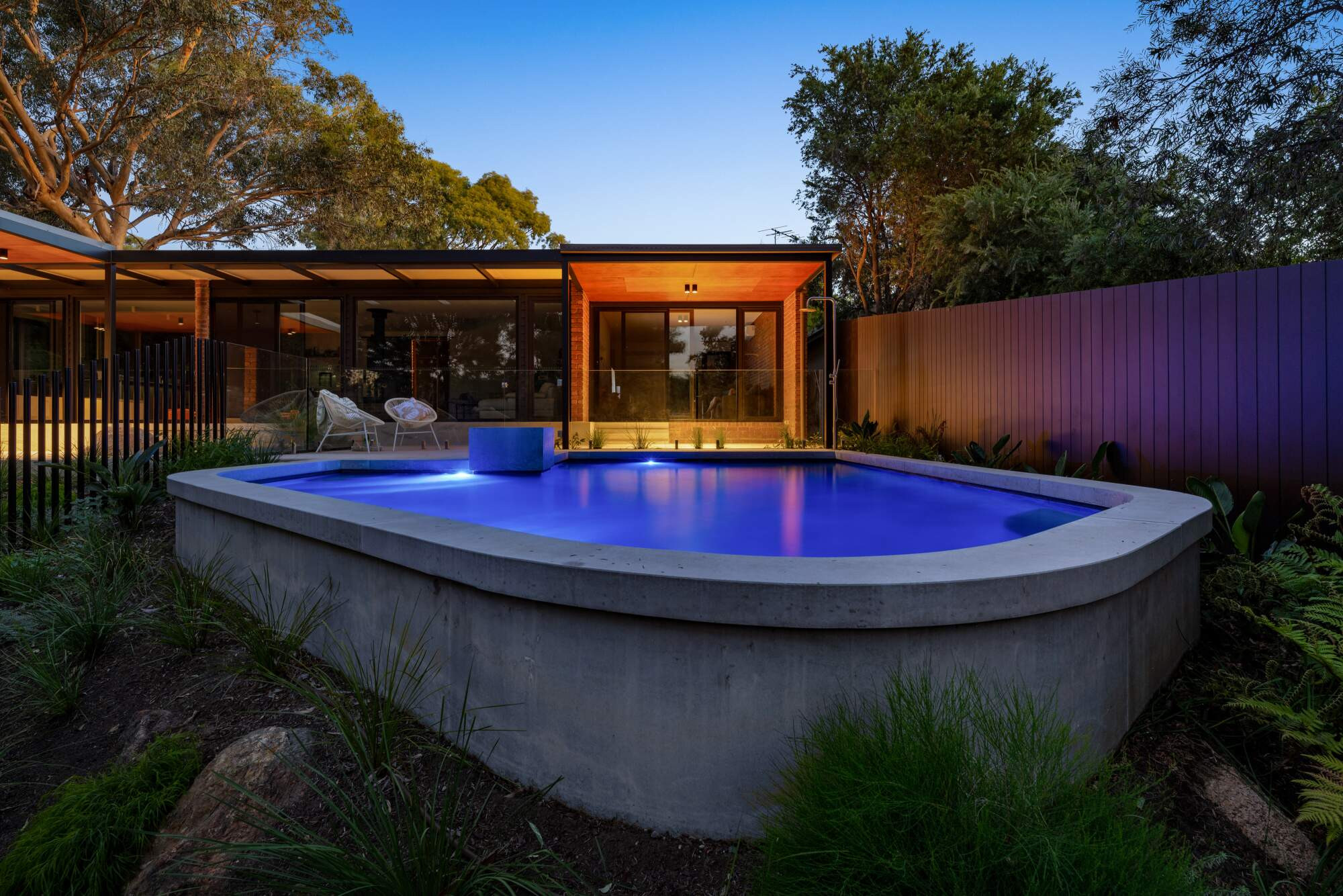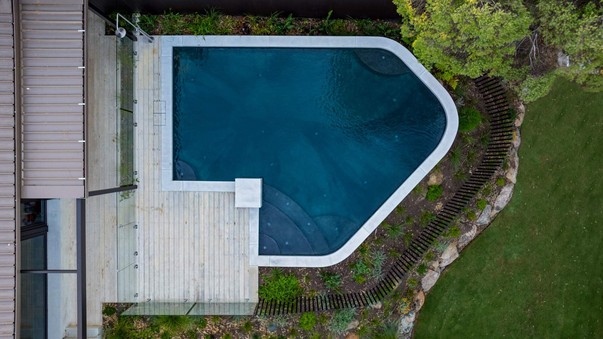 This stunning freeform-style concrete pool seamlessly integrates with its natural surroundings while showcasing sophisticated architectural design. Featuring elegantly curved walls, custom pre-cast concrete coping, and a striking off-form concrete finish, it harmonises with the sloping landscape to create a visually striking and functional outdoor retreat. Thoughtfully designed for both relaxation and recreation, this pool is a testament to innovative craftsmanship, balancing elegance.