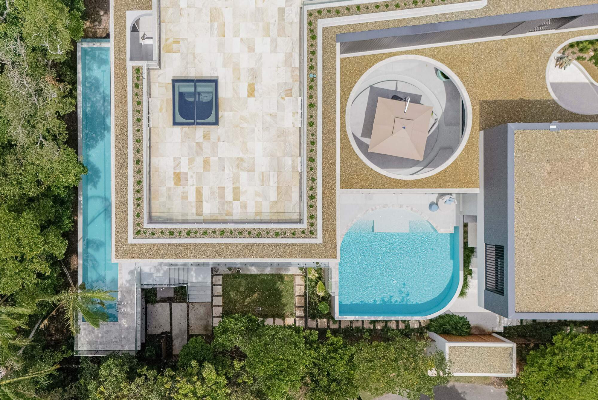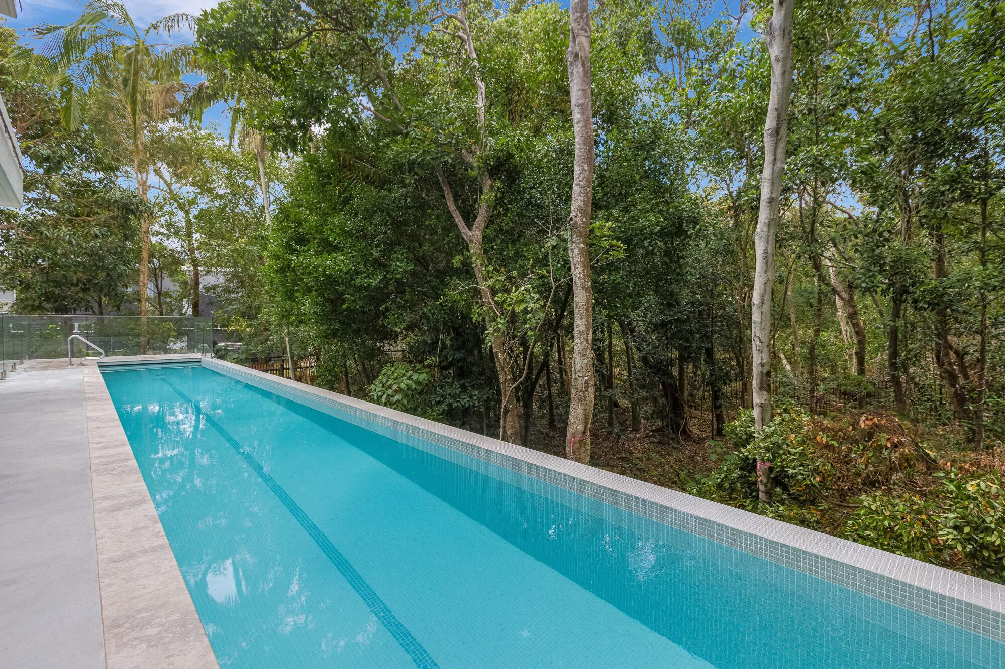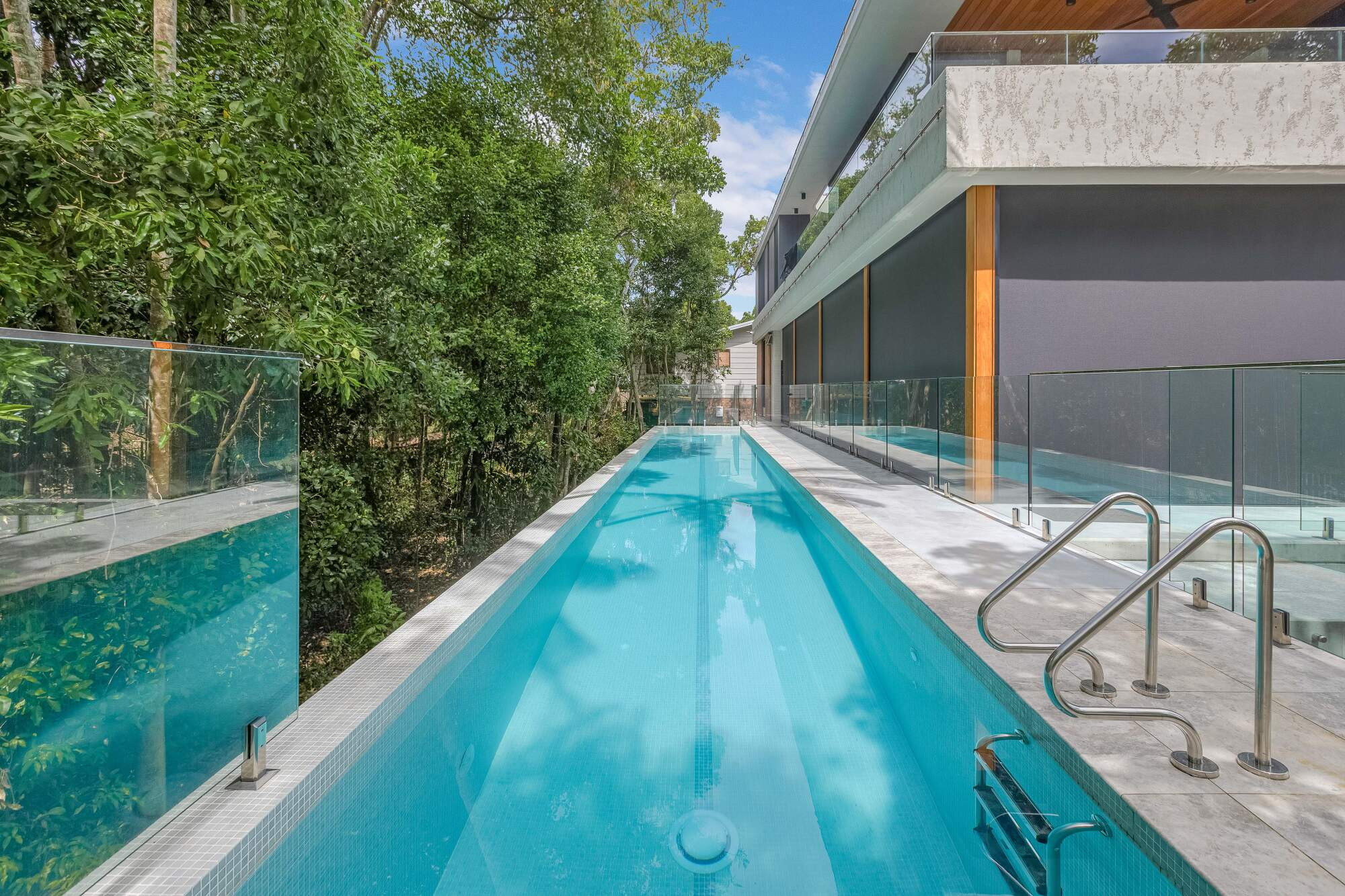 This unique project features two stunning pools and a custom water feature, seamlessly integrated into a luxury property. The first pool offers a serene space for relaxation, while the 18.5m lap pool provides a perfect setting for fitness. Both elevated 2.4m, fully tiled with dry infinity edges, and complemented by an in-floor cleaning system, this exceptional design offers the ultimate blend of luxury, functionality, and natural beauty, creating a one-of-a-kind outdoor retreat.